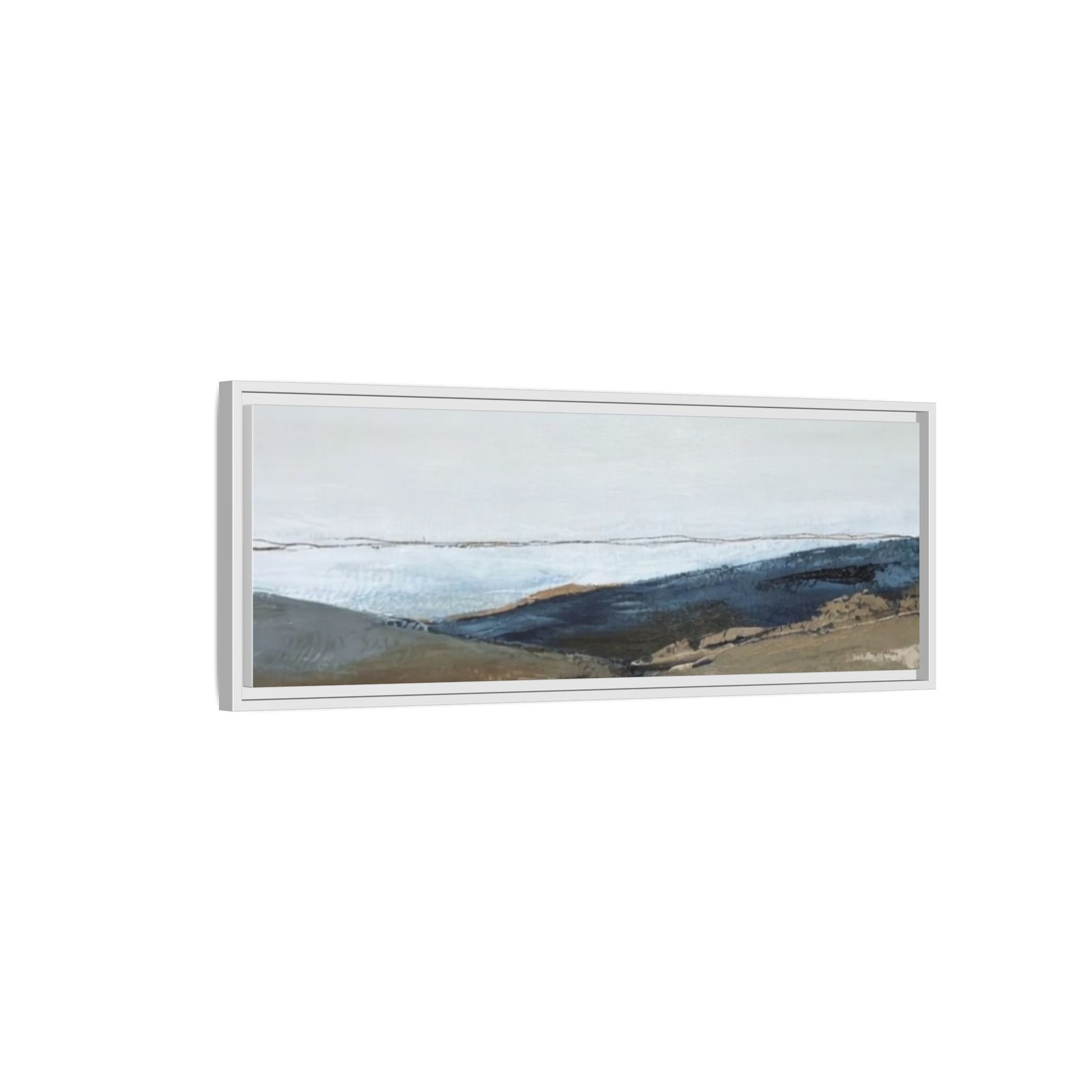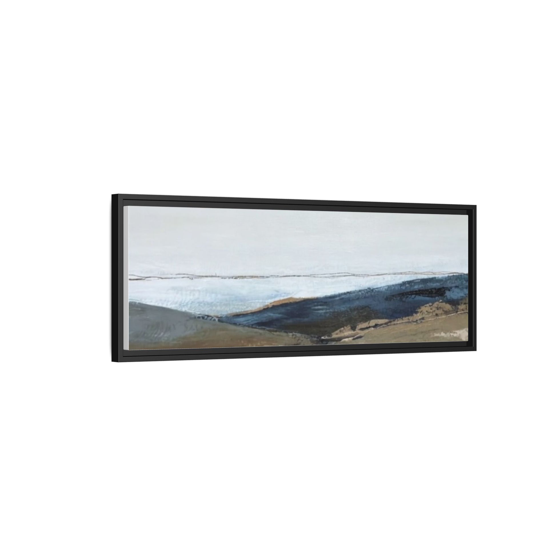 An artful framed matte canvas that brings quiet coastal landscapes into your home. Soft washes of muted blues, warm earth tones and pale sky blend into a soothing horizon—made to sit above a sofa, in a hallway, or as a calming focal point in a bedroom. The subtle texture of the coated cotton-poly canvas holds brushlike detail while the deep-profile pine frame adds architectural presence without shouting for attention. It feels like a slow morning by the water: thoughtful, steady, and quietly curated to complement modern, coastal, and minimalist interiors. Choose a frame color and orientation that fits your wall; sawtooth hardware arrives ready for easy hanging.