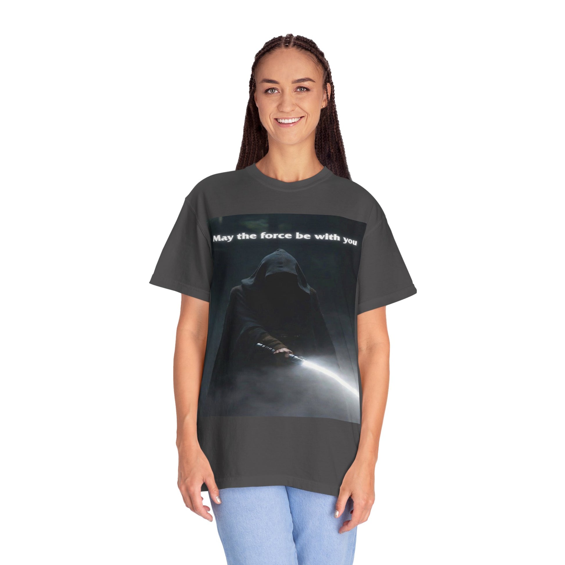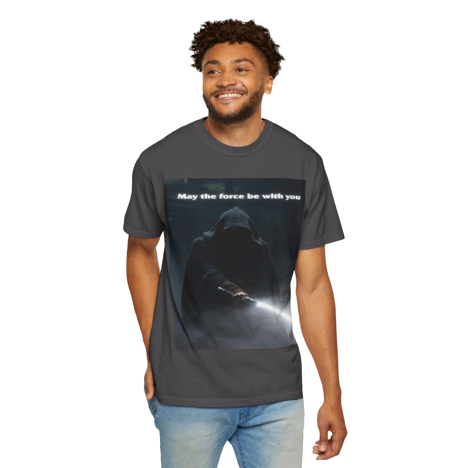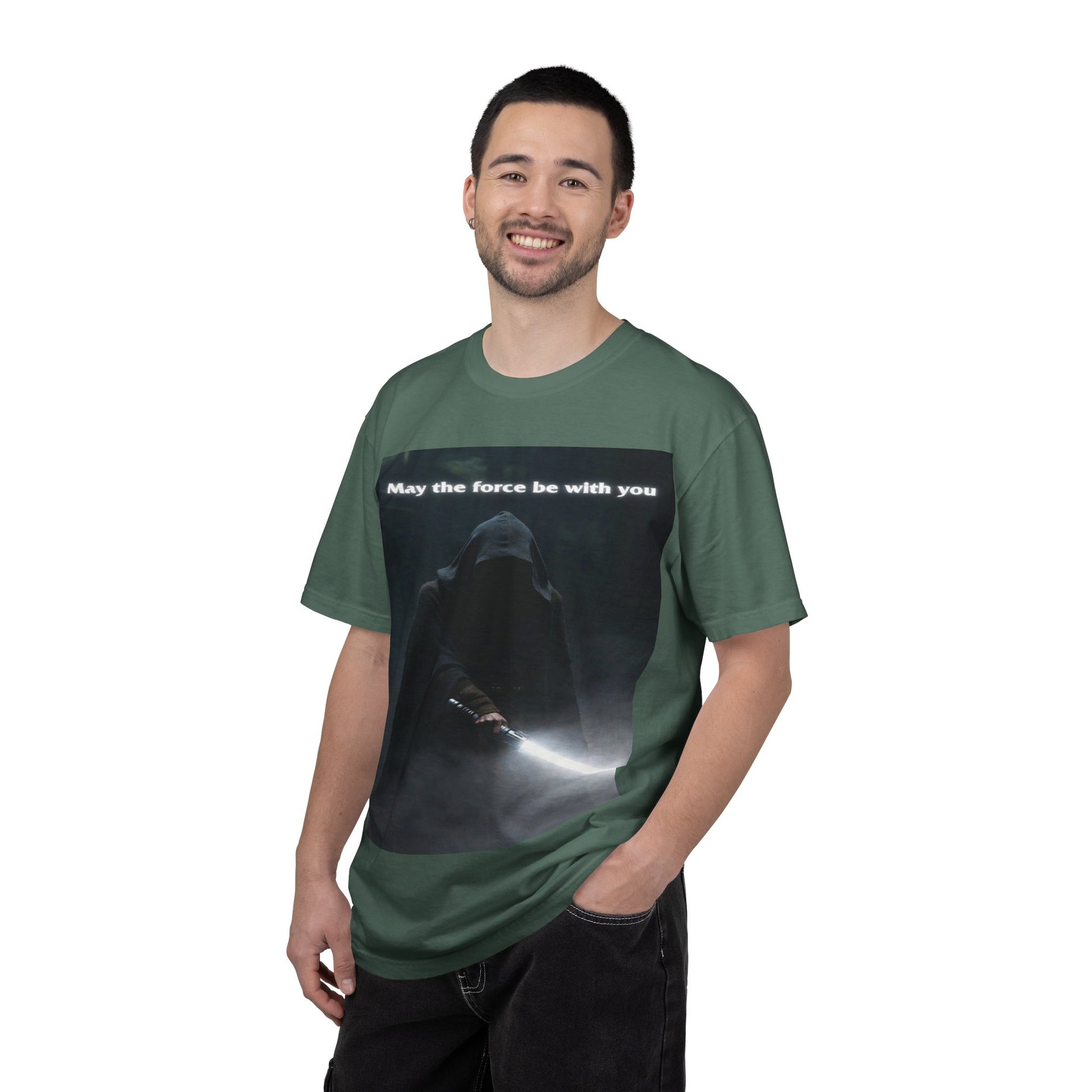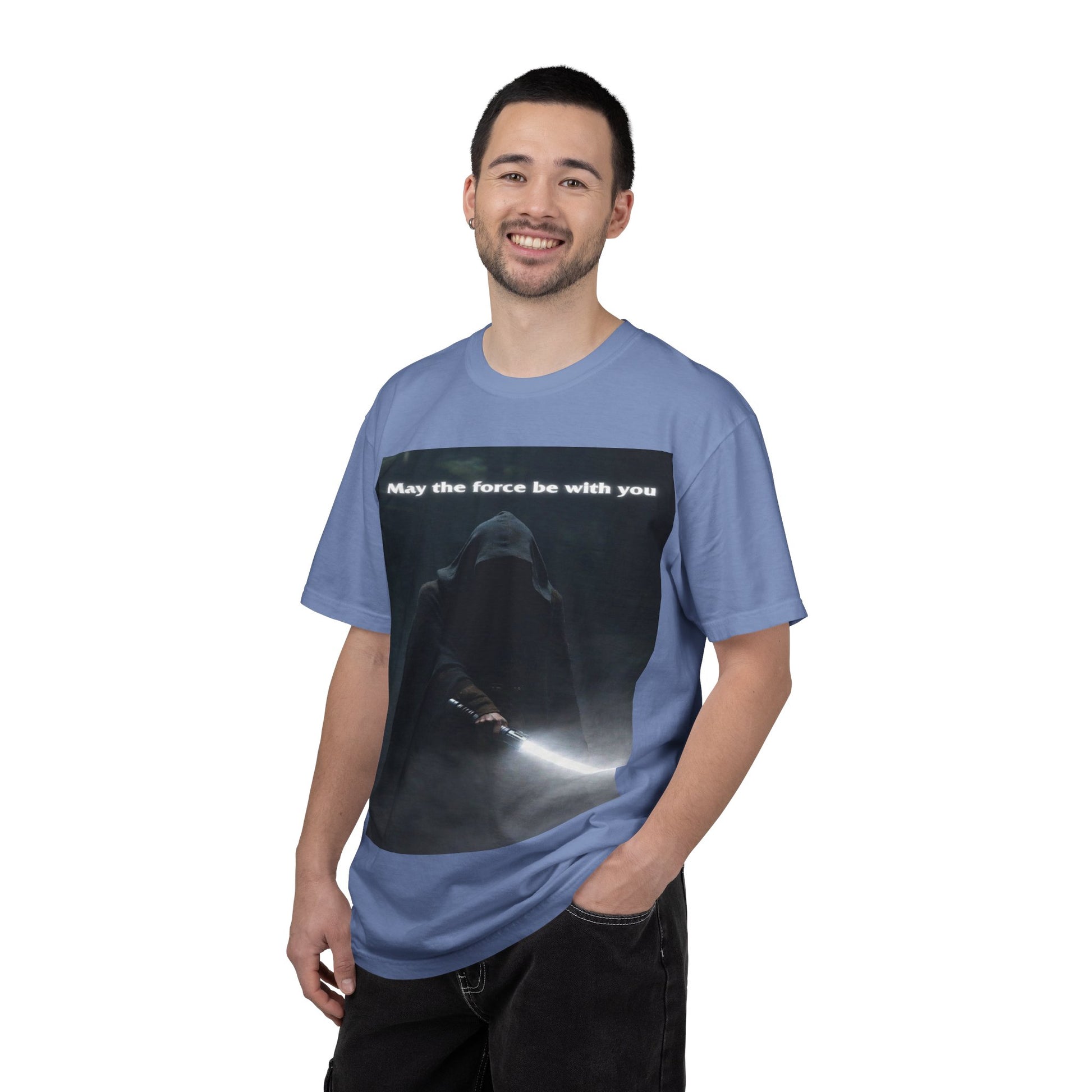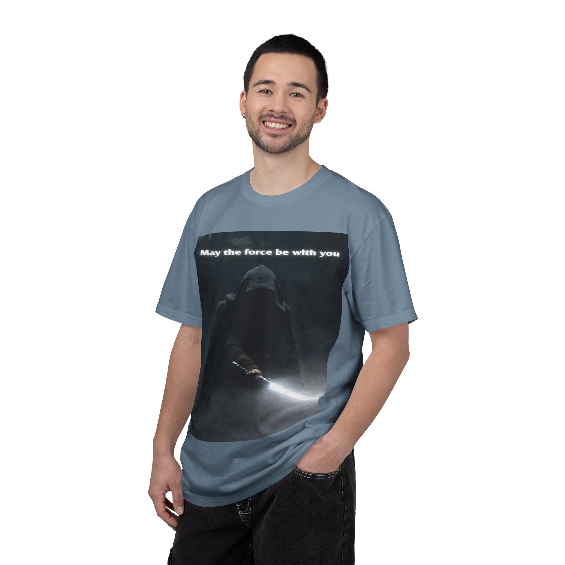This heavyweight, garment-dyed tee brings quiet intensity to everyday wear. A hooded figure emerges from shadow on the chest print, light from a glowing blade cutting through the darkness. The soft, lived-in dye and relaxed cut invite slow mornings, late-night movie marathons, and meetups with other fans who appreciate mood and mystery. Wear it layered under a jacket or alone when you want an understated statement: familiar fandom energy without shouting. The sewn-in label and durable double-needle seams mean it wears like a favorite over years of repeat wears and washes.