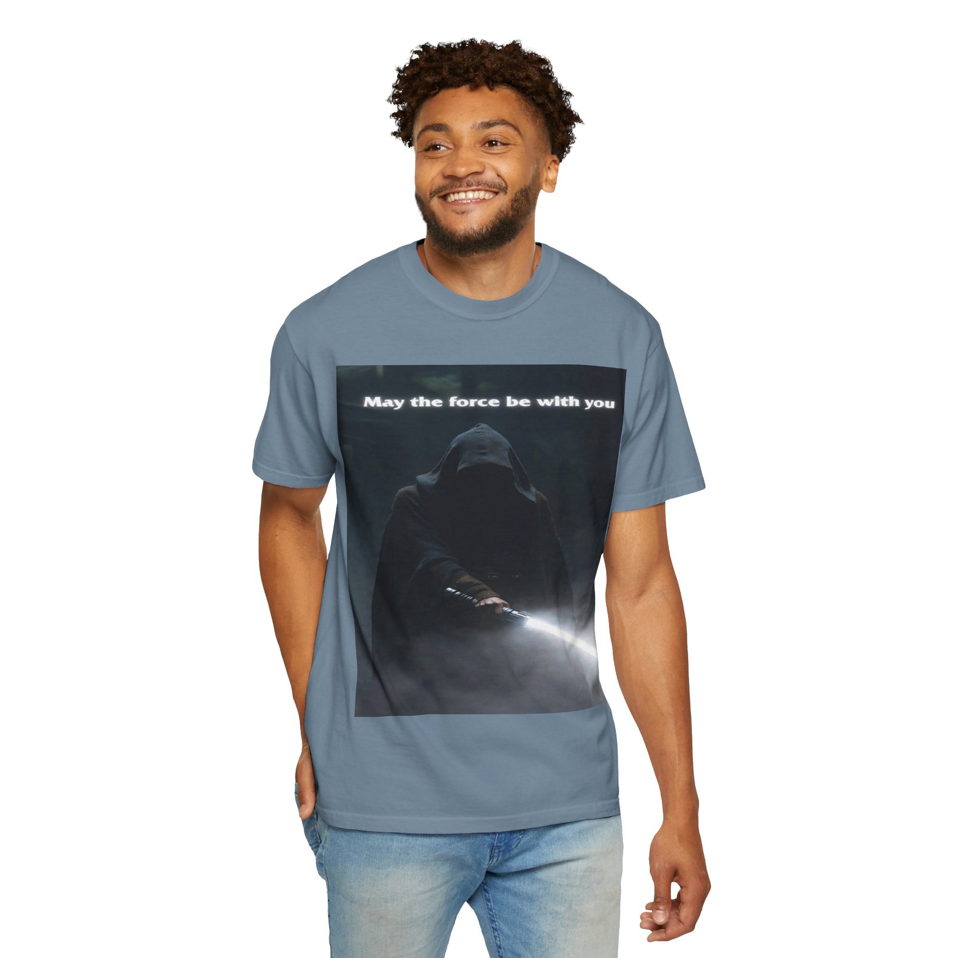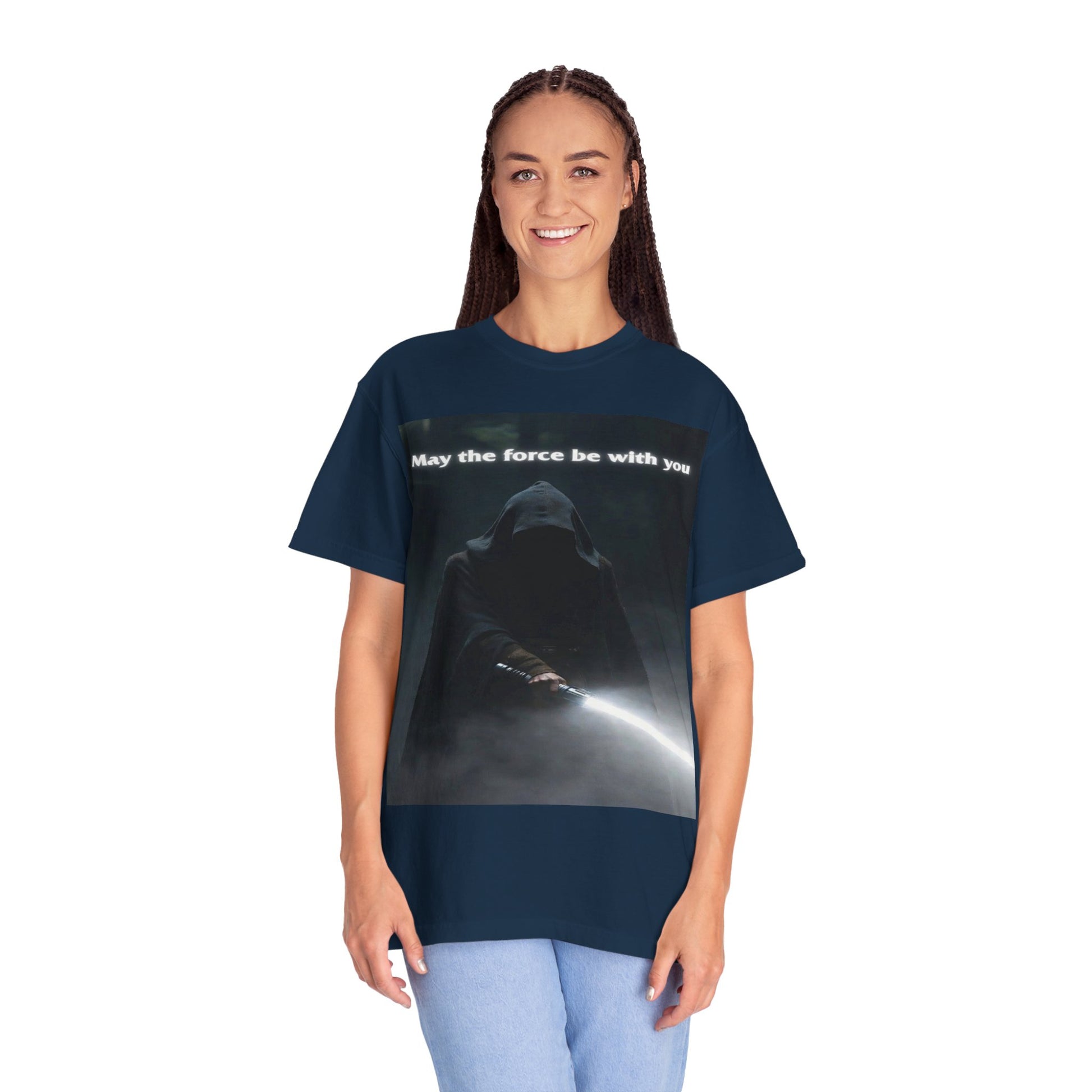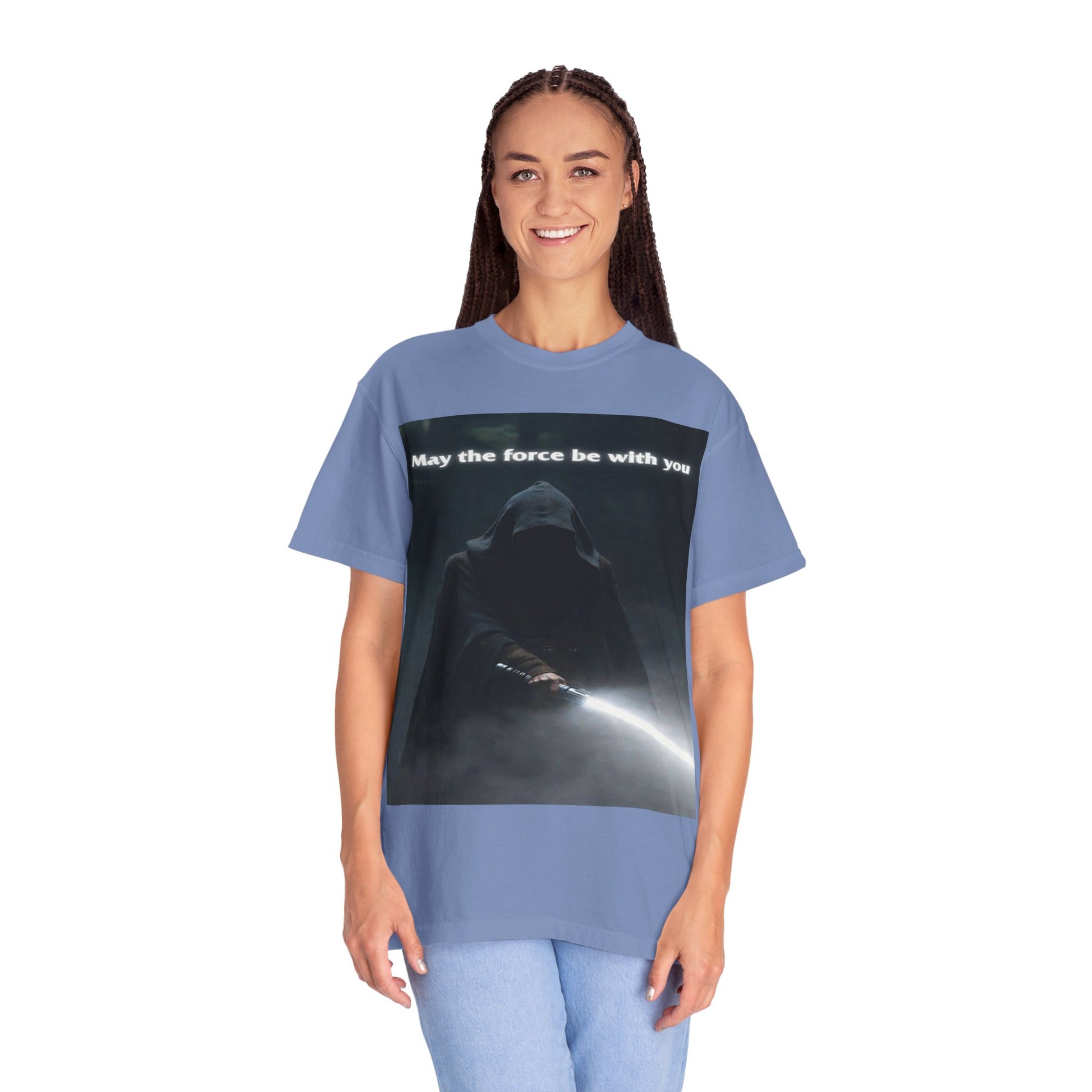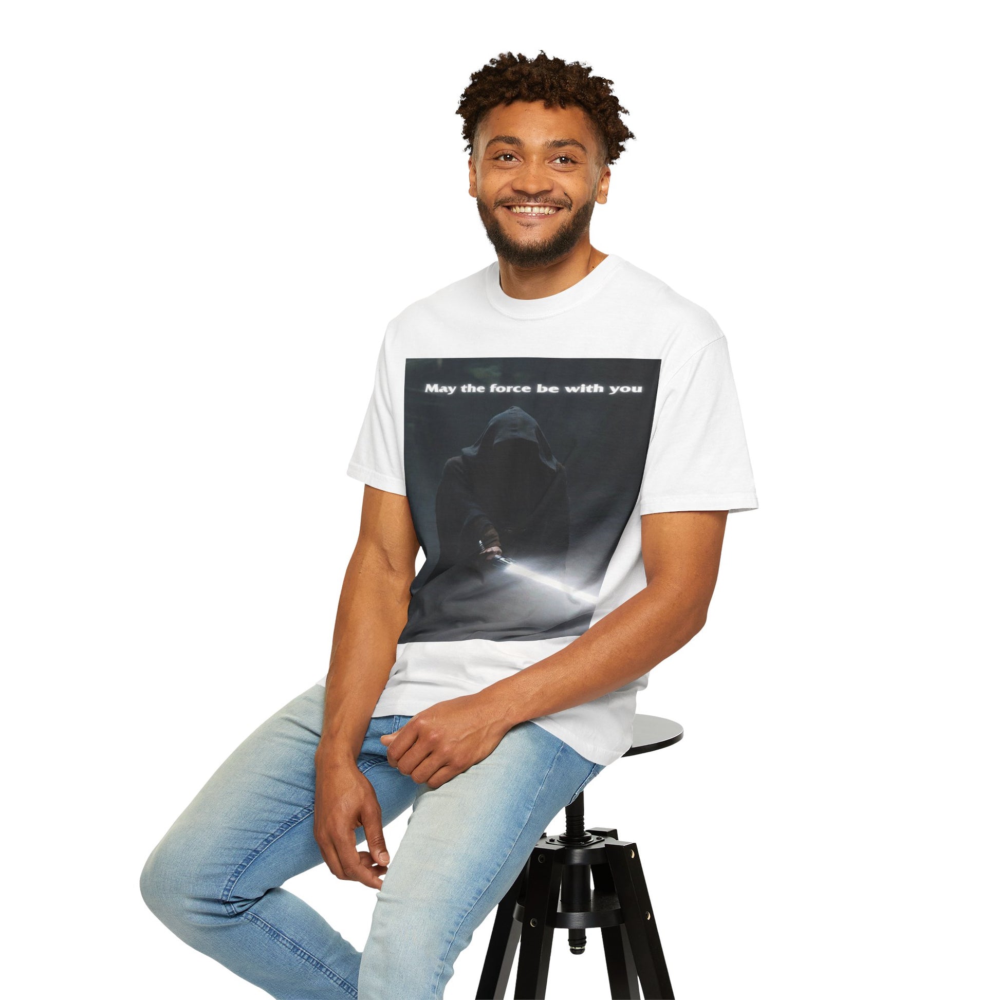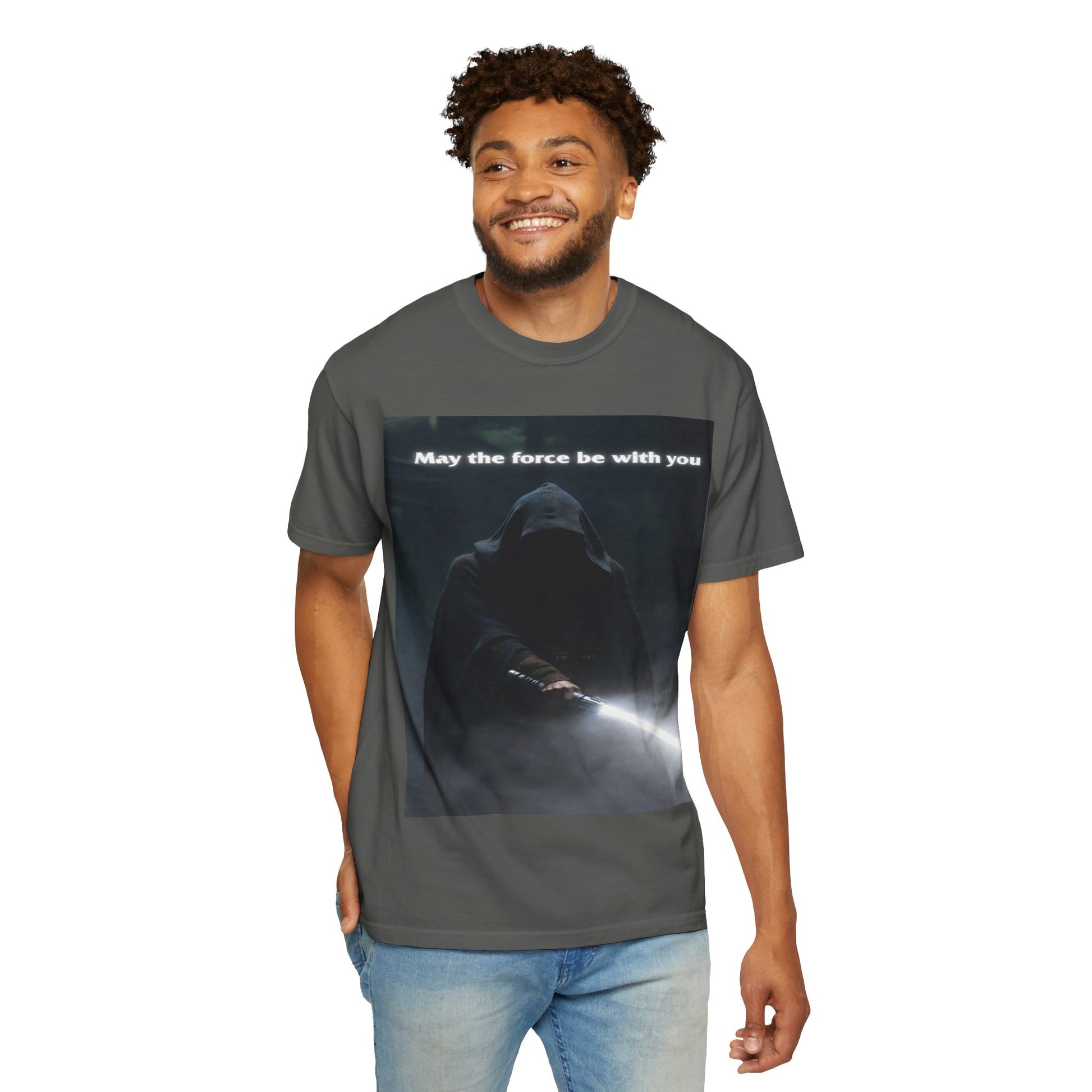 This heavyweight, garment-dyed tee brings quiet intensity to everyday wear. A hooded figure emerges from shadow on the chest print, light from a glowing blade cutting through the darkness. The soft, lived-in dye and relaxed cut invite slow mornings, late-night movie marathons, and meetups with other fans who appreciate mood and mystery. Wear it layered under a jacket or alone when you want an understated statement: familiar fandom energy without shouting. The sewn-in label and durable double-needle seams mean it wears like a favorite over years of repeat wears and washes.