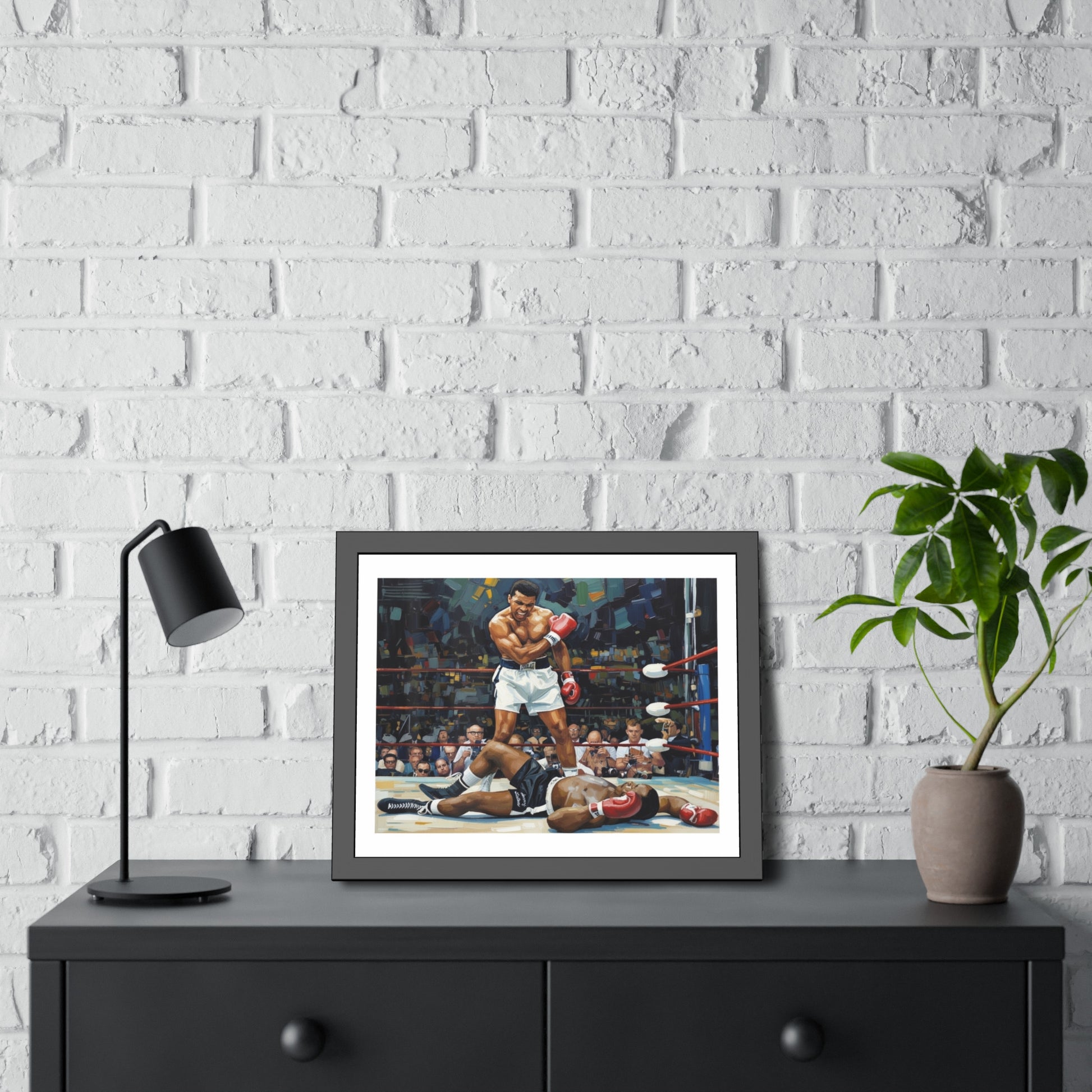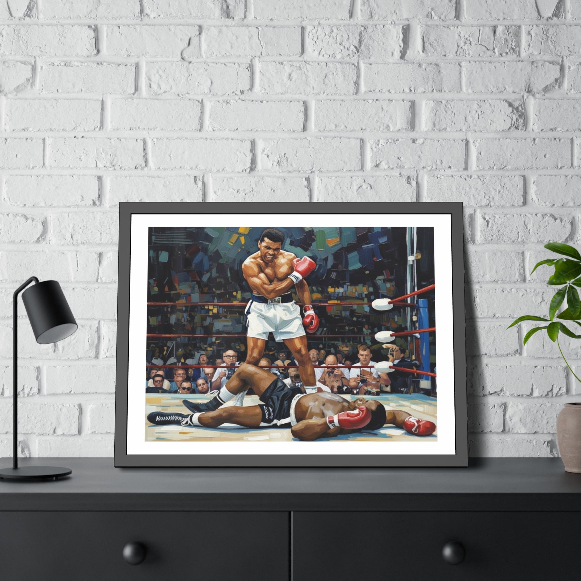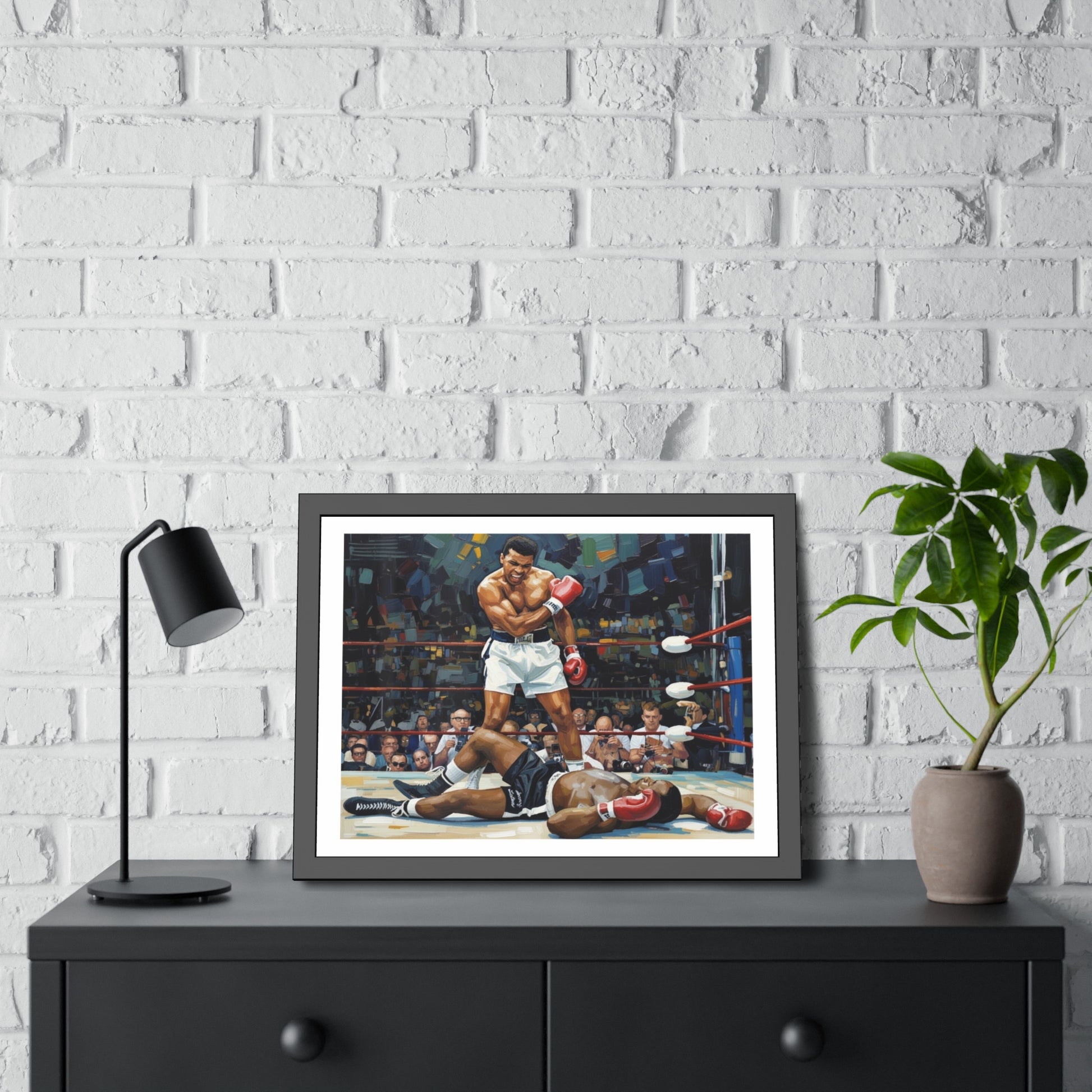 Bring fight-night energy into any room with framed posters that feel like they belong on a champion’s wall. These framed paper posters pair museum-quality printing with a sleek matte black pinewood frame and shatter-proof plexiglass, so your artwork reads bold and clear while staying protected. Choose between fine art paper with a textured, gallery feel or a bright semi-gloss for punchy colors. Each piece ships ready to hang with hardware and rubber bumpers, making installation effortless.