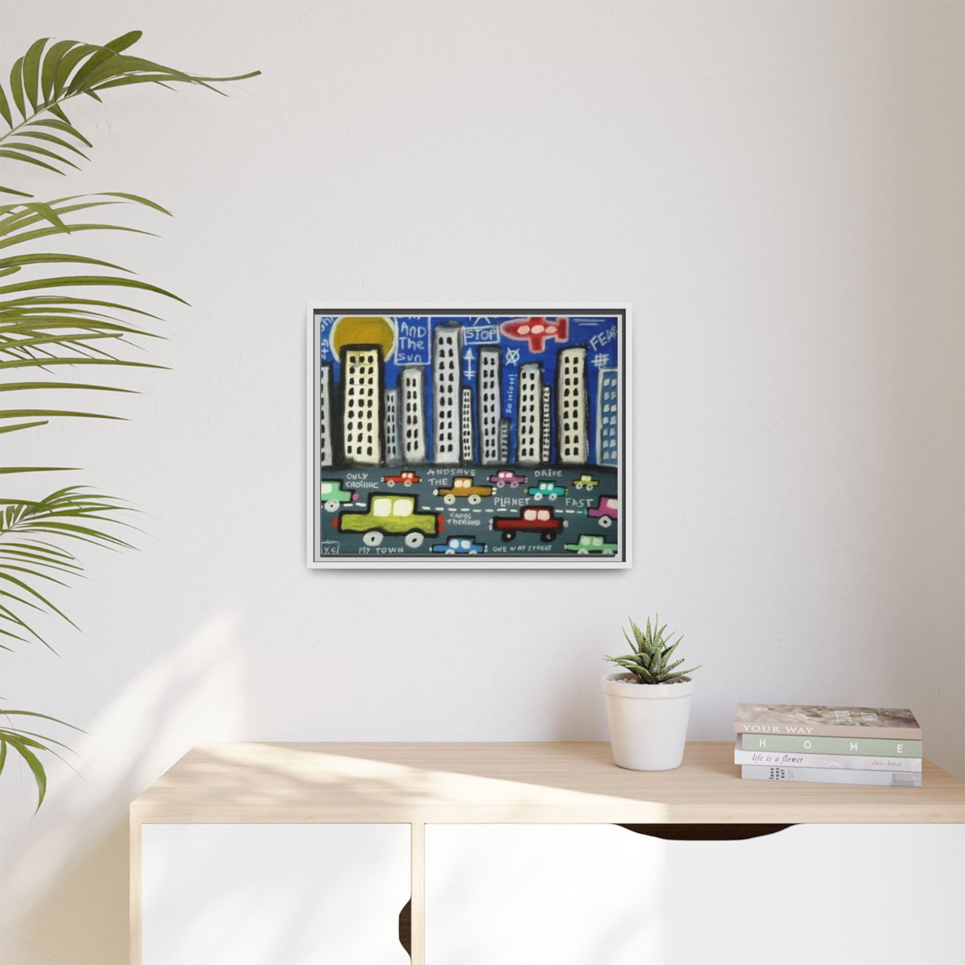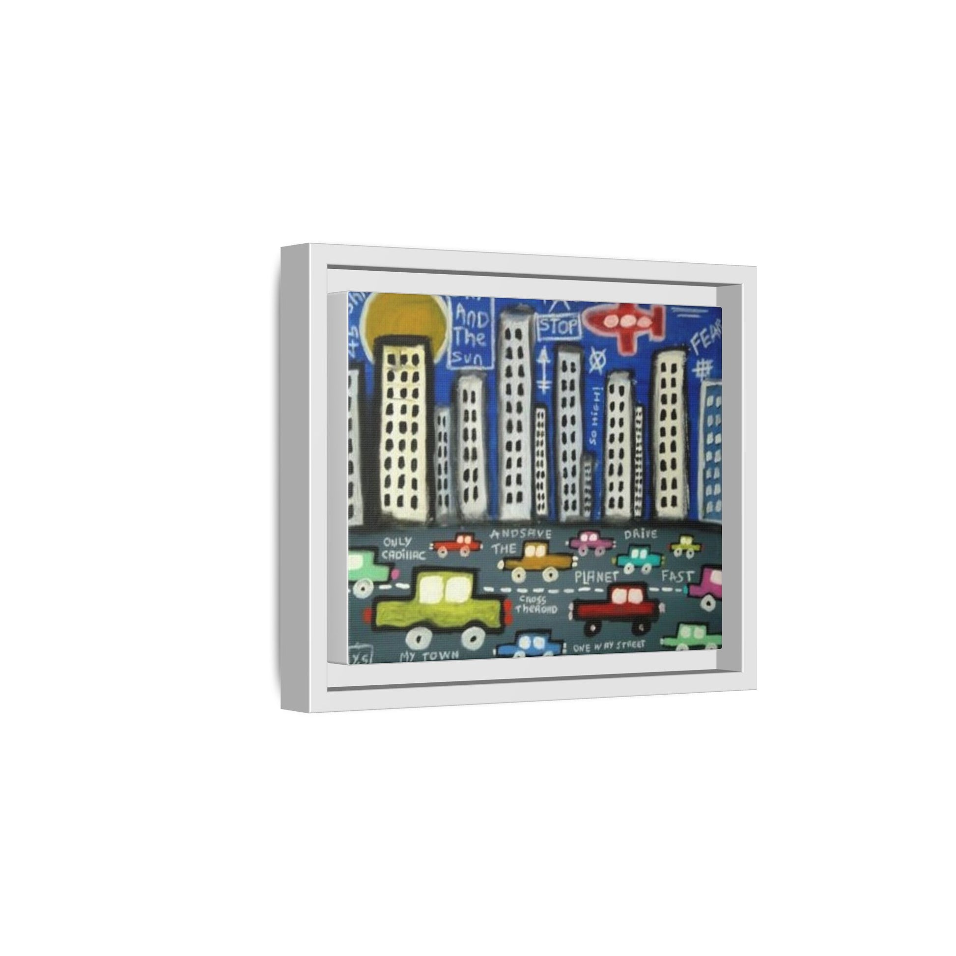 This framed matte canvas brings a playful, urban energy into any room. Hand-drawn skyscrapers rise against a bright sky while colorful cars stream along a busy street below — small, witty phrases peek out between the buildings and lanes, giving the scene a whimsical, street-art feel. The fine matte finish cuts glare so the details and layered textures stay visible from every angle. With a slim pine frame and sturdy, museum-style stretch, this piece arrives ready to hang and quietly transforms a hallway, studio, or living room wall into a vibrant city snapshot that sparks conversation.