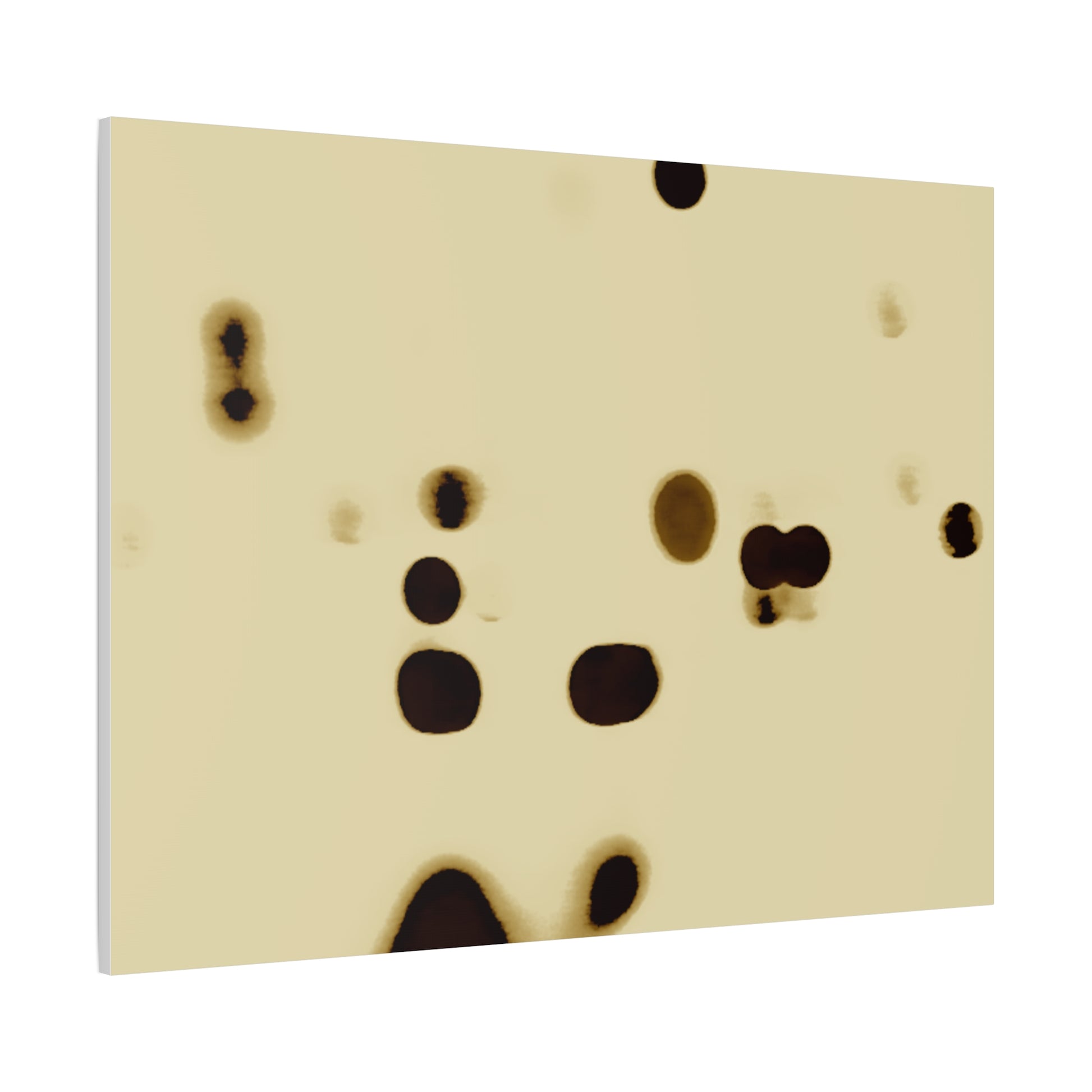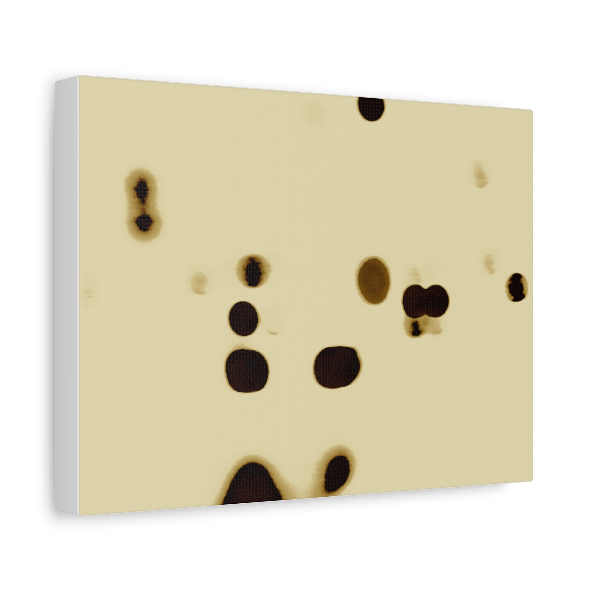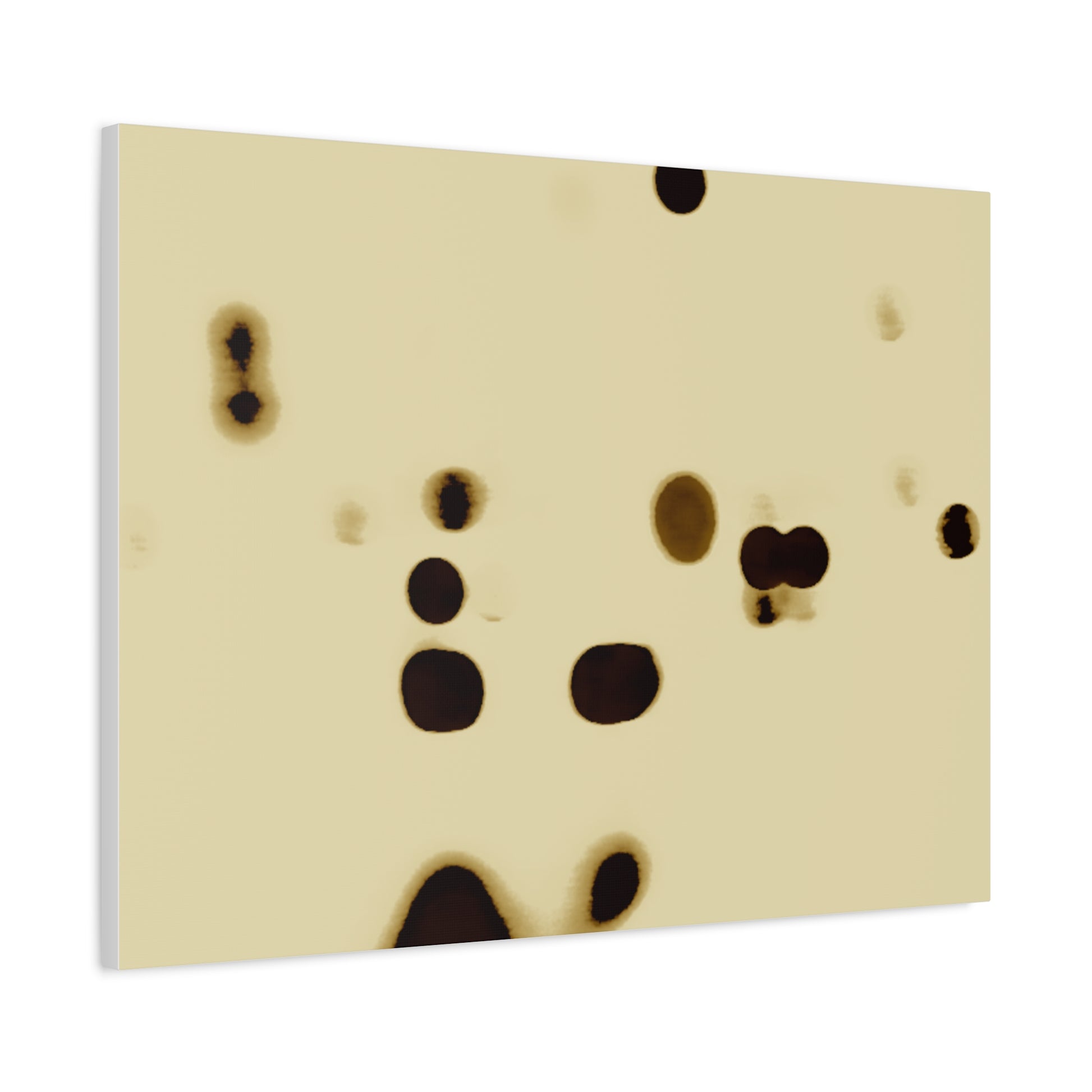 A minimalist stretched matte canvas that brings quiet, contemplative energy to a room. Soft cream tones are interrupted by organic, ink-like dots and blots that feel both accidental and deliberate — like fragments of a memory or the residue of a slow, meditative process. The lightly textured cotton-poly canvas sits on a slim 1.25" pine stretcher and is printed with low-VOC, UL-certified Greenguard Gold latex inks for vivid, long-lasting color. Rubber corner dots and included back-hanging hardware keep the piece steady and easy to hang. Works well as a subtle focal point above a sofa, in a calm reading nook, or grouped with other abstract pieces to build a curated wall composition.