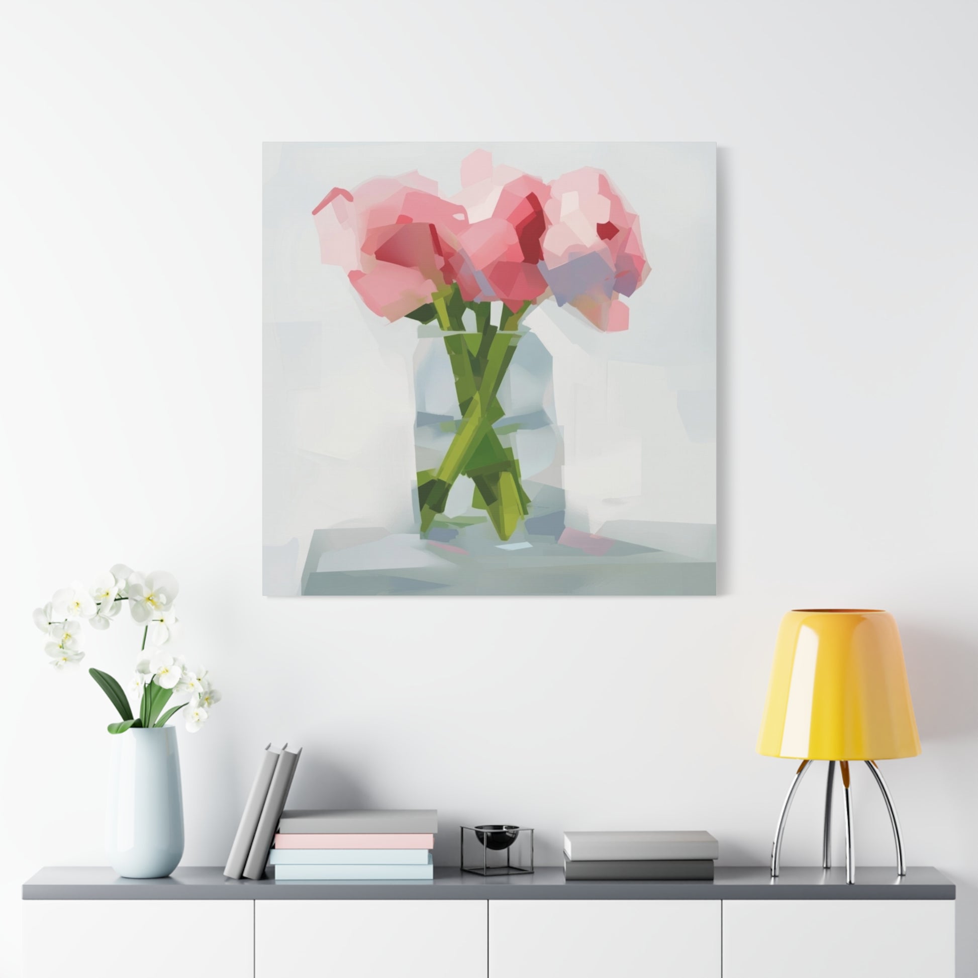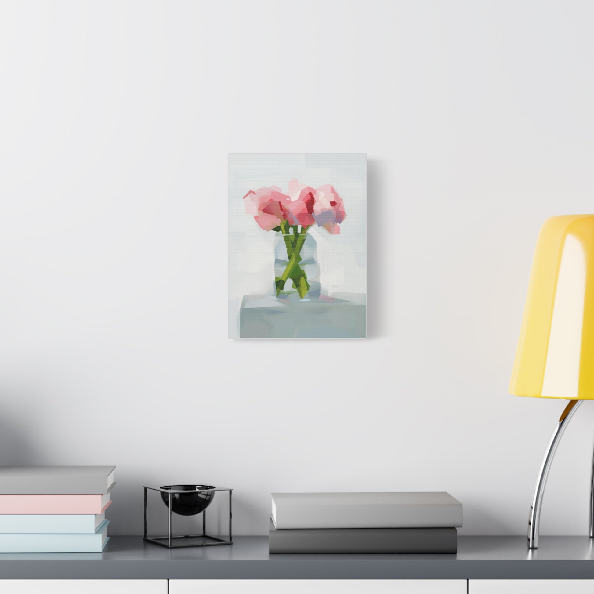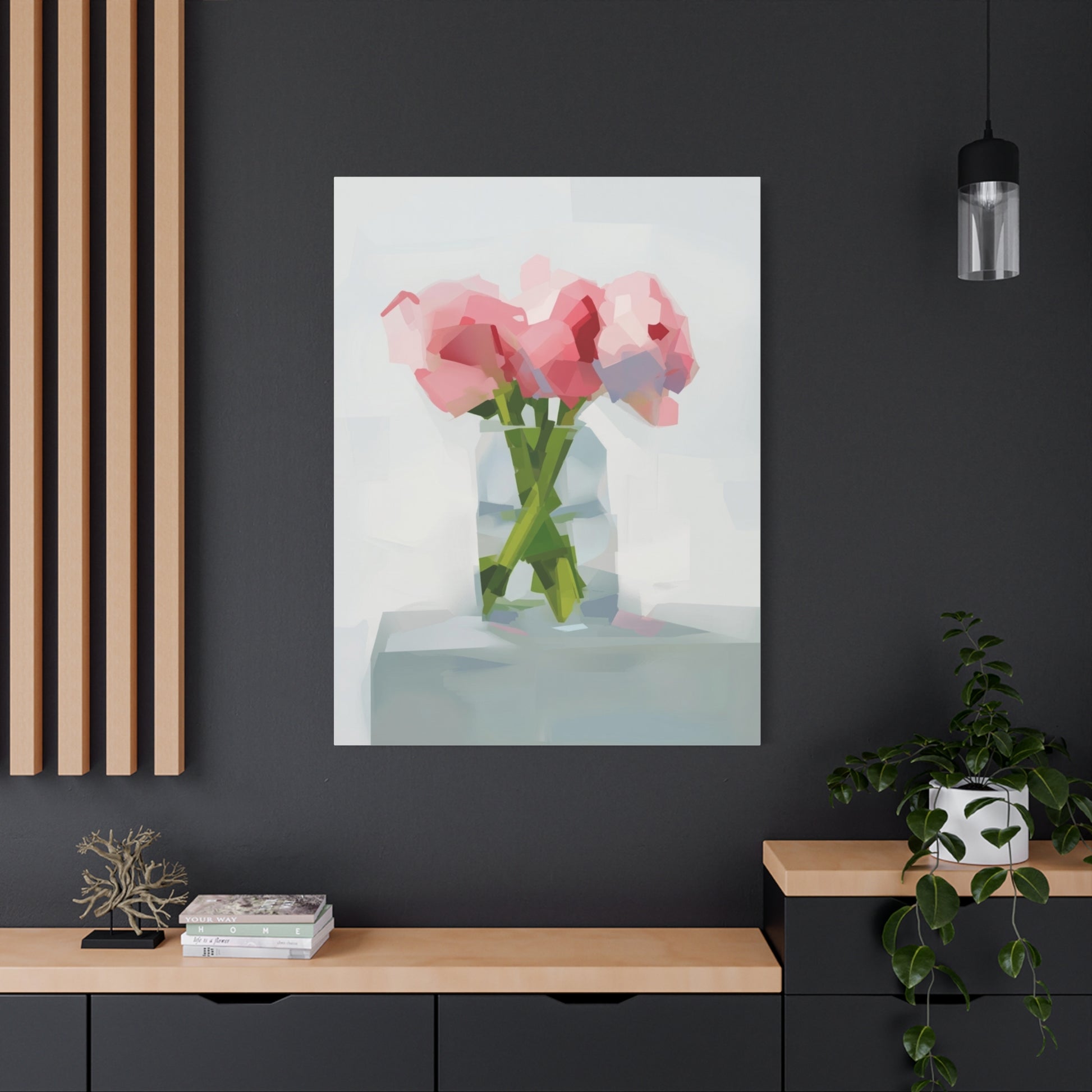 Soft, painterly peonies captured in soft pinks and minty greens, printed on a matte stretched canvas that reads like a quiet still life. The subtle brush-like polygons and airy background give this piece a gentle, modern impressionism — the kind of artwork that calms a kitchen wall, brightens a bedside nook, or anchors a small living room vignette. Stretched on a slim 1.25" pine frame with finished sides, it arrives ready to hang with protective rubber corner dots to keep it steady. Colors are produced with UL-certified Greenguard Gold latex inks for vivid, non-toxic color that tucks easily into sustainable-minded homes.