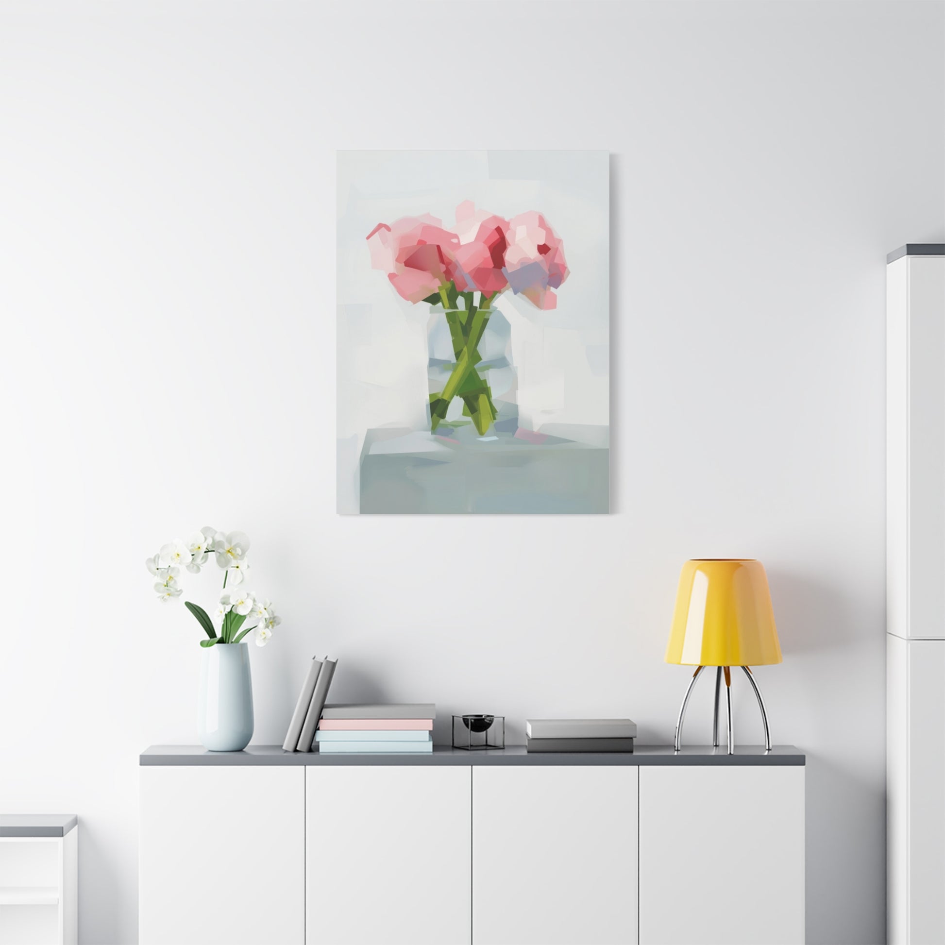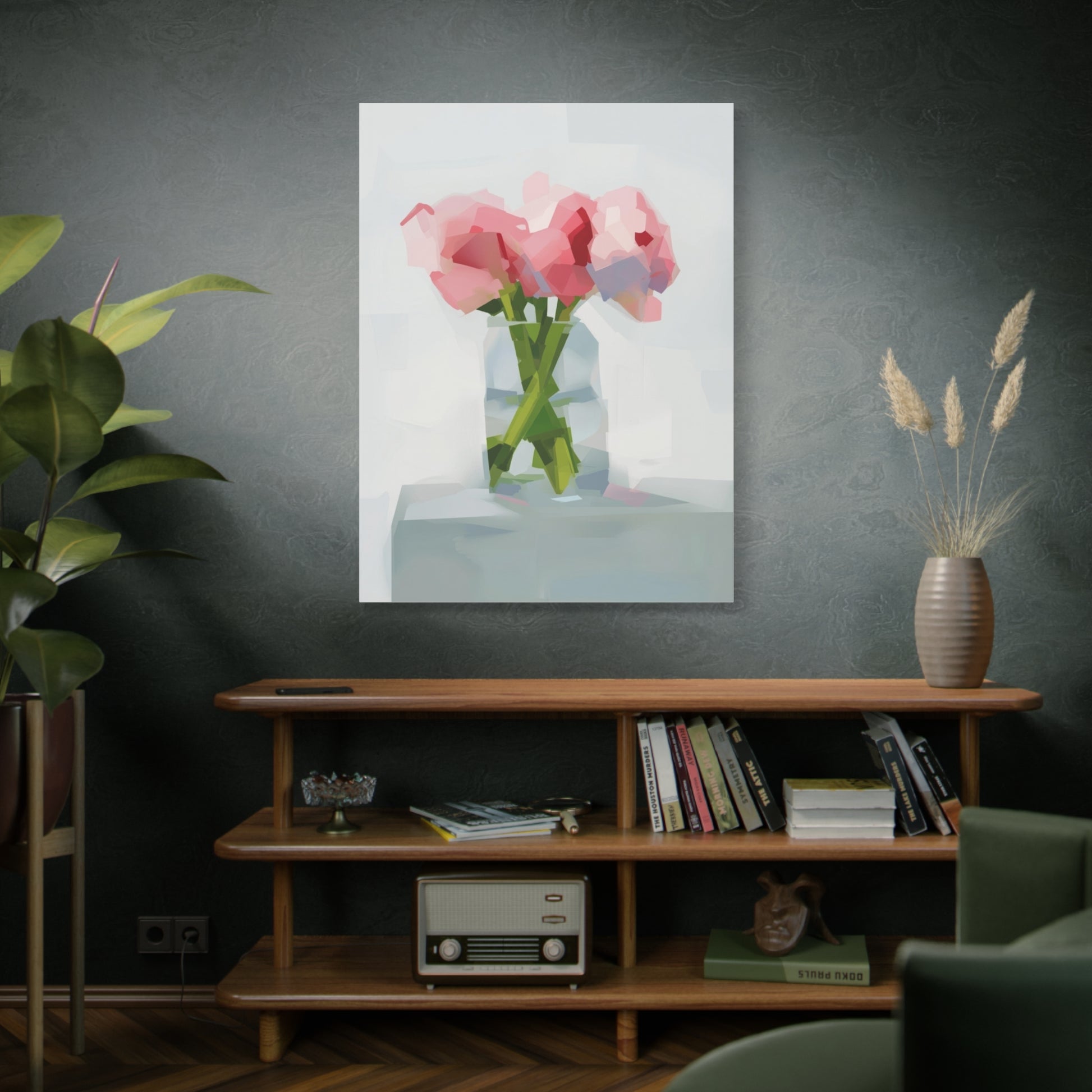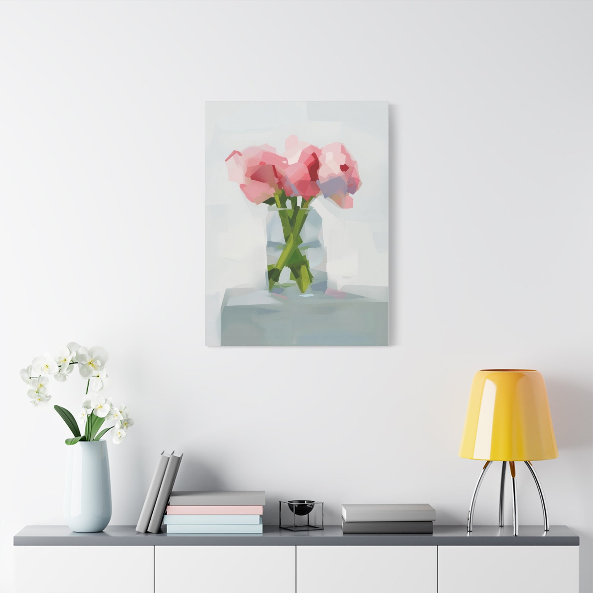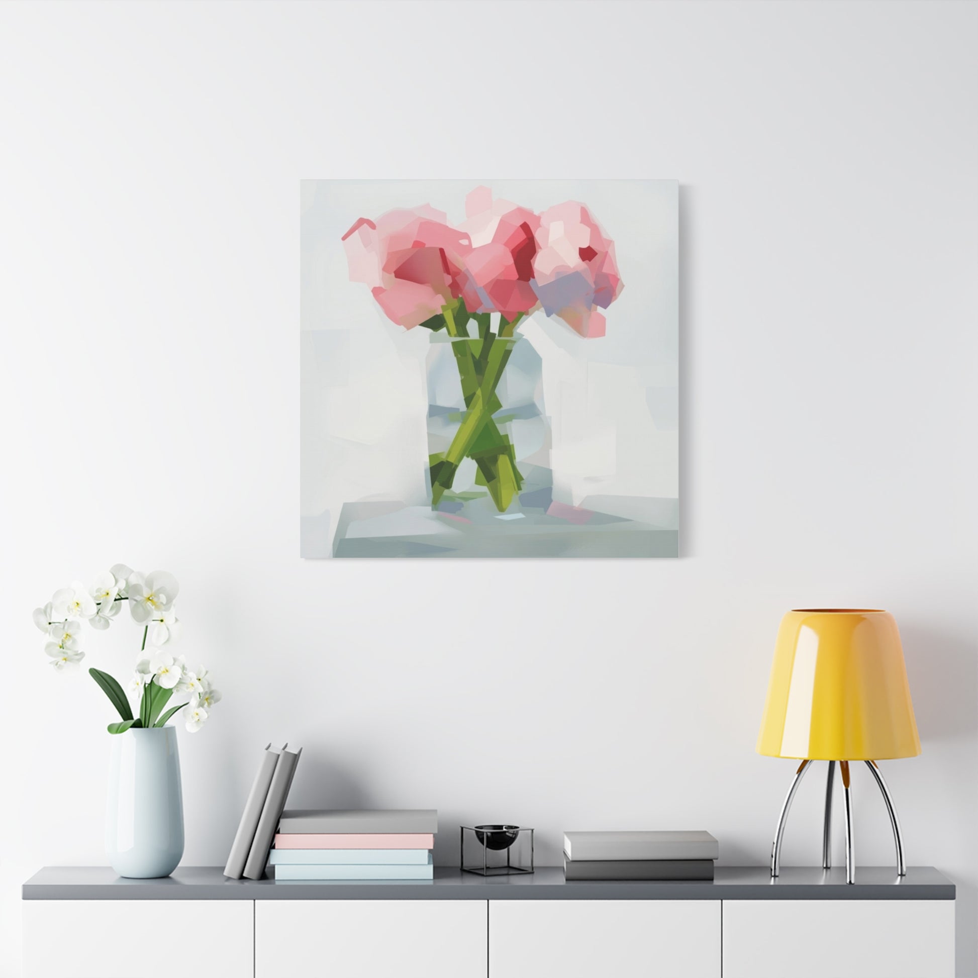 Soft, painterly peonies captured in soft pinks and minty greens, printed on a matte stretched canvas that reads like a quiet still life. The subtle brush-like polygons and airy background give this piece a gentle, modern impressionism — the kind of artwork that calms a kitchen wall, brightens a bedside nook, or anchors a small living room vignette. Stretched on a slim 1.25" pine frame with finished sides, it arrives ready to hang with protective rubber corner dots to keep it steady. Colors are produced with UL-certified Greenguard Gold latex inks for vivid, non-toxic color that tucks easily into sustainable-minded homes.
