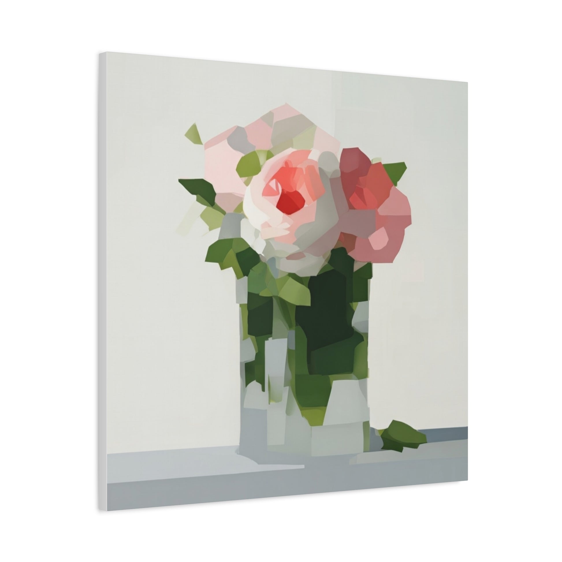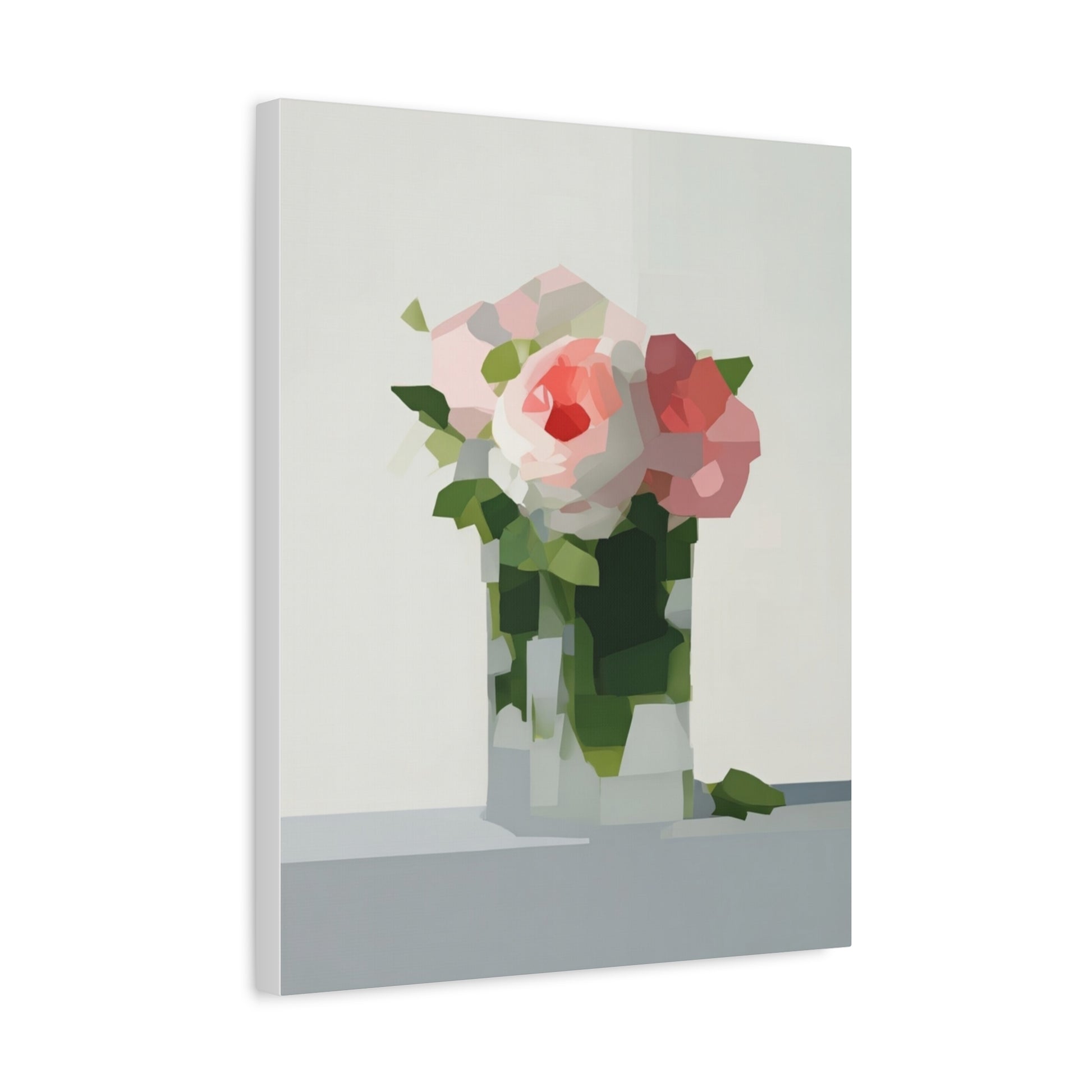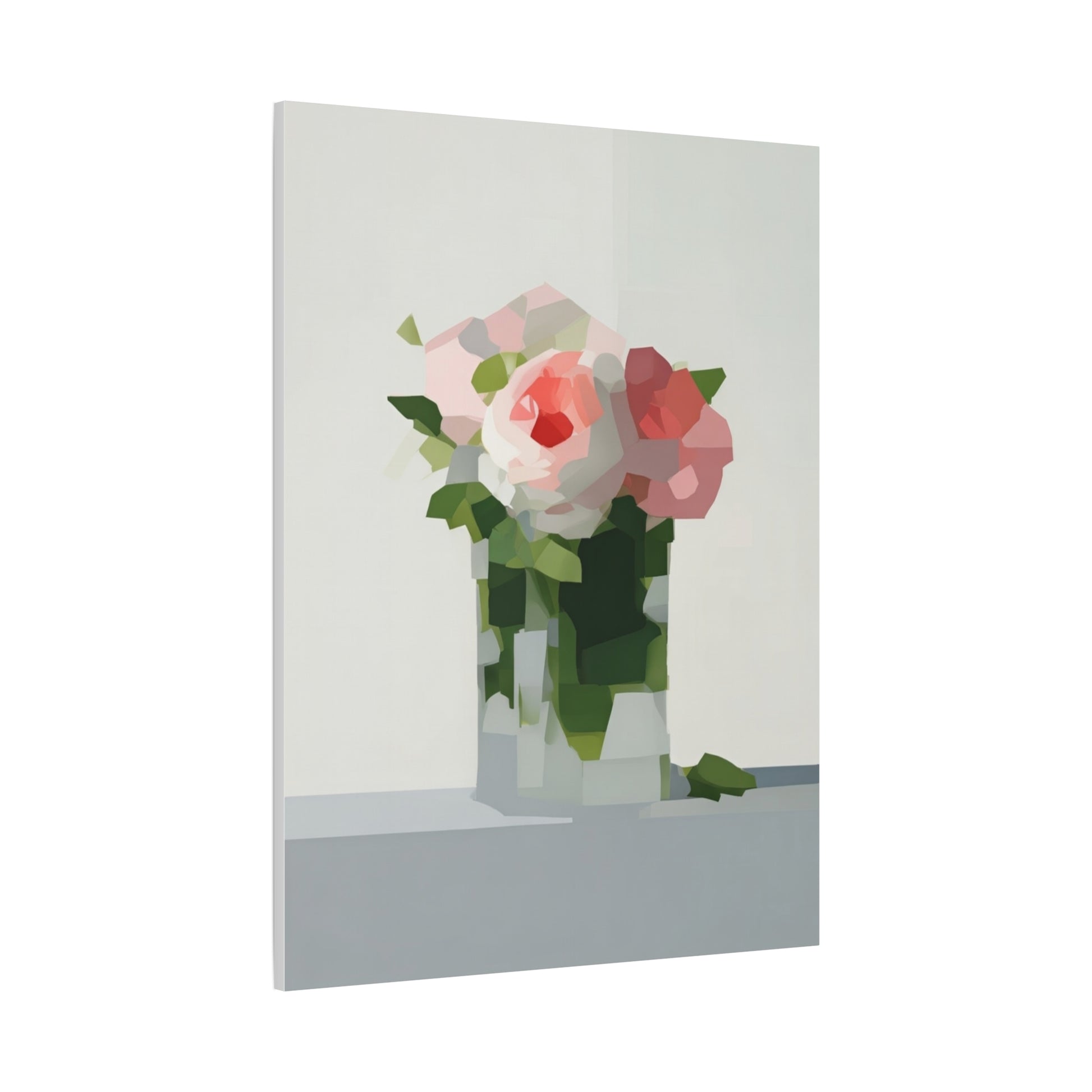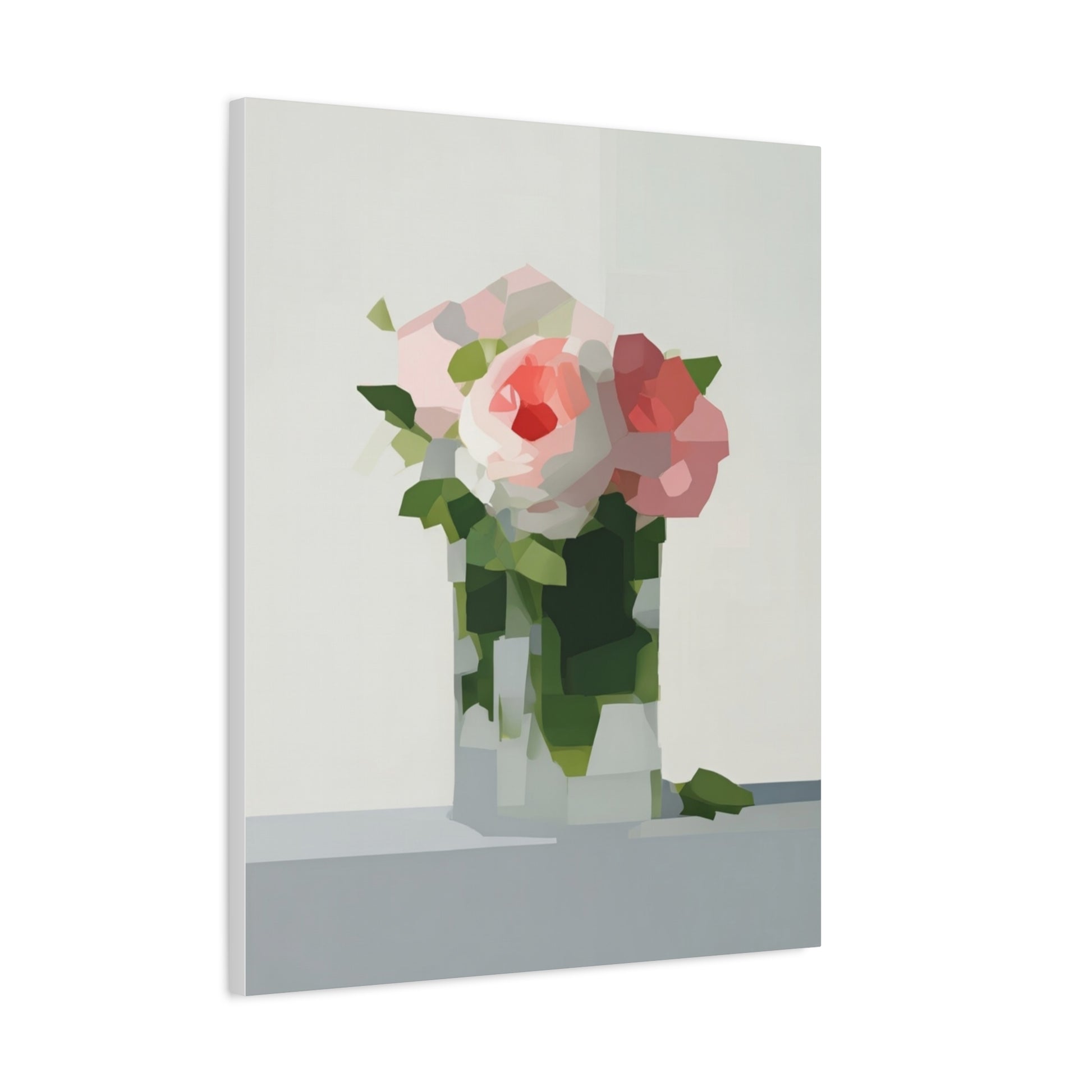 Soft, serene, and quietly modern — this stretched matte canvas brings a delicate still-life into your home with a contemporary edge. The painting’s muted palette and faceted shapes suggest roses in a glass vase, rendered with painterly blocks of color that feel both familiar and fresh. Hung in a reading nook, above a console, or as part of a calming gallery wall, the piece lends a peaceful, artful presence without shouting for attention. The slim profile and matte finish let texture and tone take center stage, inviting slow looks and gentle conversation.