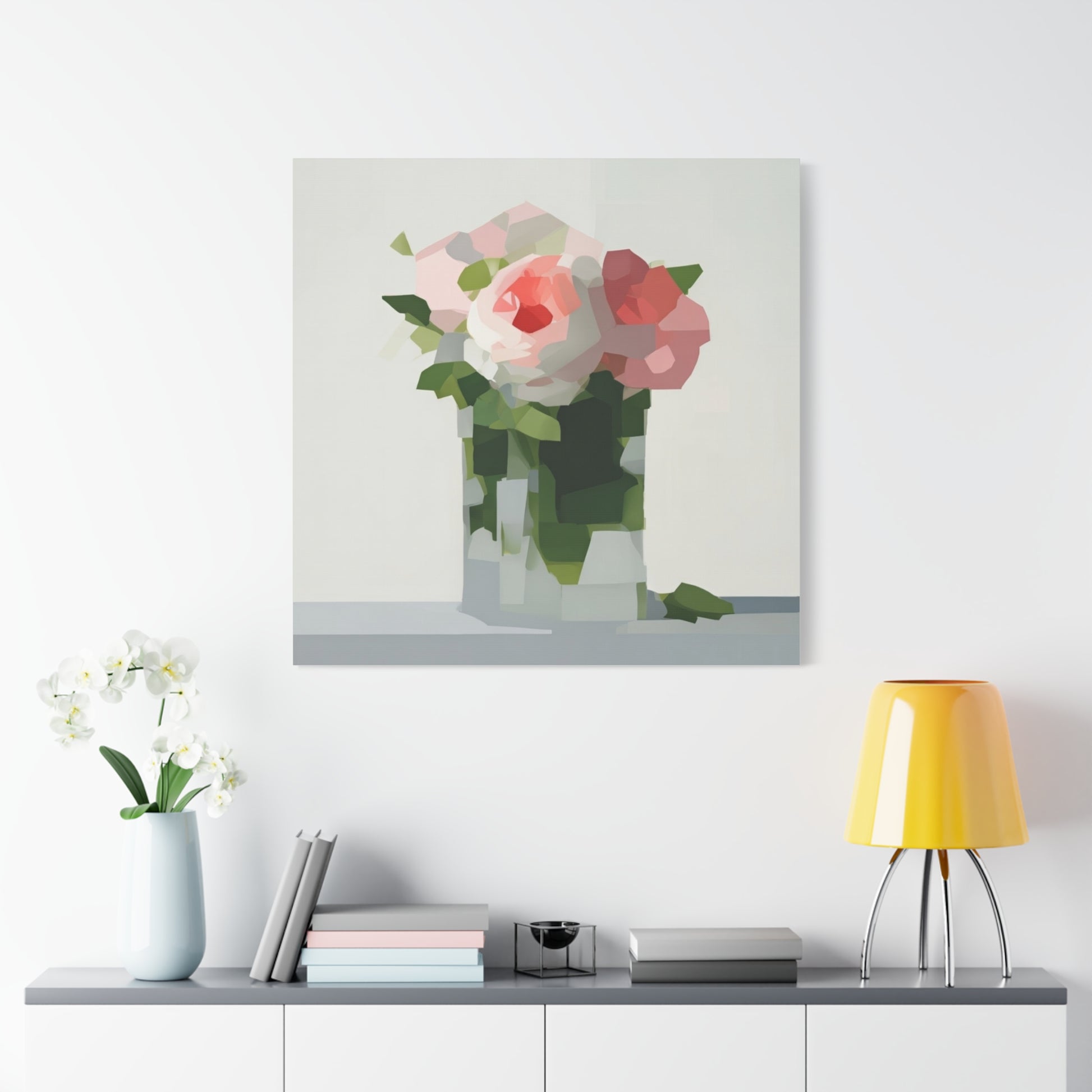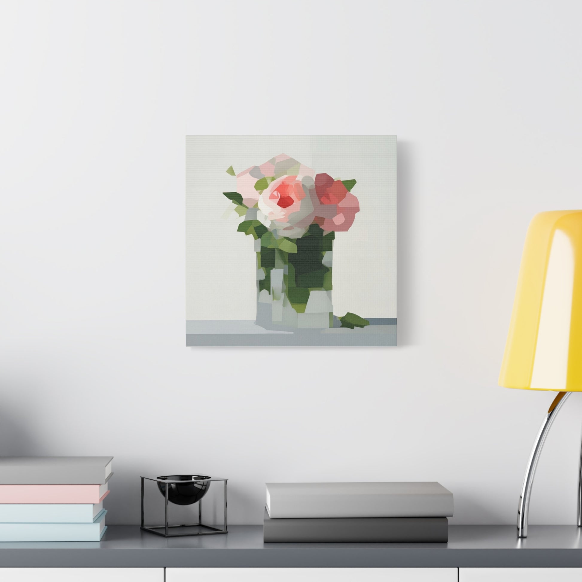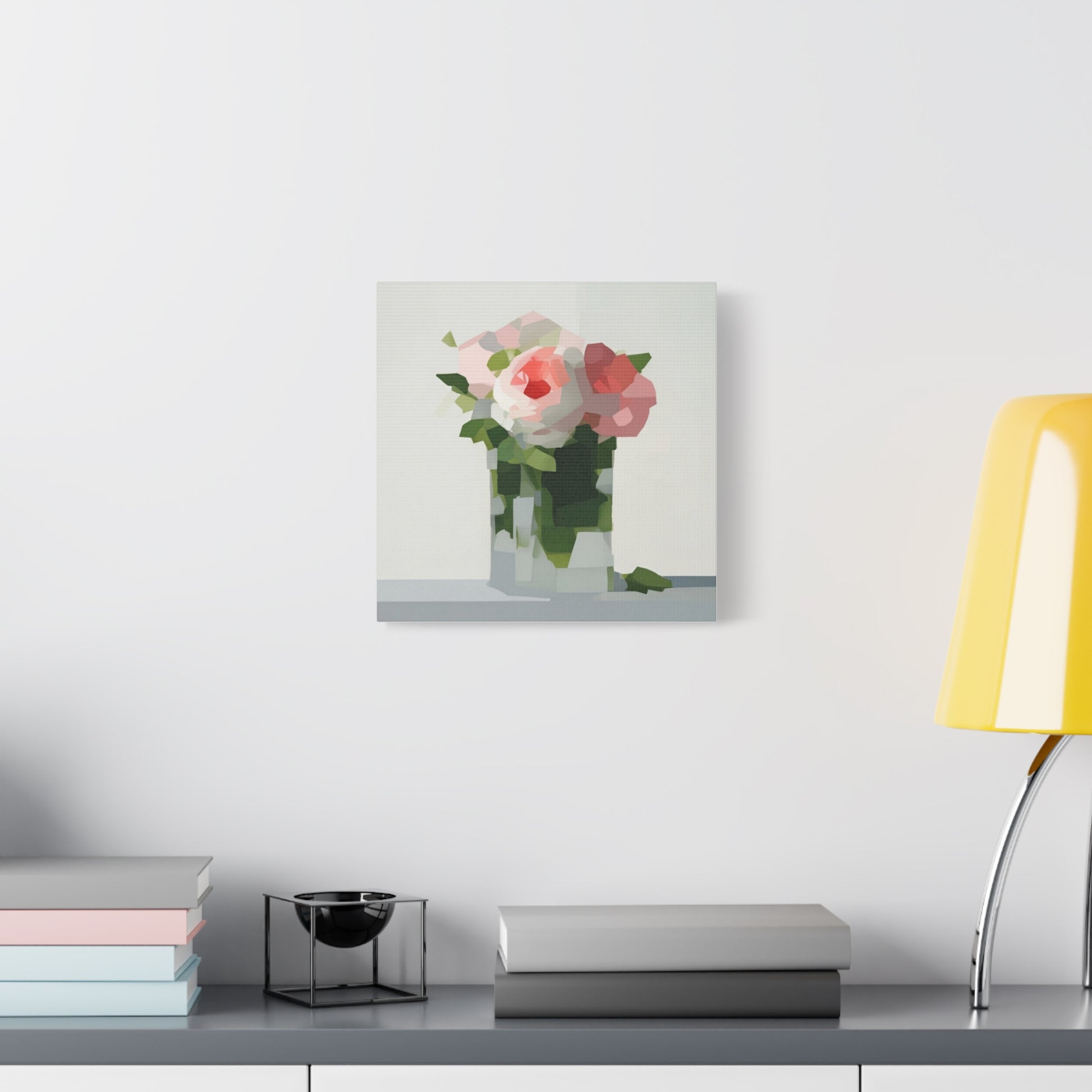 Soft, serene, and quietly modern — this stretched matte canvas brings a delicate still-life into your home with a contemporary edge. The painting’s muted palette and faceted shapes suggest roses in a glass vase, rendered with painterly blocks of color that feel both familiar and fresh. Hung in a reading nook, above a console, or as part of a calming gallery wall, the piece lends a peaceful, artful presence without shouting for attention. The slim profile and matte finish let texture and tone take center stage, inviting slow looks and gentle conversation.