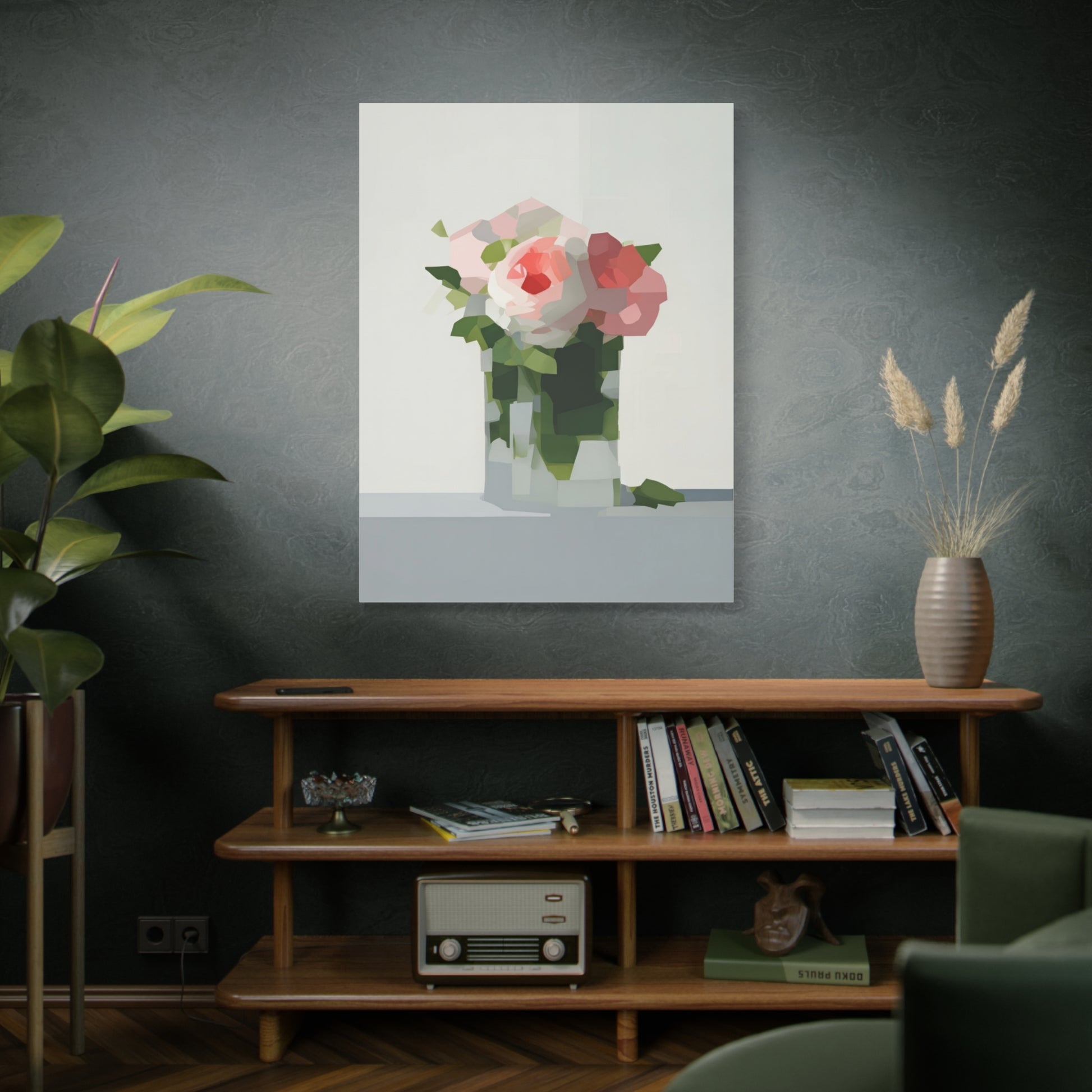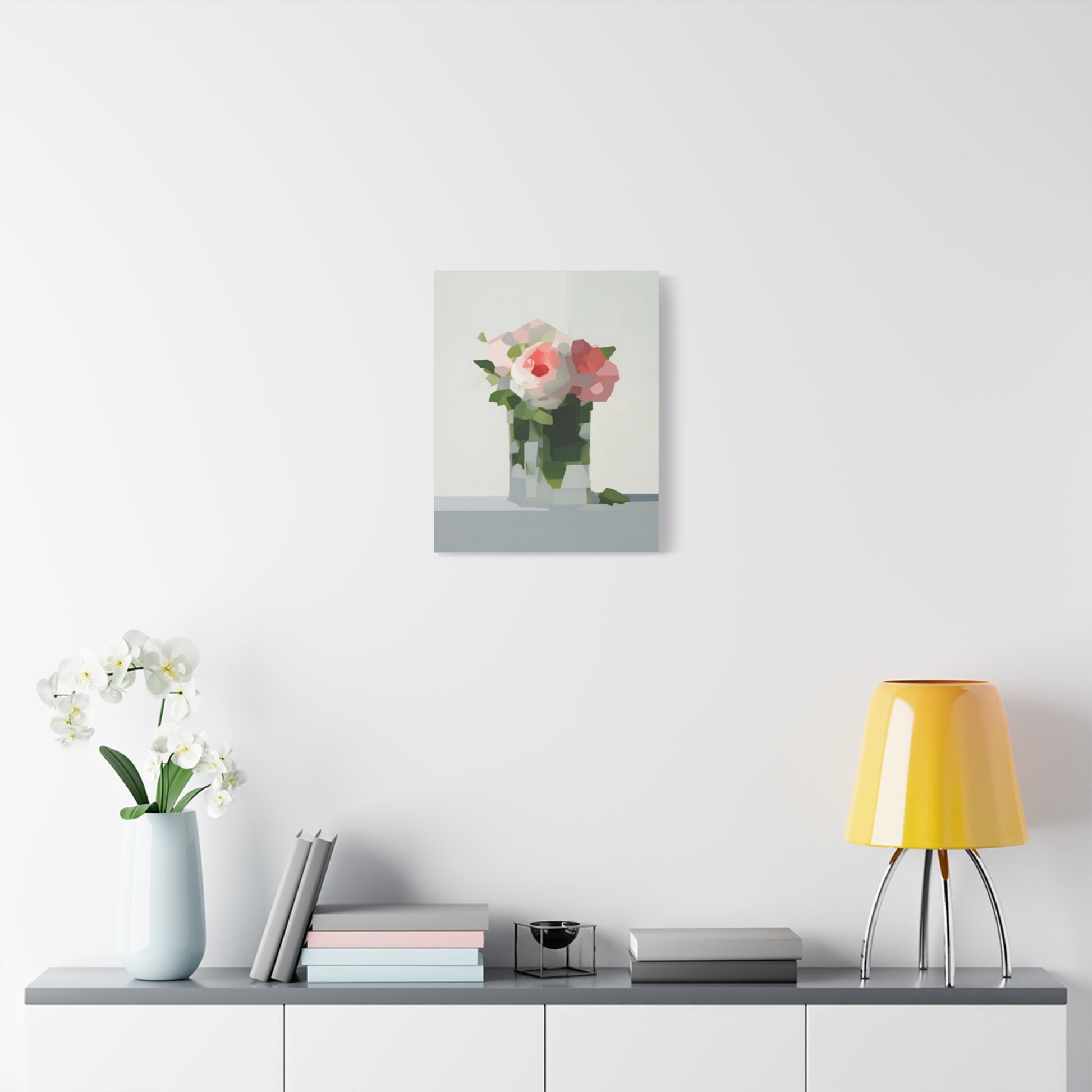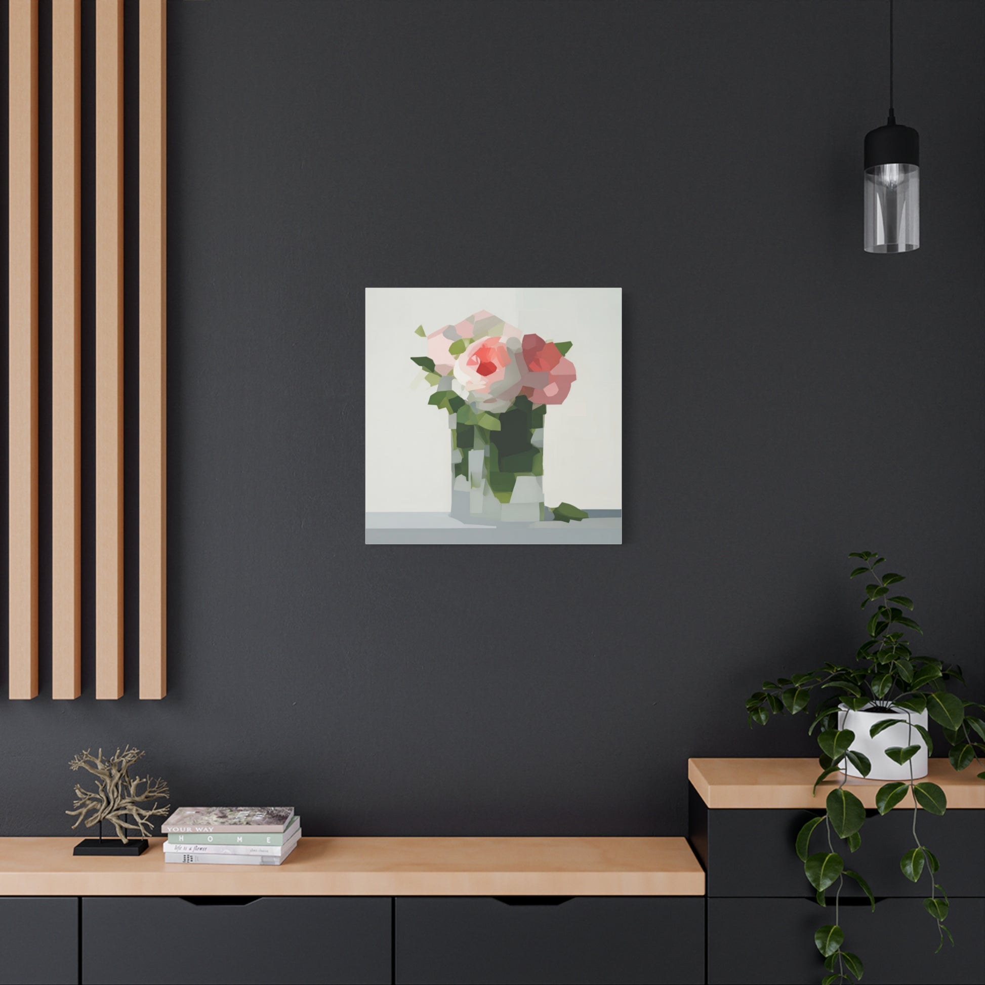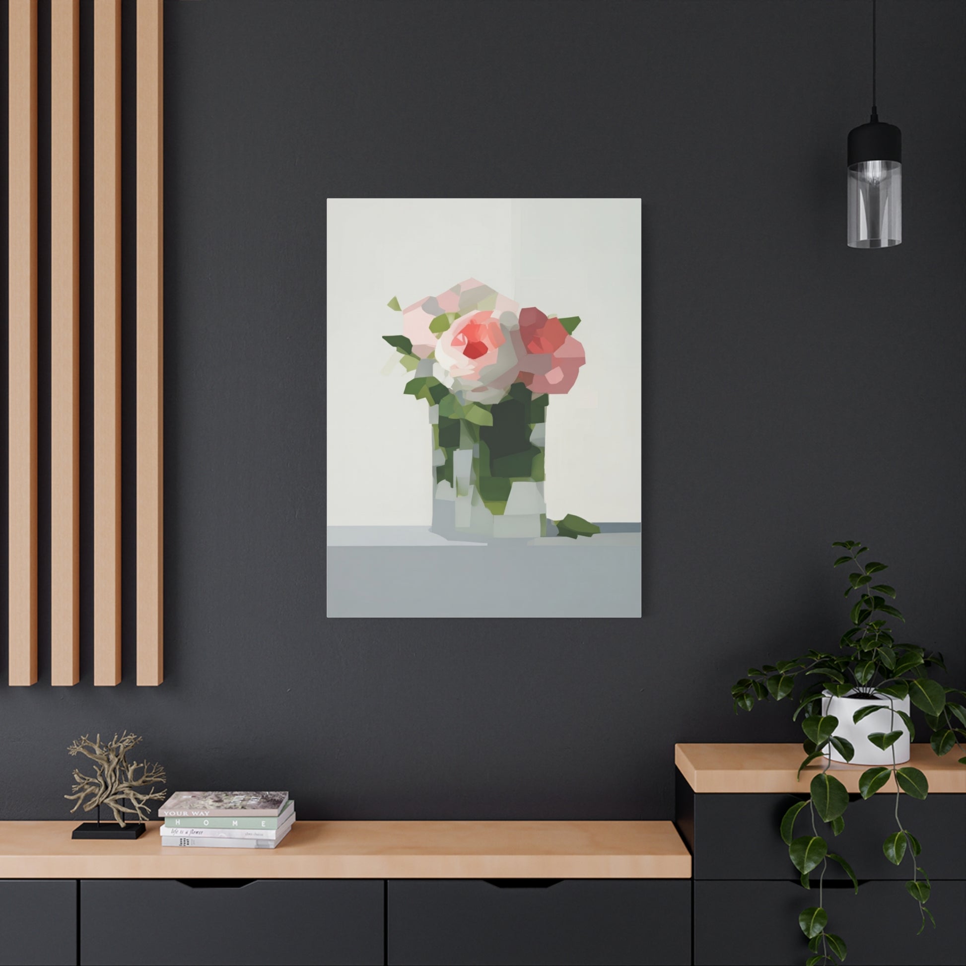 Soft, serene, and quietly modern — this stretched matte canvas brings a delicate still-life into your home with a contemporary edge. The painting’s muted palette and faceted shapes suggest roses in a glass vase, rendered with painterly blocks of color that feel both familiar and fresh. Hung in a reading nook, above a console, or as part of a calming gallery wall, the piece lends a peaceful, artful presence without shouting for attention. The slim profile and matte finish let texture and tone take center stage, inviting slow looks and gentle conversation.