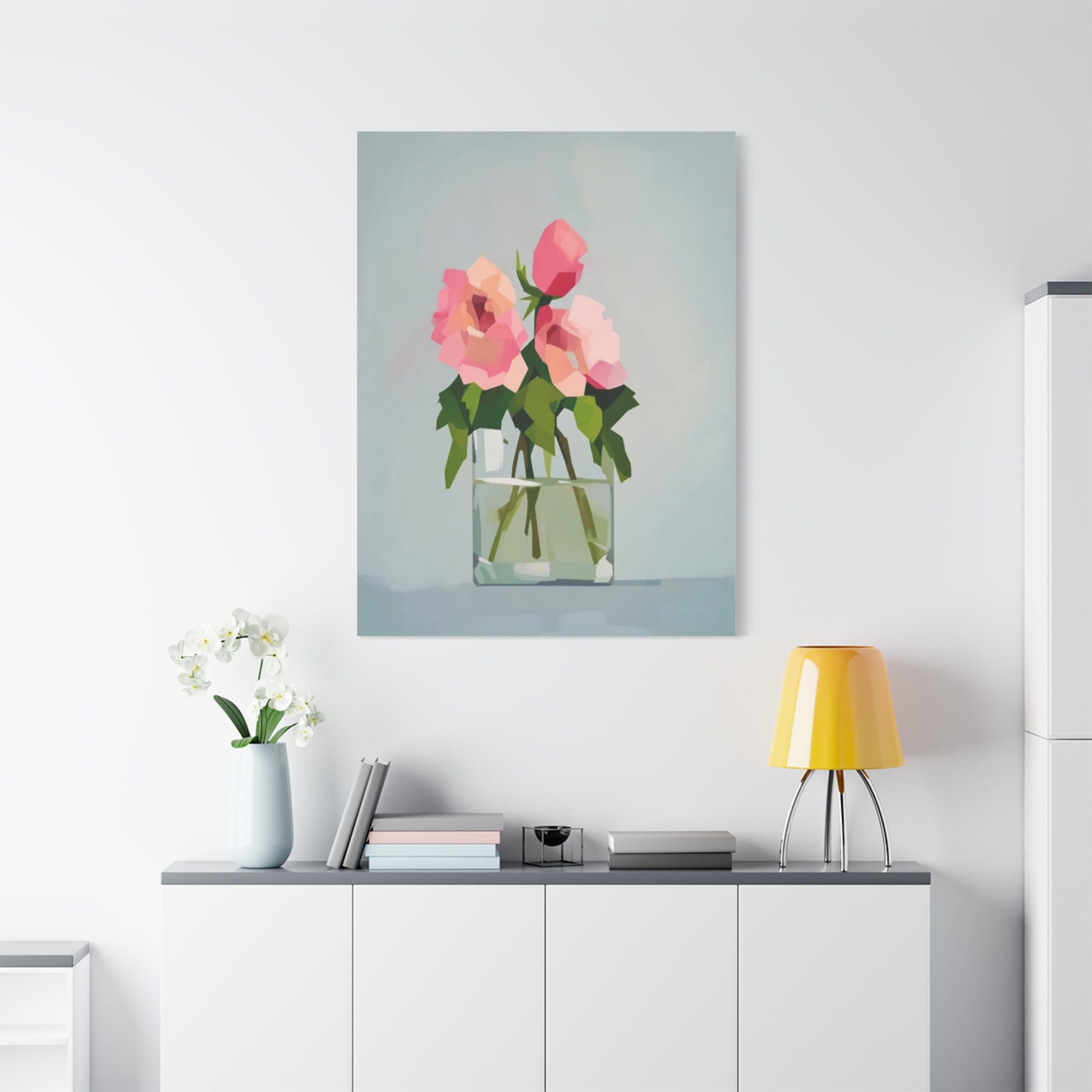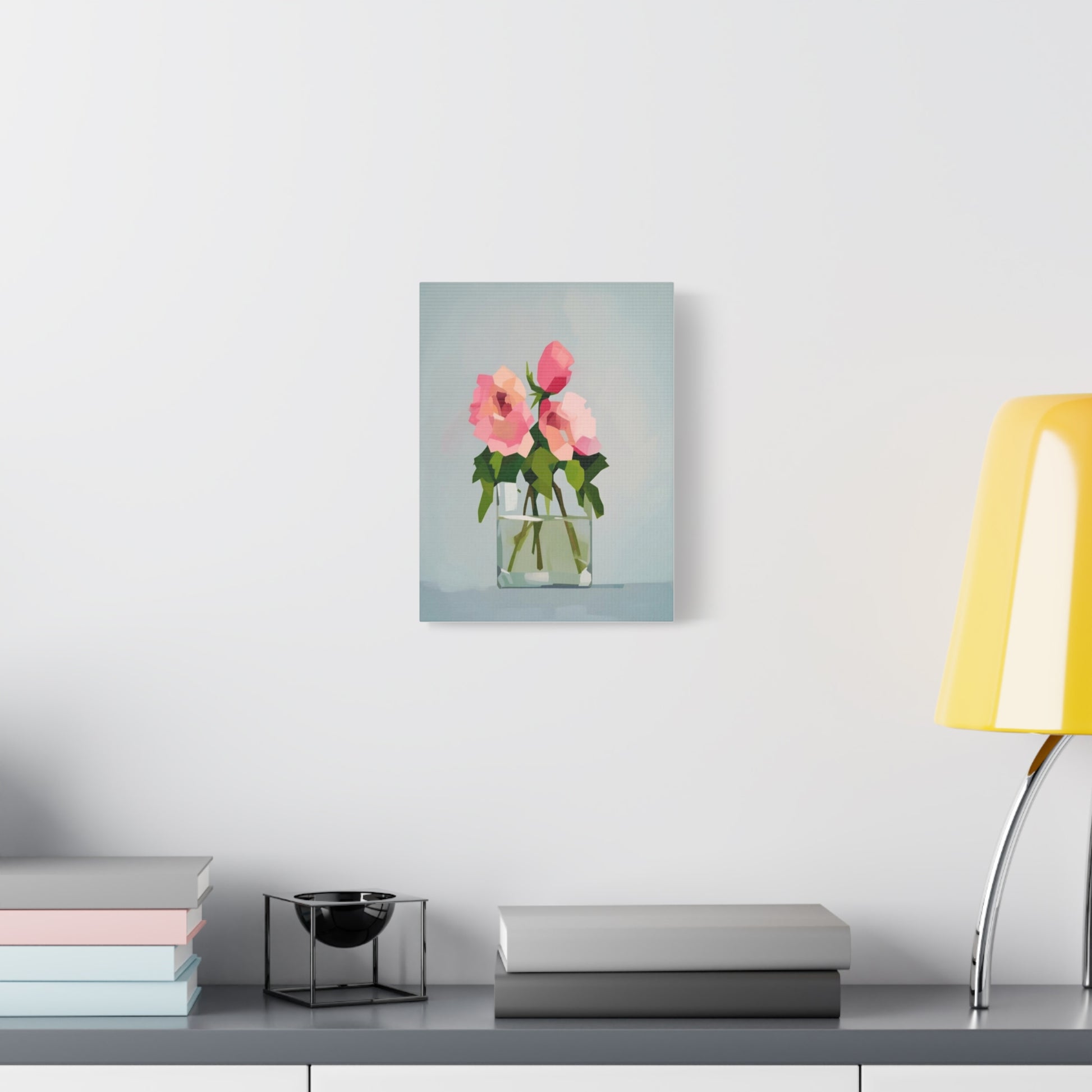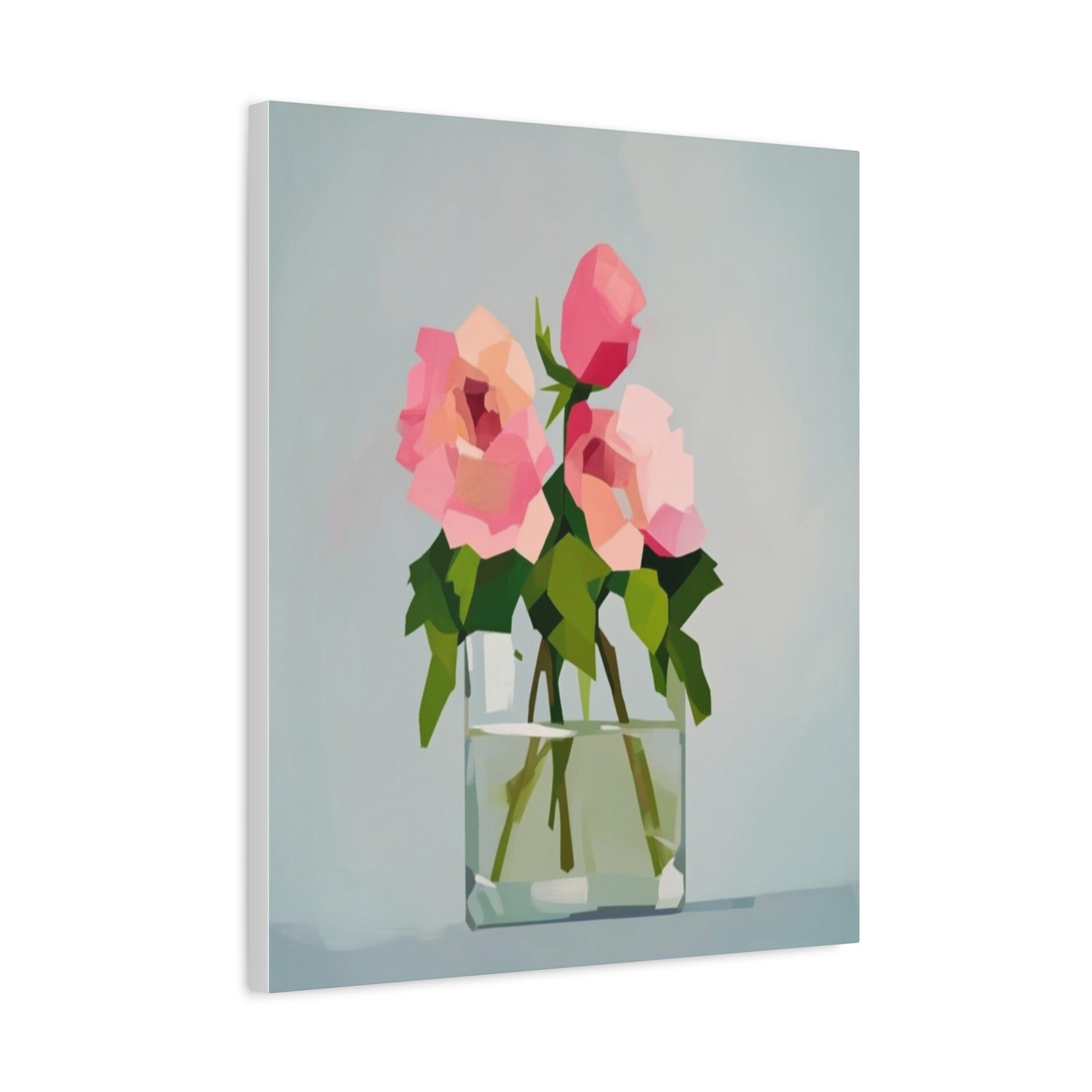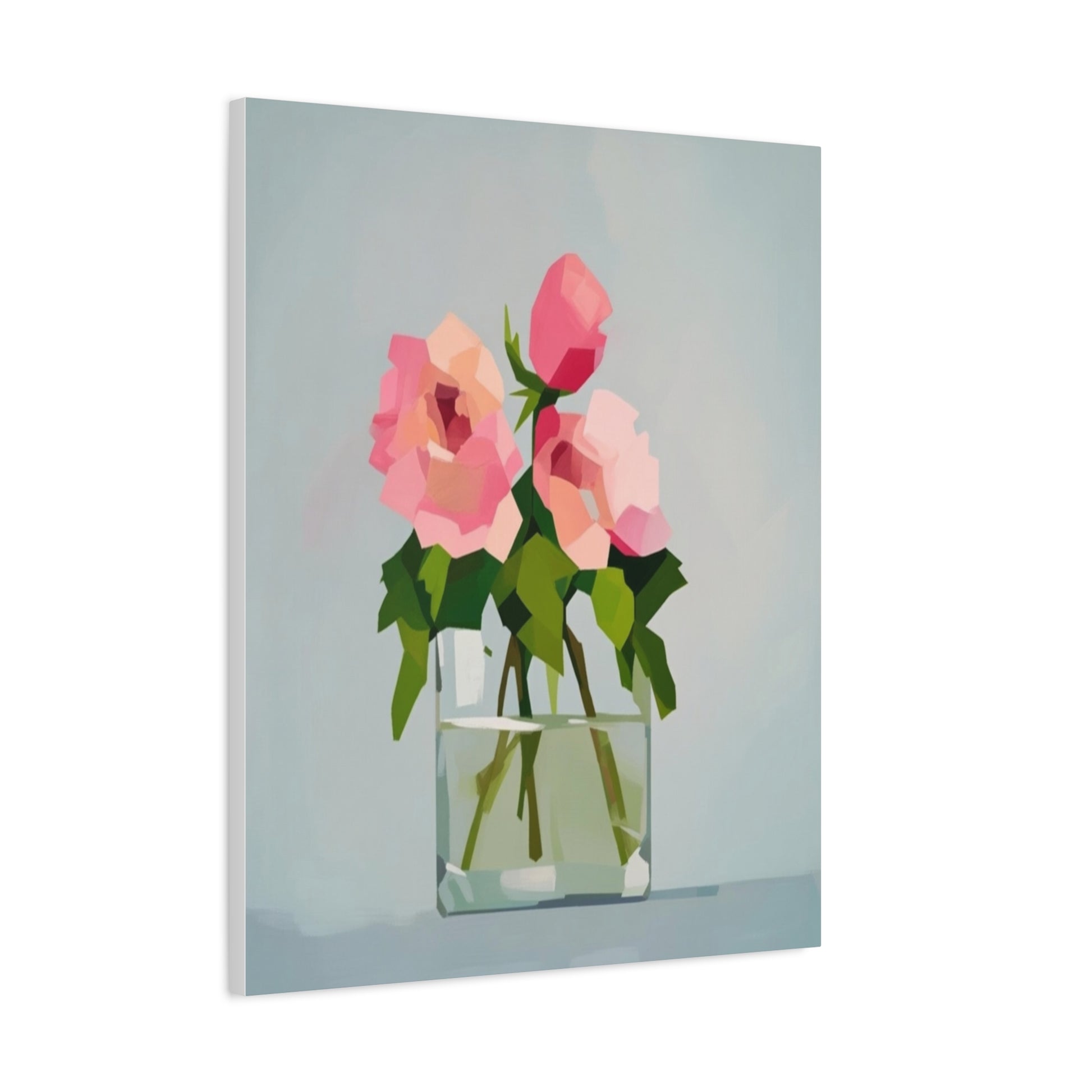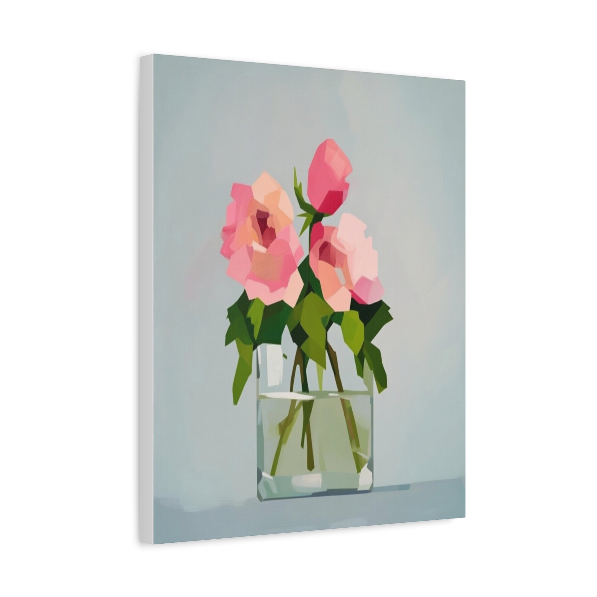 A serene, modern canvas print that brings a quiet moment into everyday rooms. Soft-petaled roses rest in a simple glass vase, rendered in gentle brushlike planes of pink, green and pale blue. The matte, stretched canvas sits on a slim 1.25" pine profile so the artwork reads cleanly from the wall without distracting bulk. Hang it alone to create a calm focal point, or group it with other botanical or minimalist pieces to build a layered, soothing gallery wall. The tactile matte surface and subtle texture make light feel soft across the image, inviting lingering glances and gentle conversation.