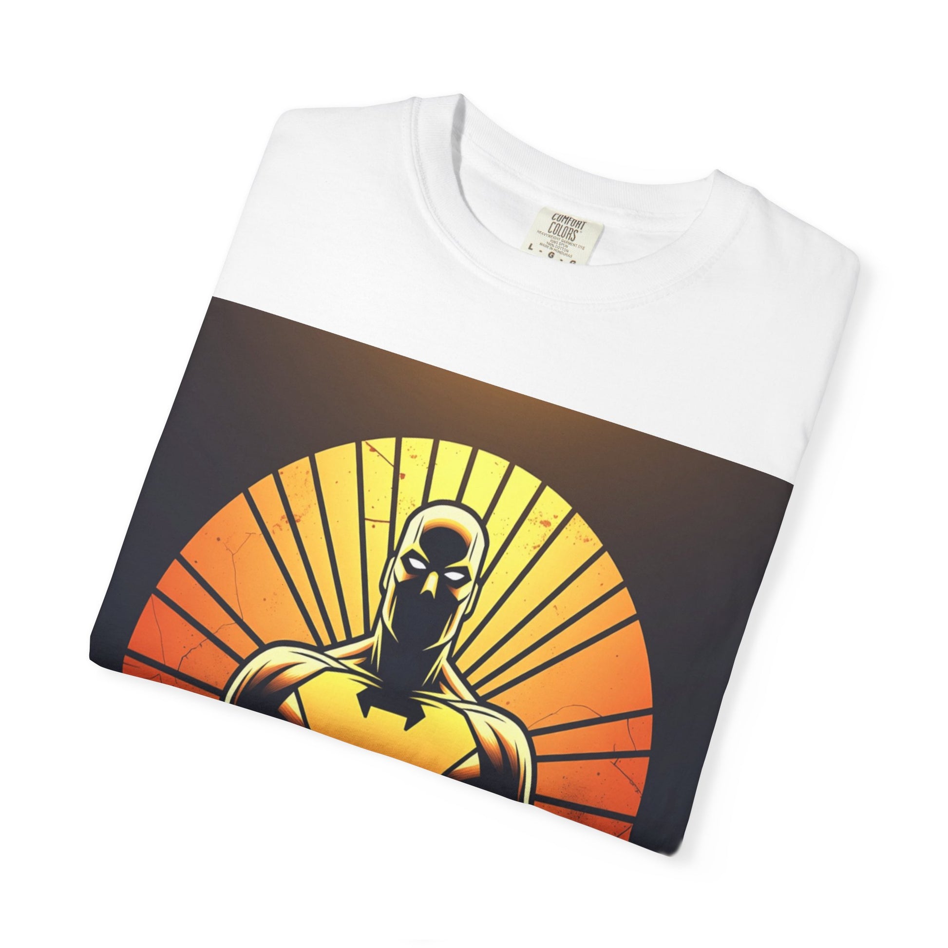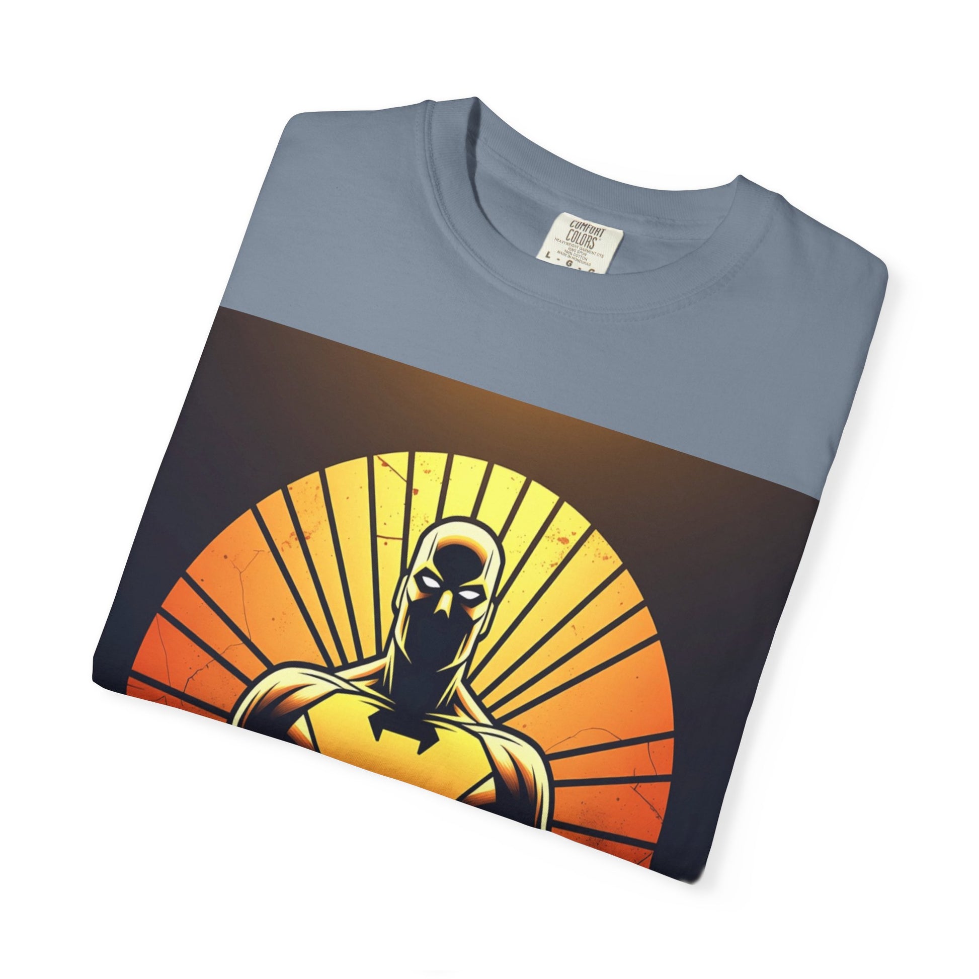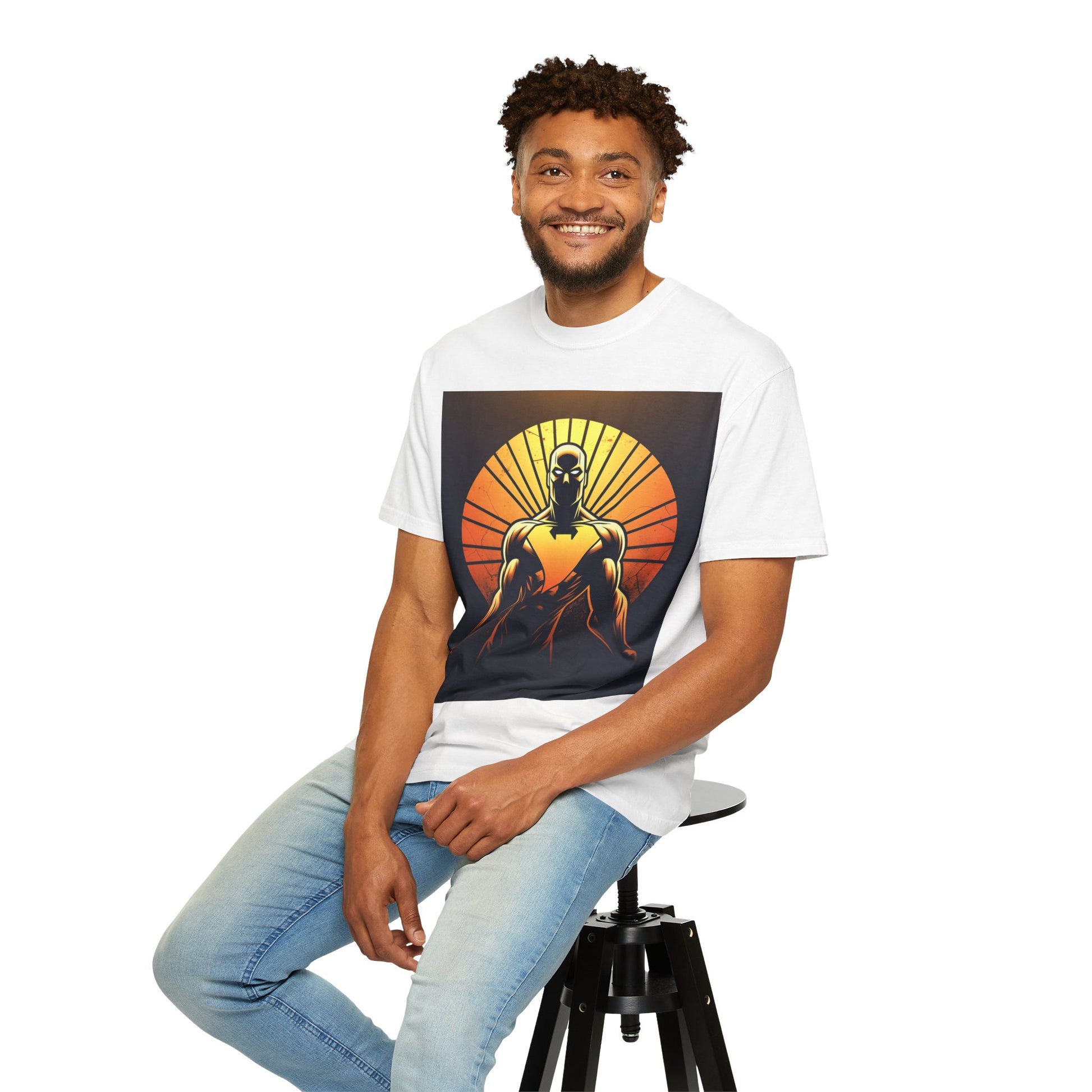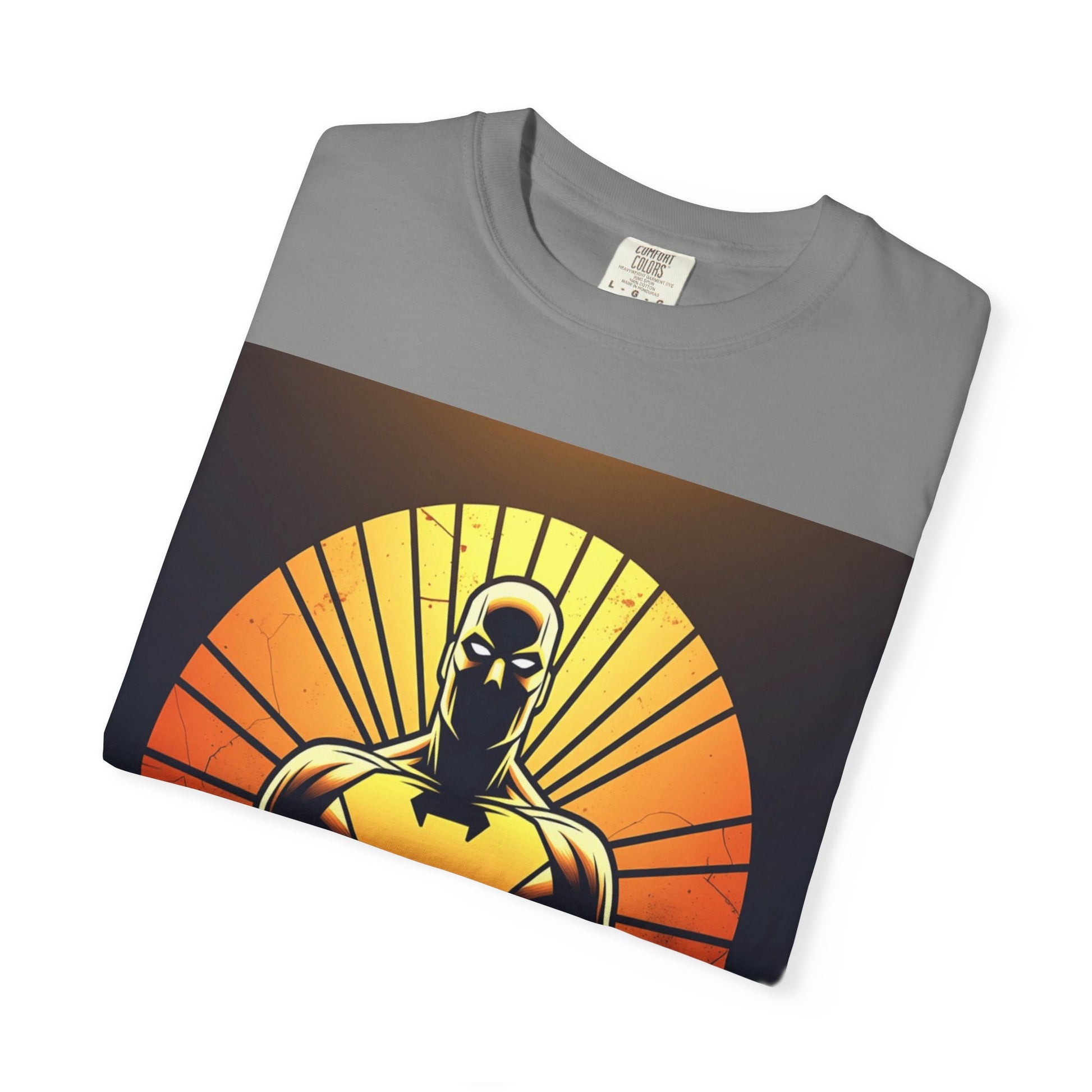 This heavyweight garment-dyed tee wears like a lived-in favorite from day one. The front showcases a bold, graphic sentinel silhouetted against a radiant sunset — warm oranges and deep shadows create a cinematic, slightly heroic vibe. The relaxed cut and soft, pre-shrunk cotton make it a go-to for long days: layered under a jacket for shows and meetups, or worn solo when you want the art to speak. It’s for people who appreciate tactile, vintage-feeling tees and striking, comic-inspired imagery that feels equal parts nostalgic and modern.