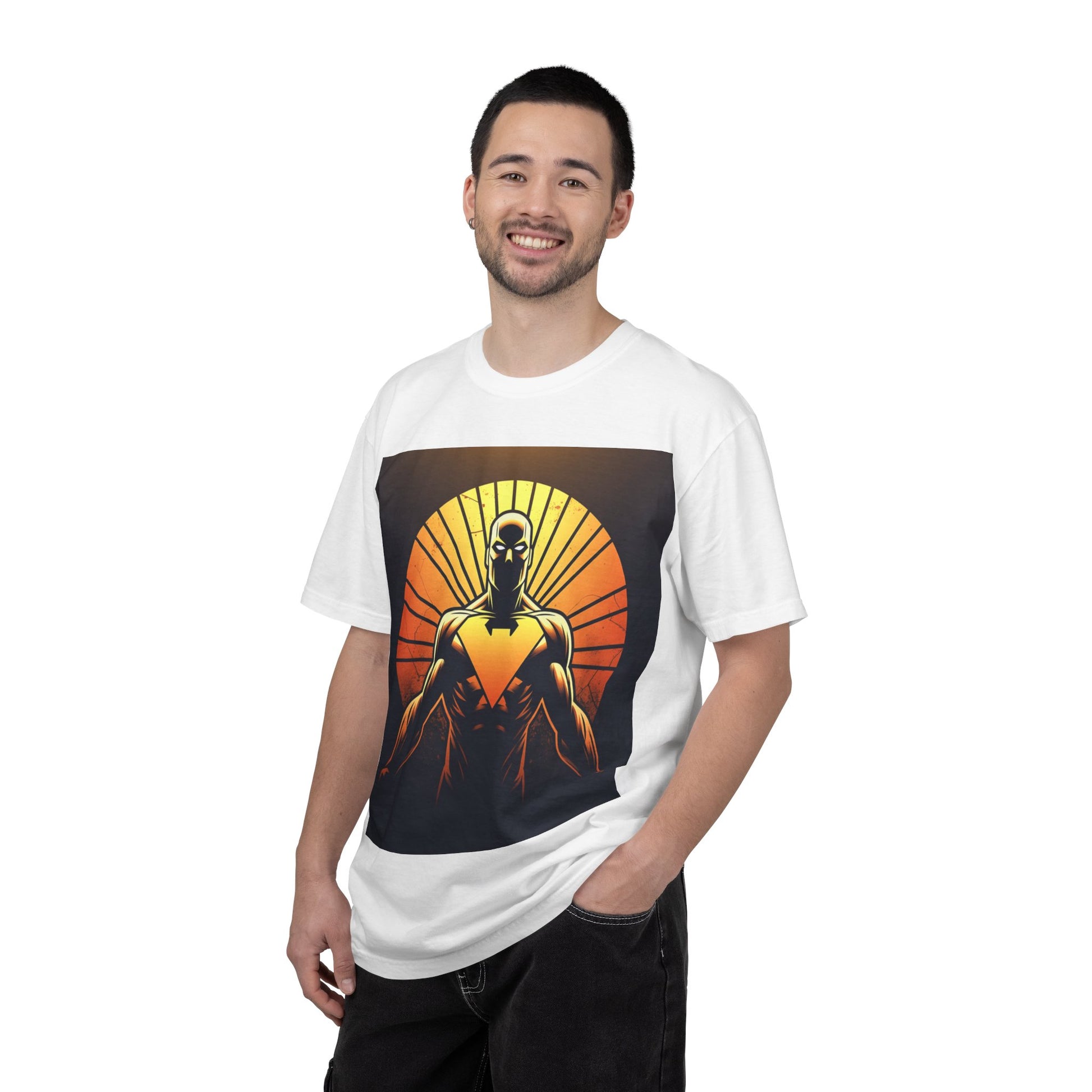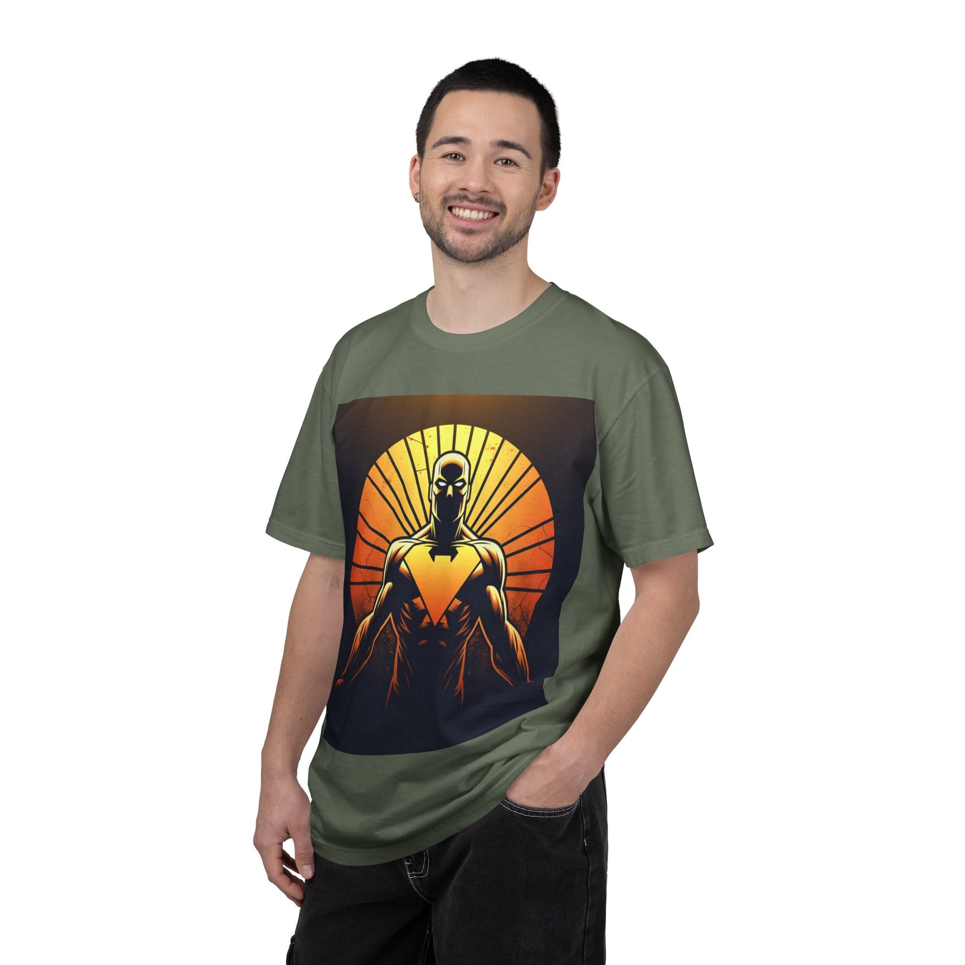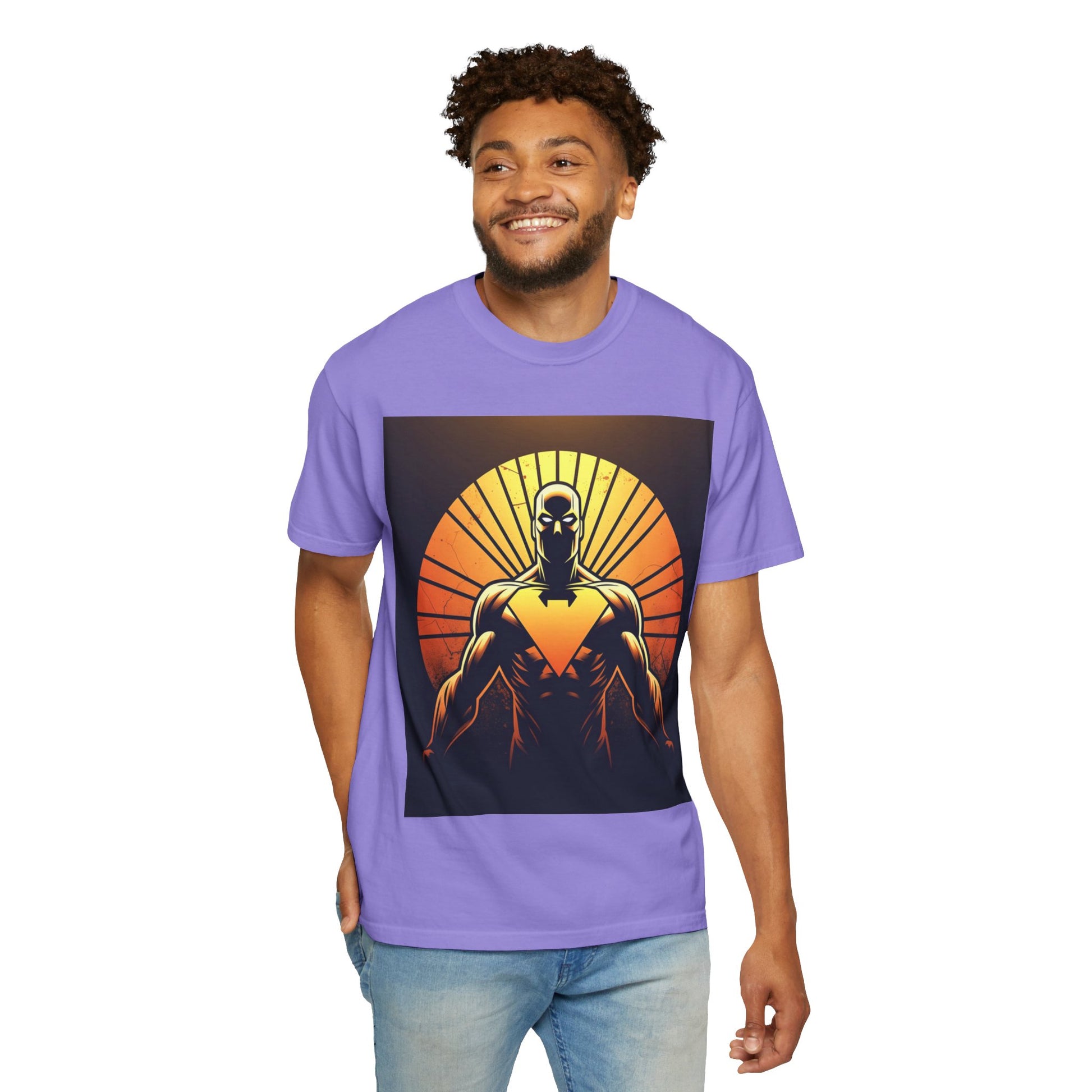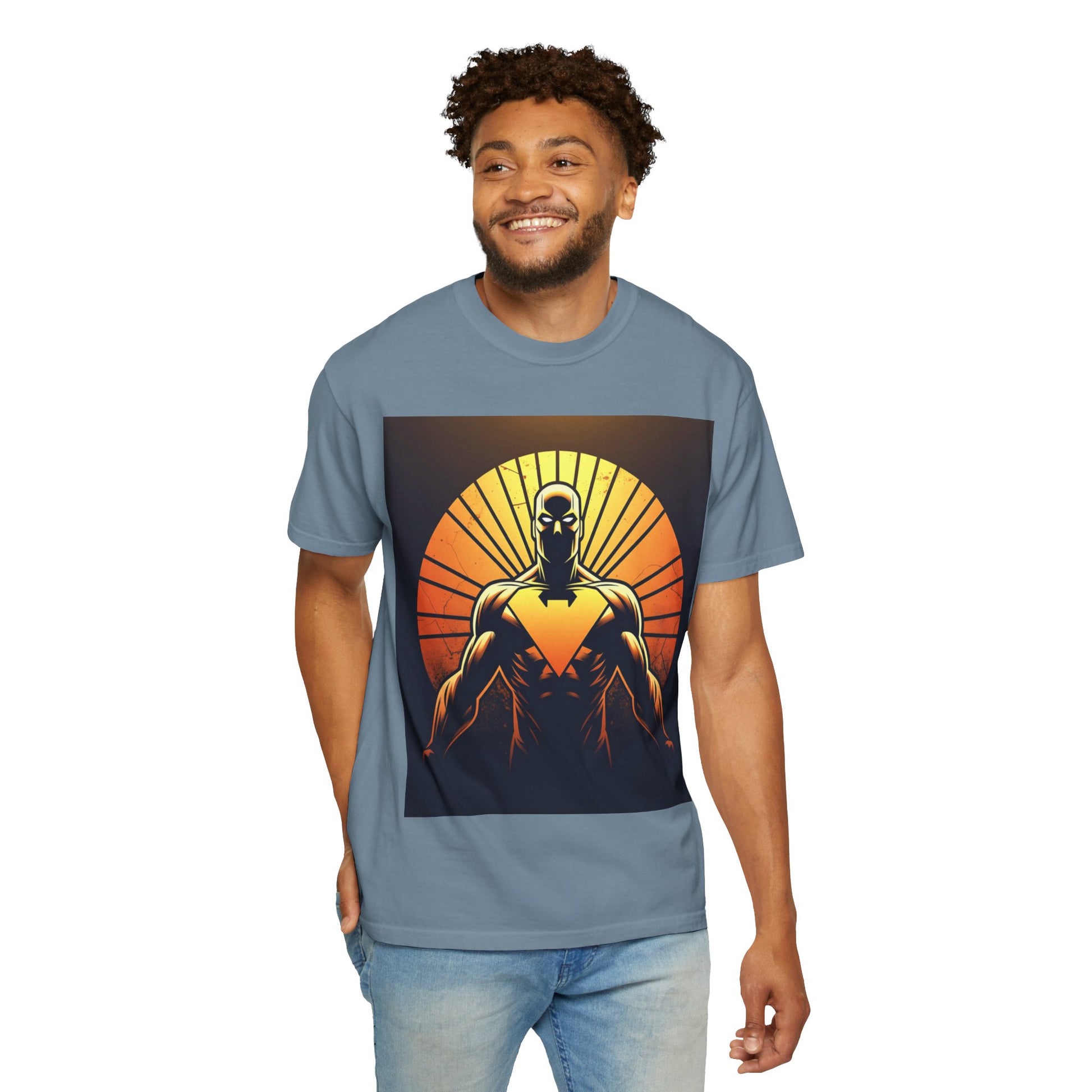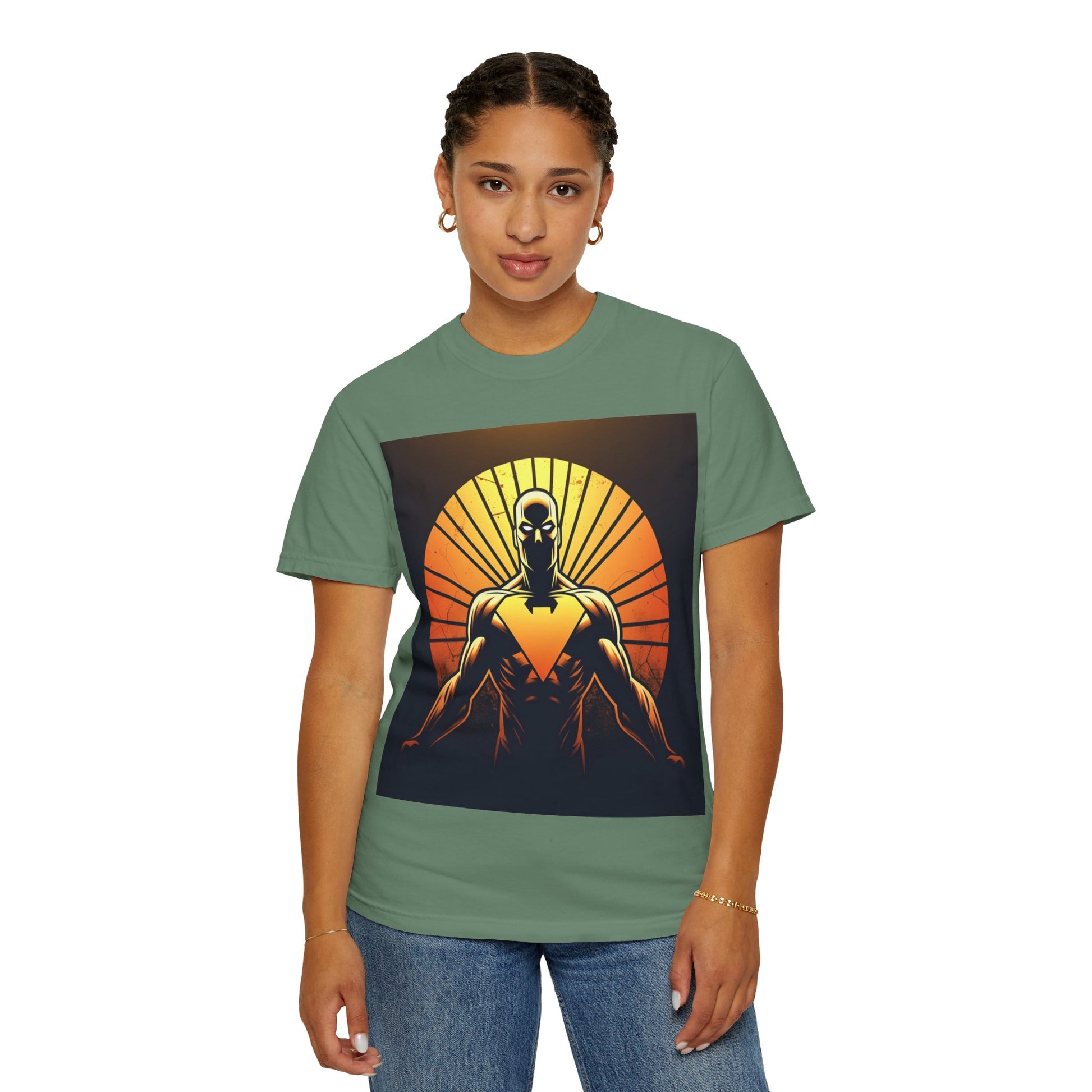 This heavyweight garment-dyed tee wears like a lived-in favorite from day one. The front showcases a bold, graphic sentinel silhouetted against a radiant sunset — warm oranges and deep shadows create a cinematic, slightly heroic vibe. The relaxed cut and soft, pre-shrunk cotton make it a go-to for long days: layered under a jacket for shows and meetups, or worn solo when you want the art to speak. It’s for people who appreciate tactile, vintage-feeling tees and striking, comic-inspired imagery that feels equal parts nostalgic and modern.