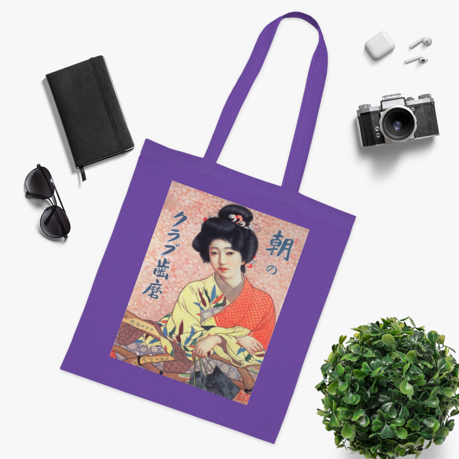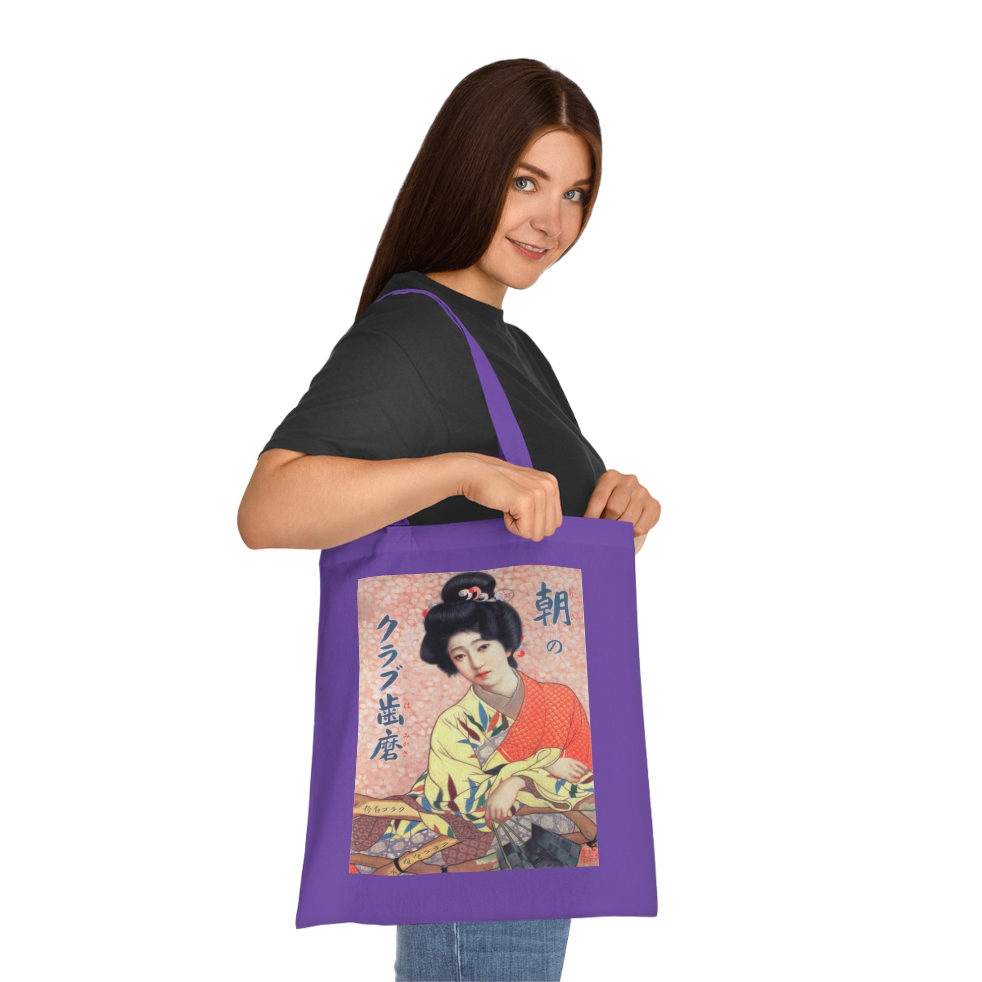 Carry a quiet moment of vintage Japan with you. This lightweight cotton tote features a softly muted ukiyo-e style portrait of a woman in kimono—subtle pinks and warm corals set against delicate textures. It feels like a page torn from an old travel poster: reflective, elegant, and a little nostalgic. The slim profile slips easily over your shoulder for market runs, gallery visits, or city wandering. When you sling it on, it becomes part of your everyday rhythm—an understated way to show a love for classic Japanese imagery and slow, thoughtful style.