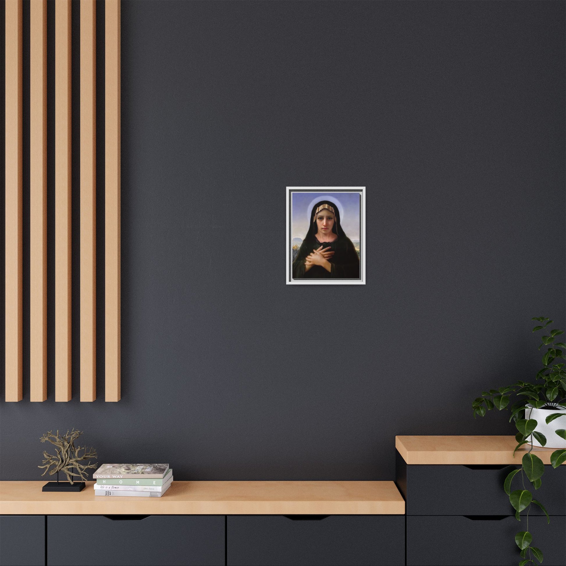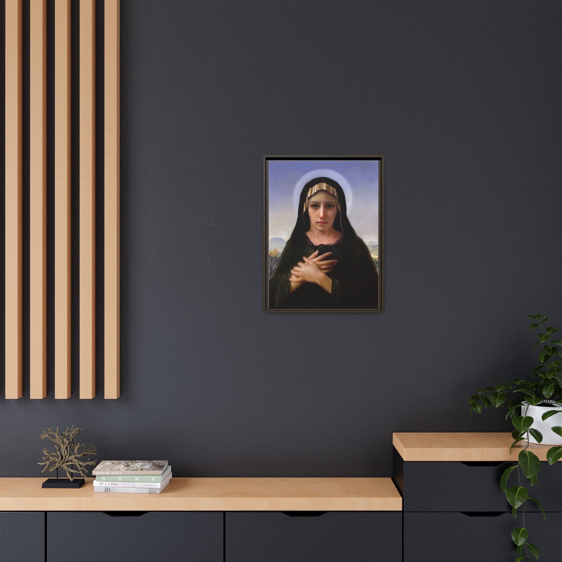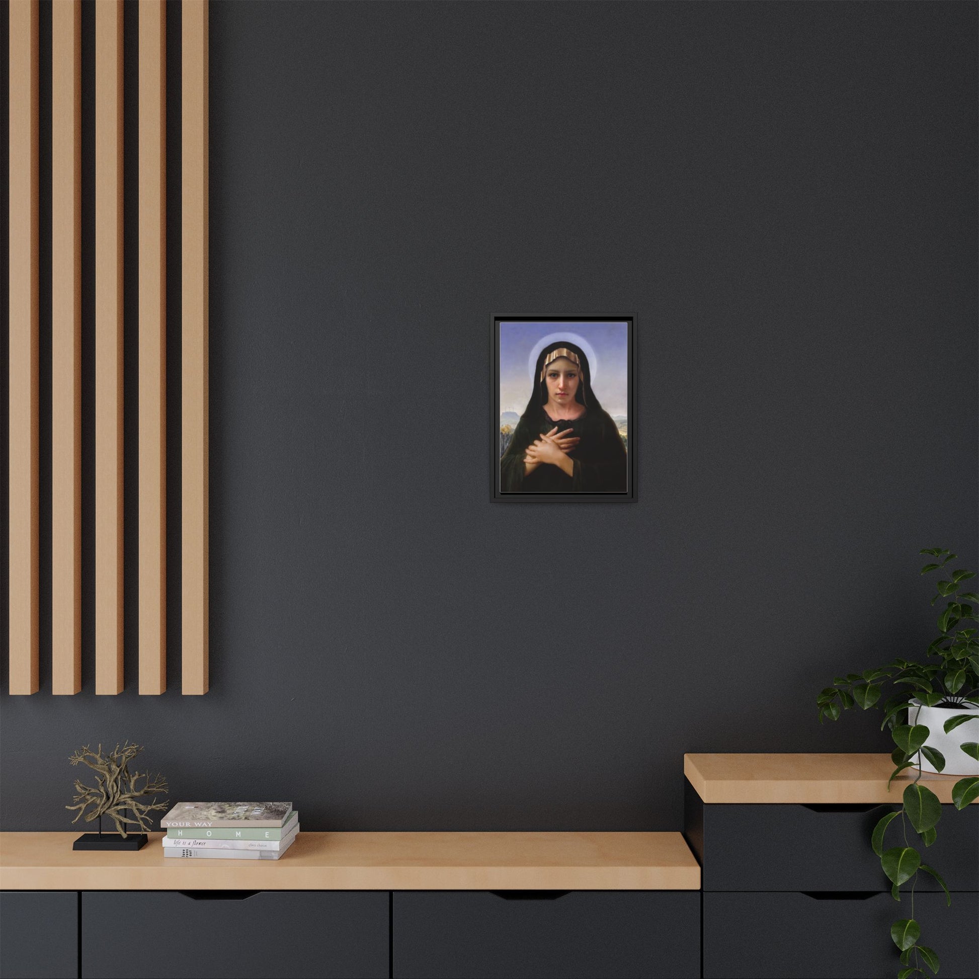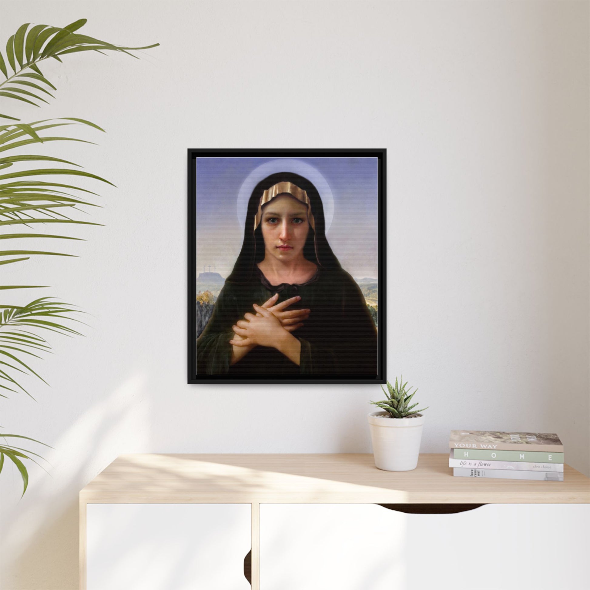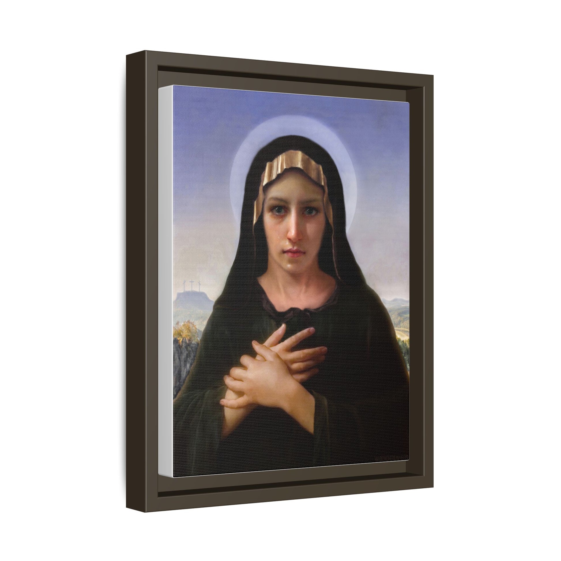 A framed matte canvas print that brings quiet reverence to a room. The soft, painterly portrait sits on a deep-black pine frame that neatly floats the image from the wall, creating subtle depth and a museum-like presence. Colors stay rich and true thanks to advanced latex printing and a special canvas coating that keeps skin tones gentle and backgrounds luminous. Hang it in a meditation corner, entryway, or above a mantel to add a contemplative focal point that feels both vintage and freshly printed.