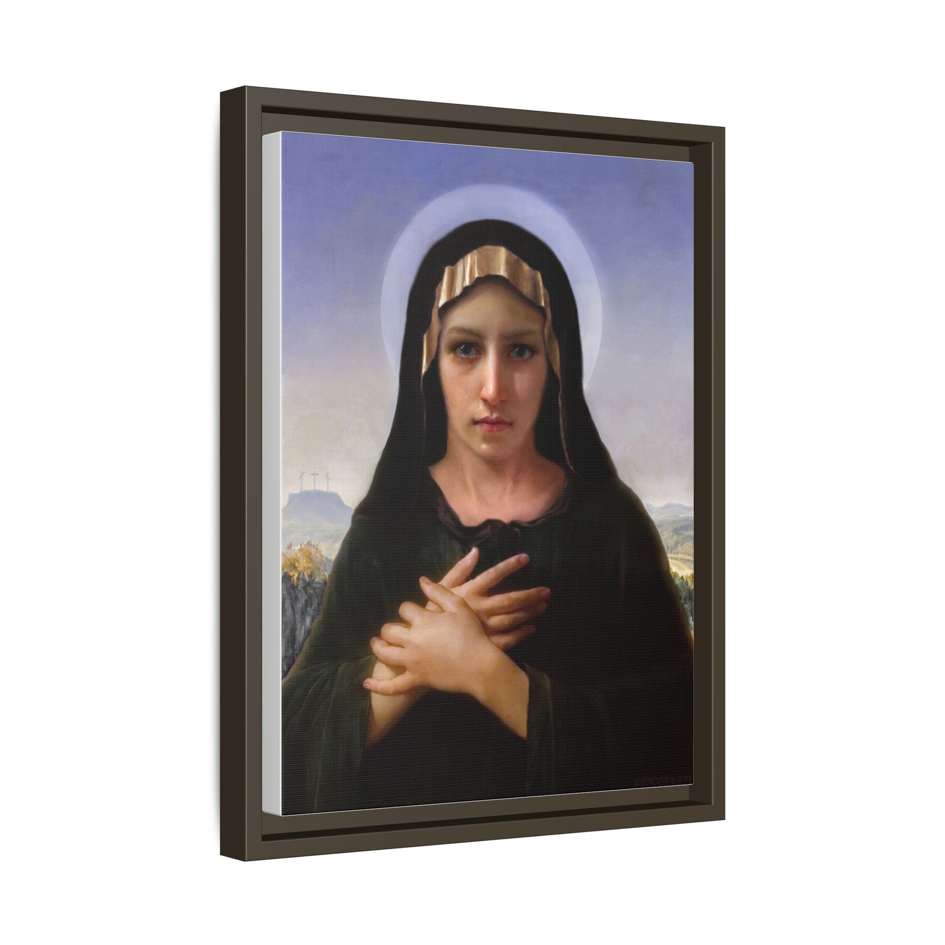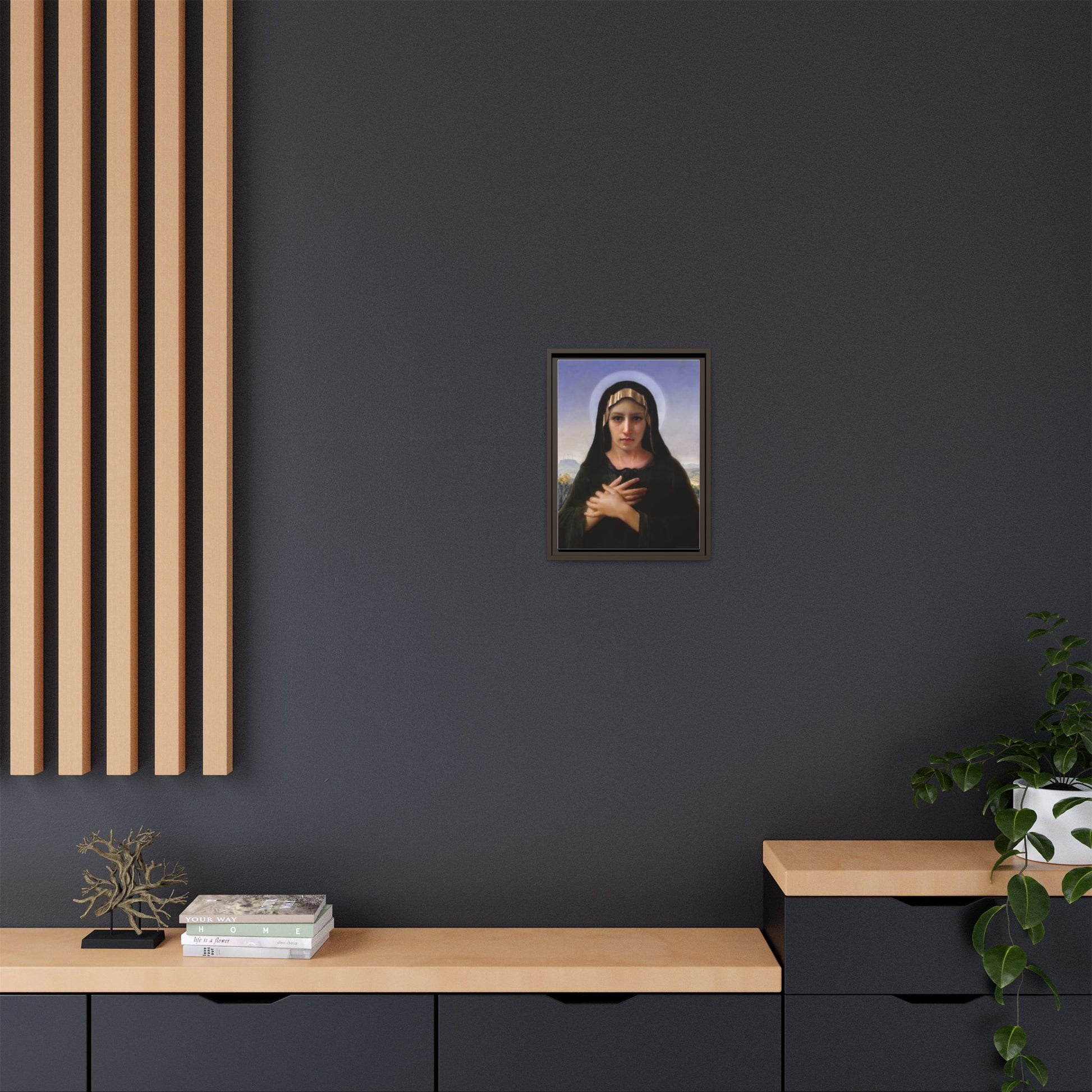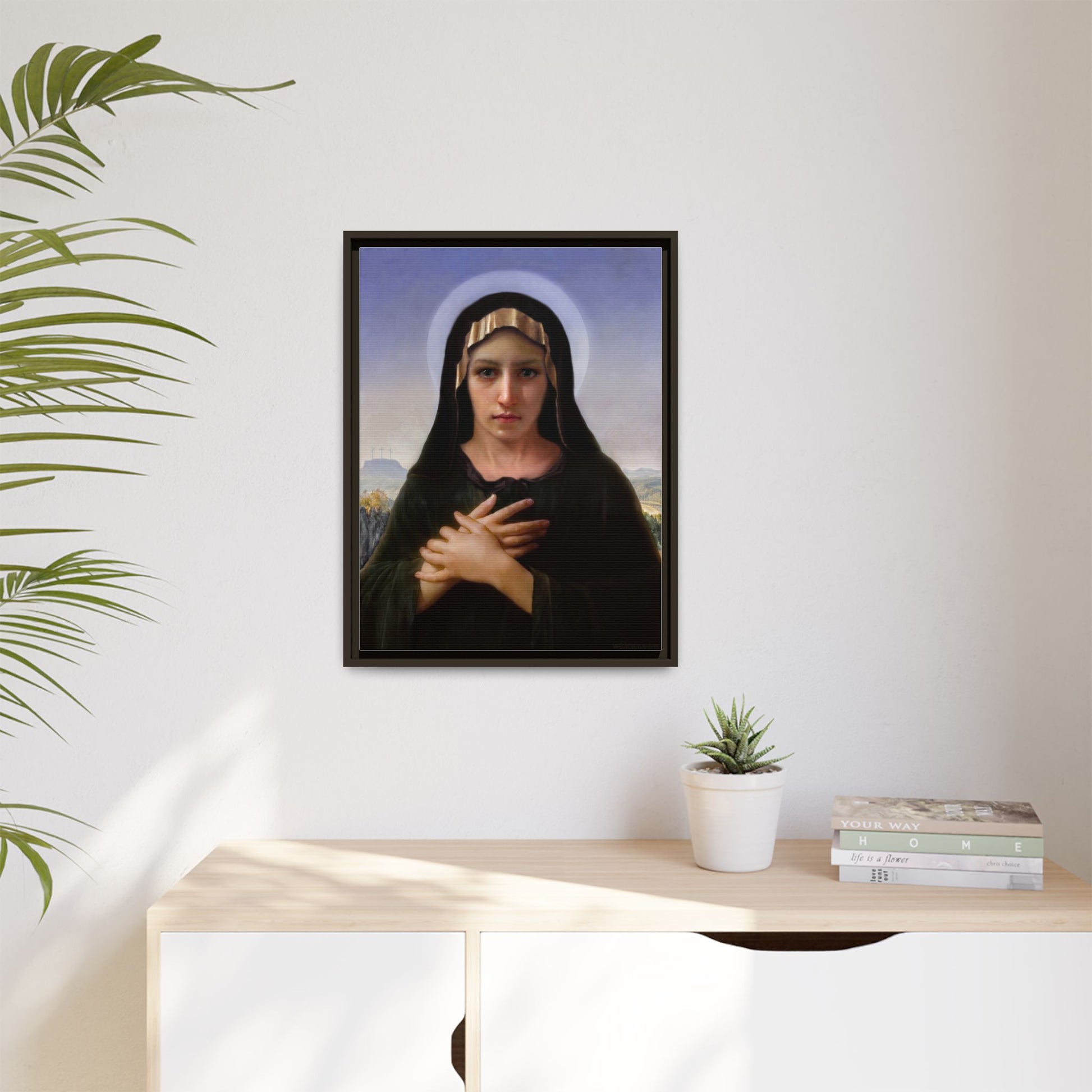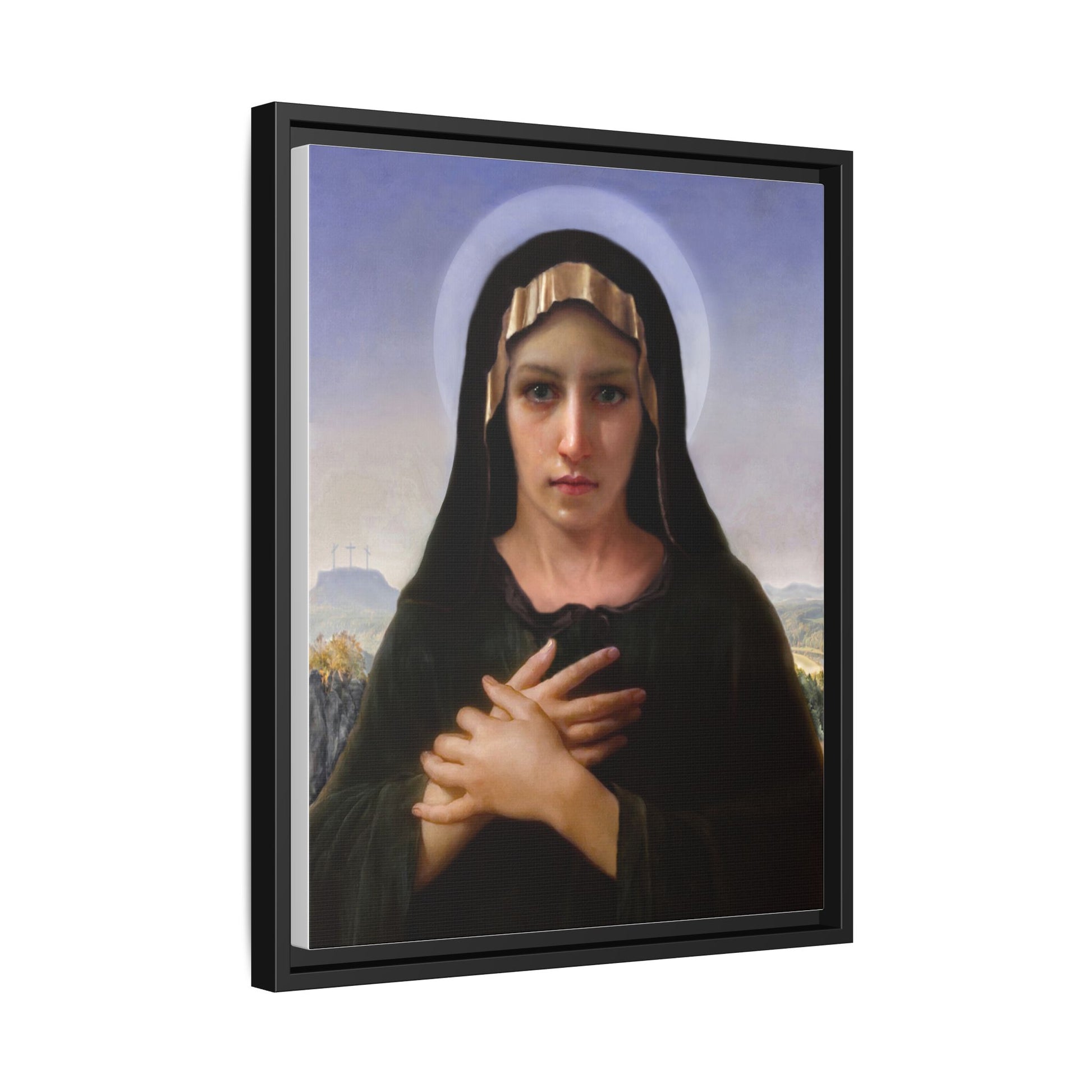 A framed matte canvas print that brings quiet reverence to a room. The soft, painterly portrait sits on a deep-black pine frame that neatly floats the image from the wall, creating subtle depth and a museum-like presence. Colors stay rich and true thanks to advanced latex printing and a special canvas coating that keeps skin tones gentle and backgrounds luminous. Hang it in a meditation corner, entryway, or above a mantel to add a contemplative focal point that feels both vintage and freshly printed.