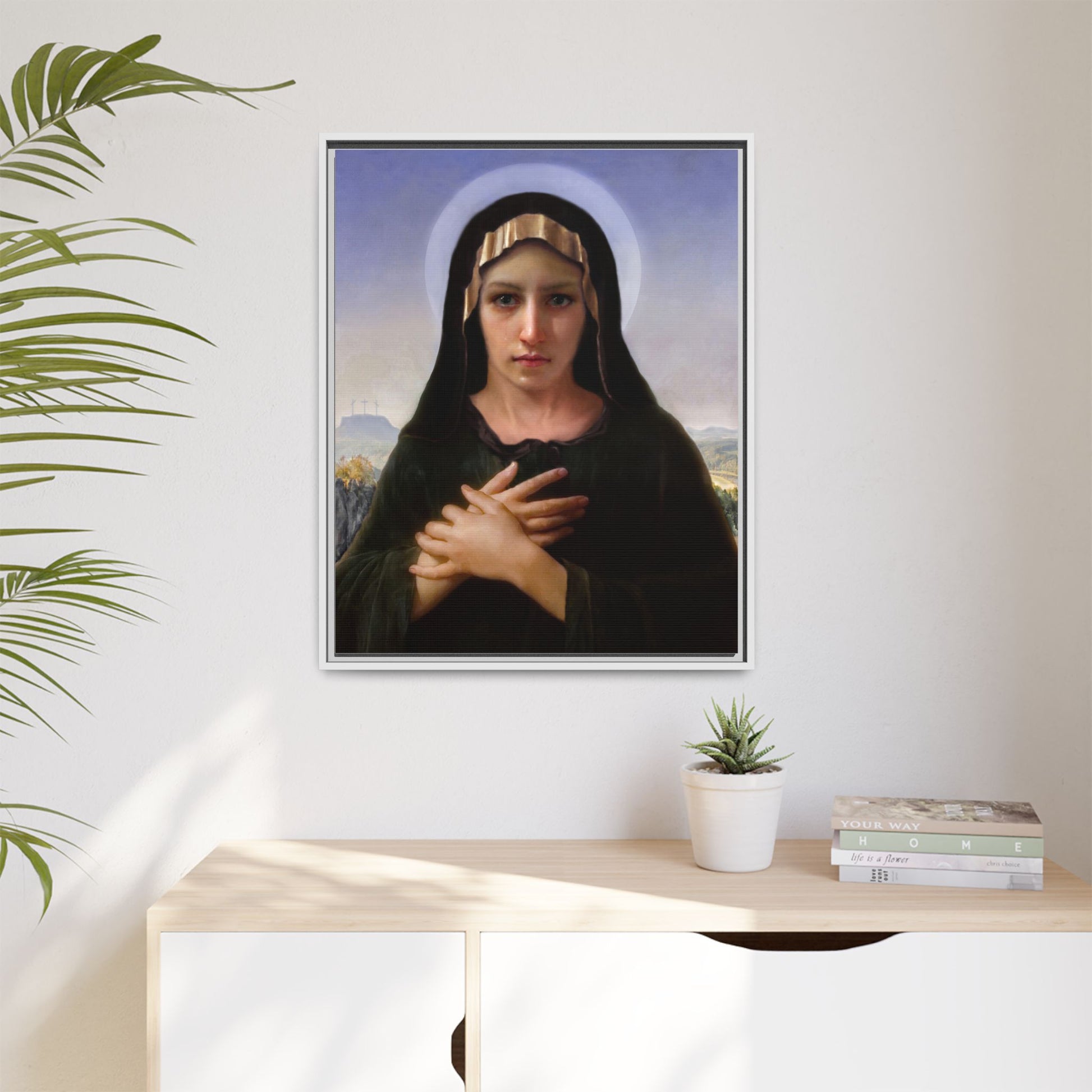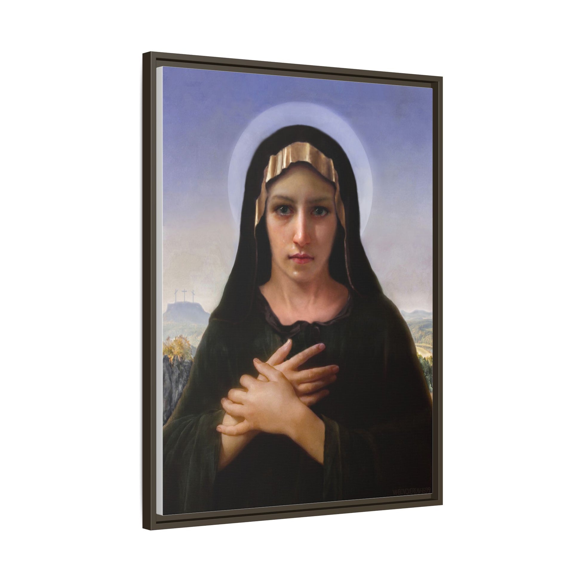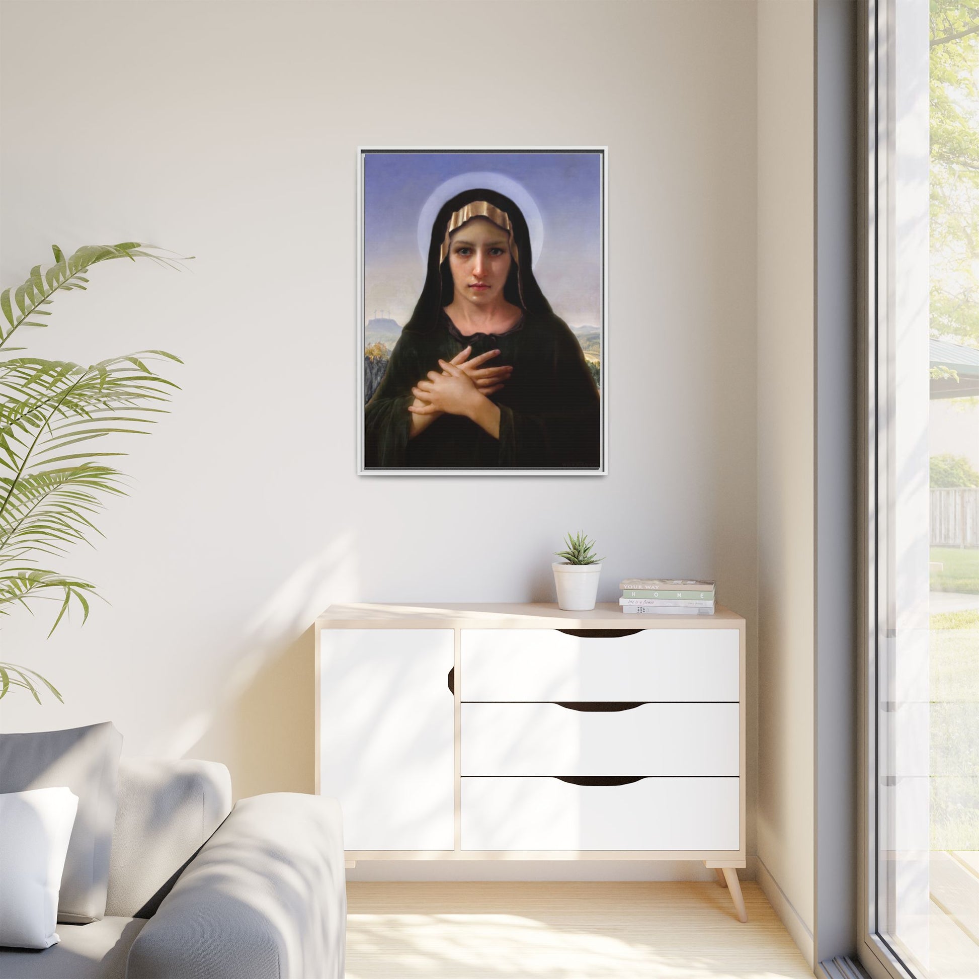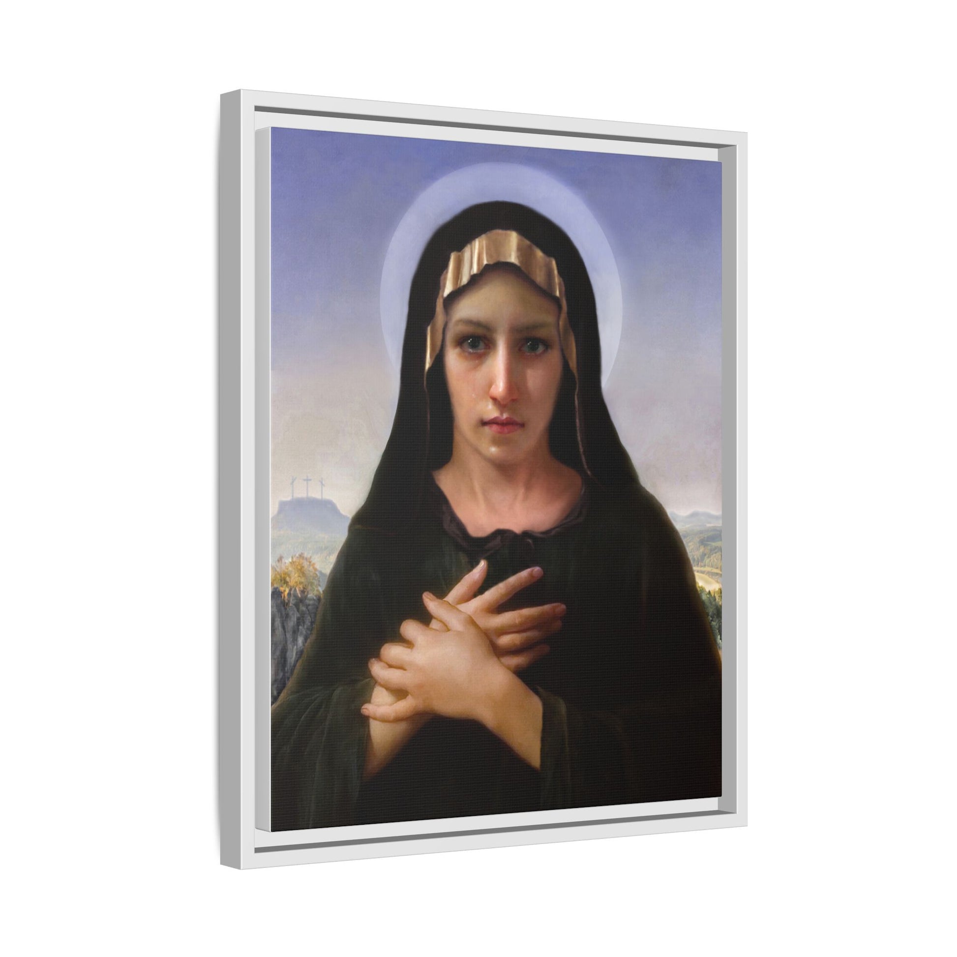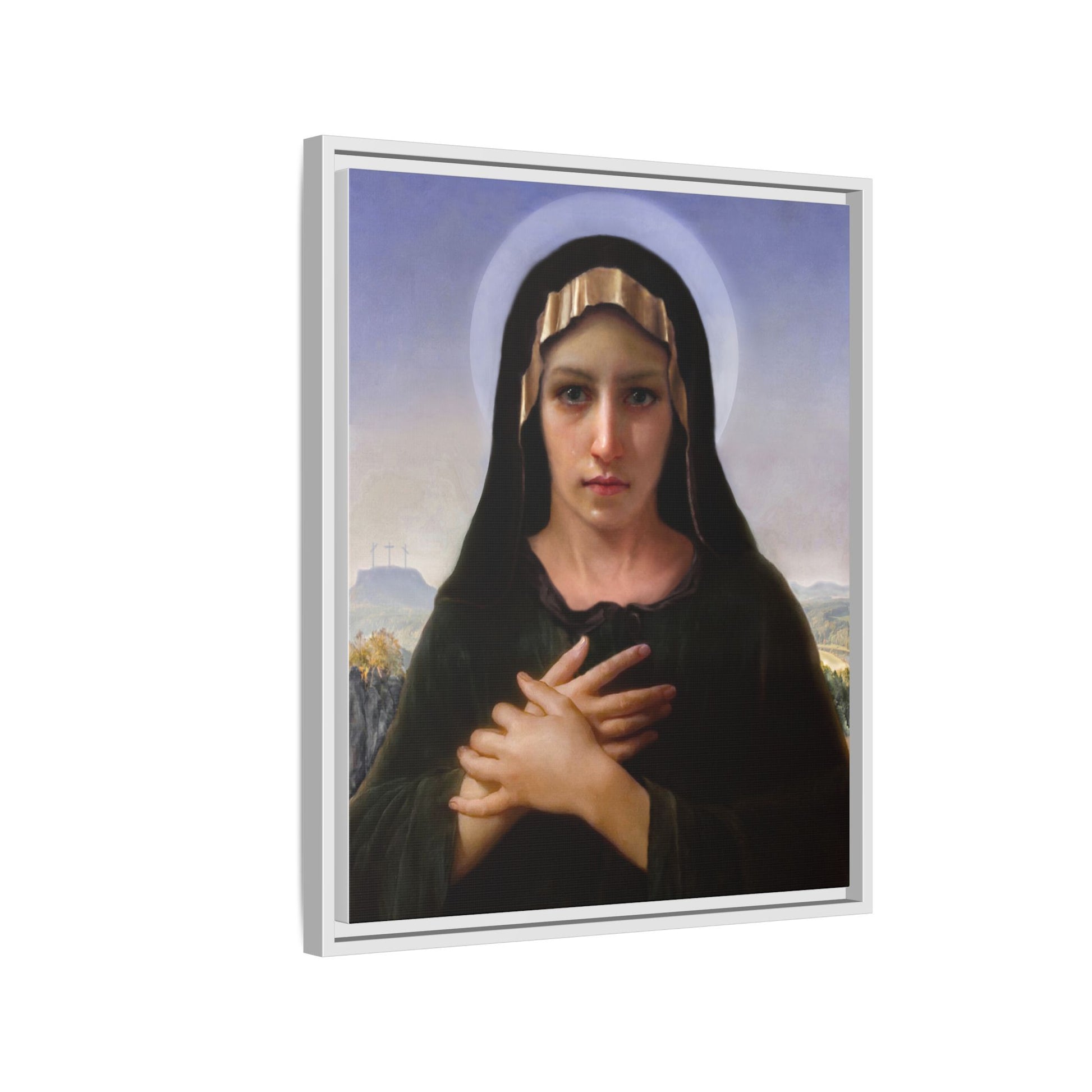A framed matte canvas print that brings quiet reverence to a room. The soft, painterly portrait sits on a deep-black pine frame that neatly floats the image from the wall, creating subtle depth and a museum-like presence. Colors stay rich and true thanks to advanced latex printing and a special canvas coating that keeps skin tones gentle and backgrounds luminous. Hang it in a meditation corner, entryway, or above a mantel to add a contemplative focal point that feels both vintage and freshly printed.