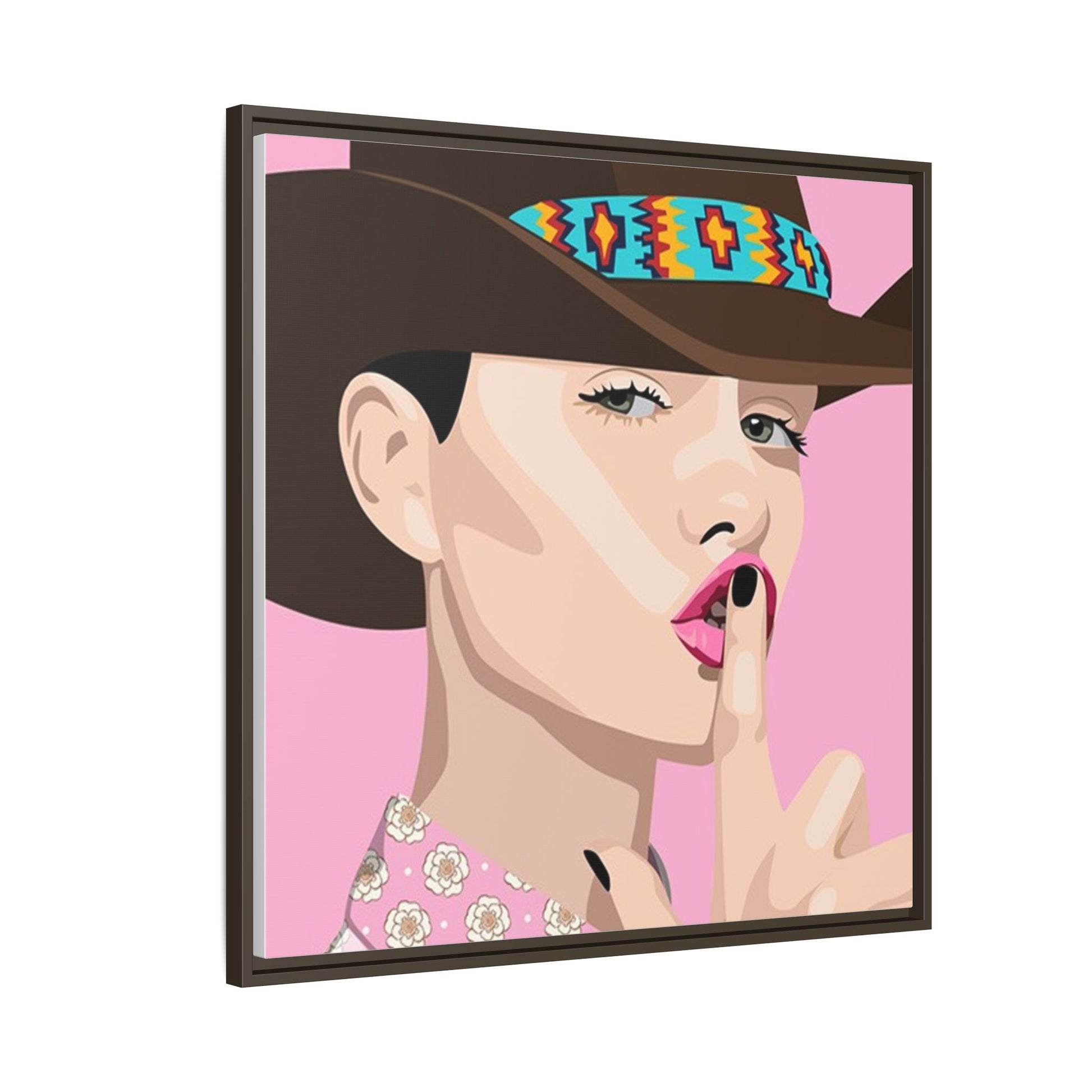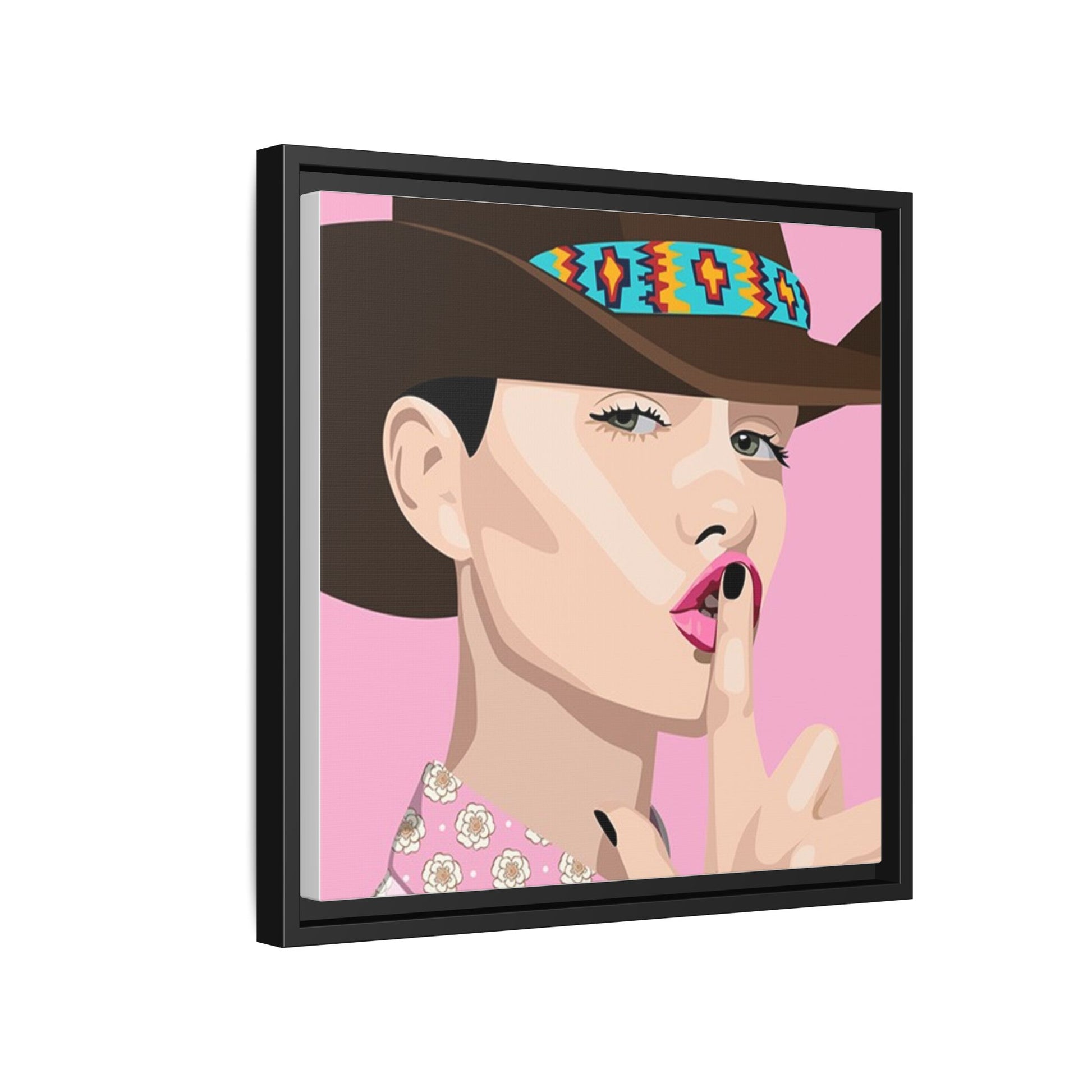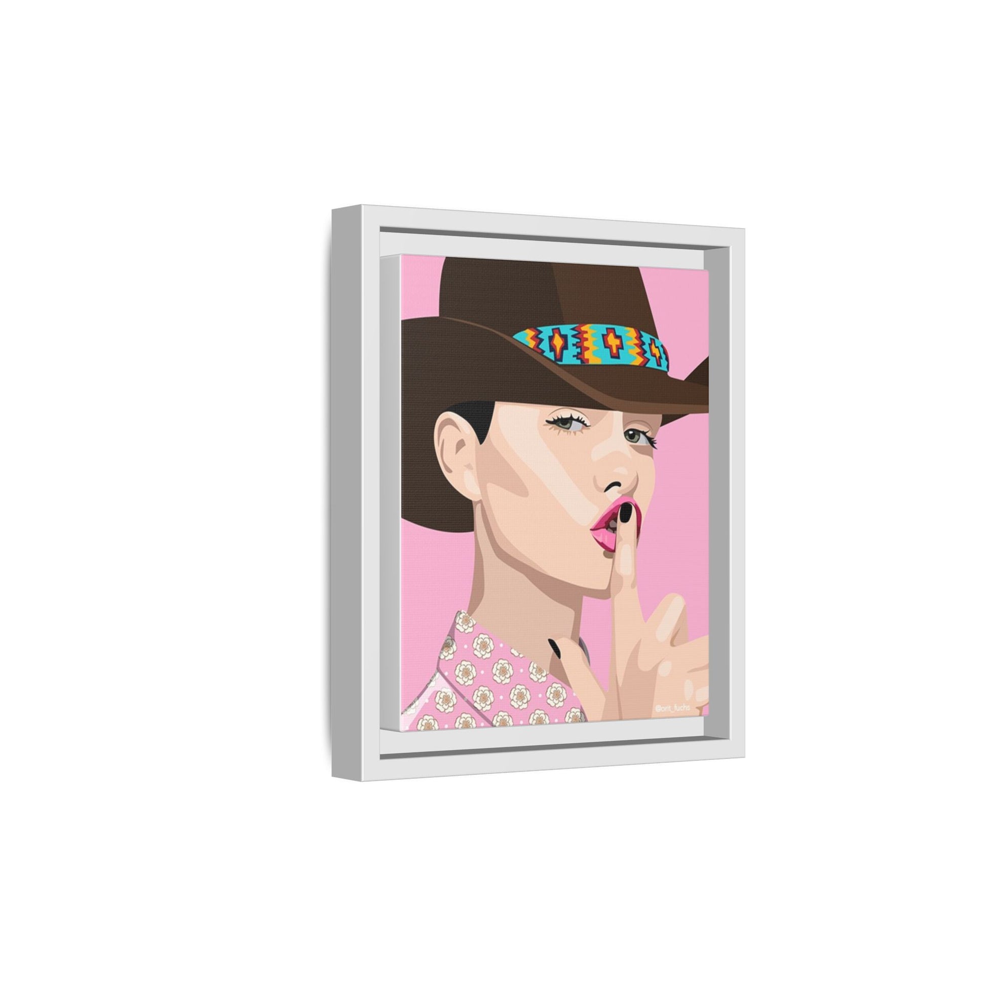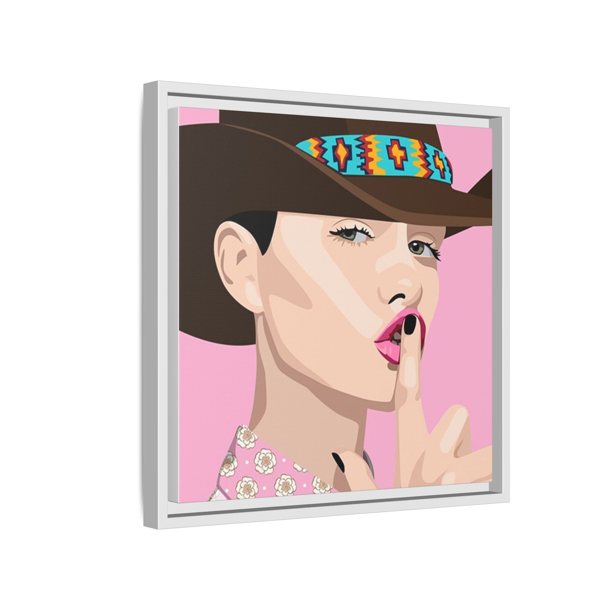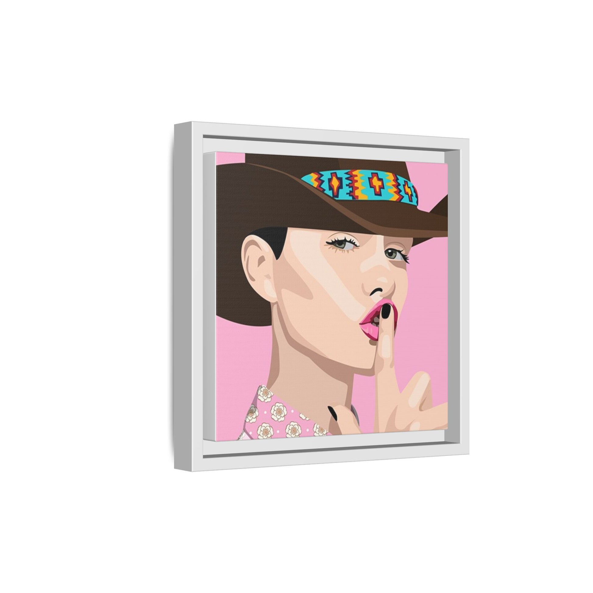 The artwork feels playful and a little secretive: a confident figure tipping a finger to her lips against a warm background. It suits someone who curates interiors with personality — collectors of contemporary pop illustration, makers who love color-forward décor, and anyone outfitting a studio, boutique, or bedroom with chic, tongue-in-cheek charm. Bring this framed matte canvas into a space to add a bright focal point that reads both modern and comfortable.