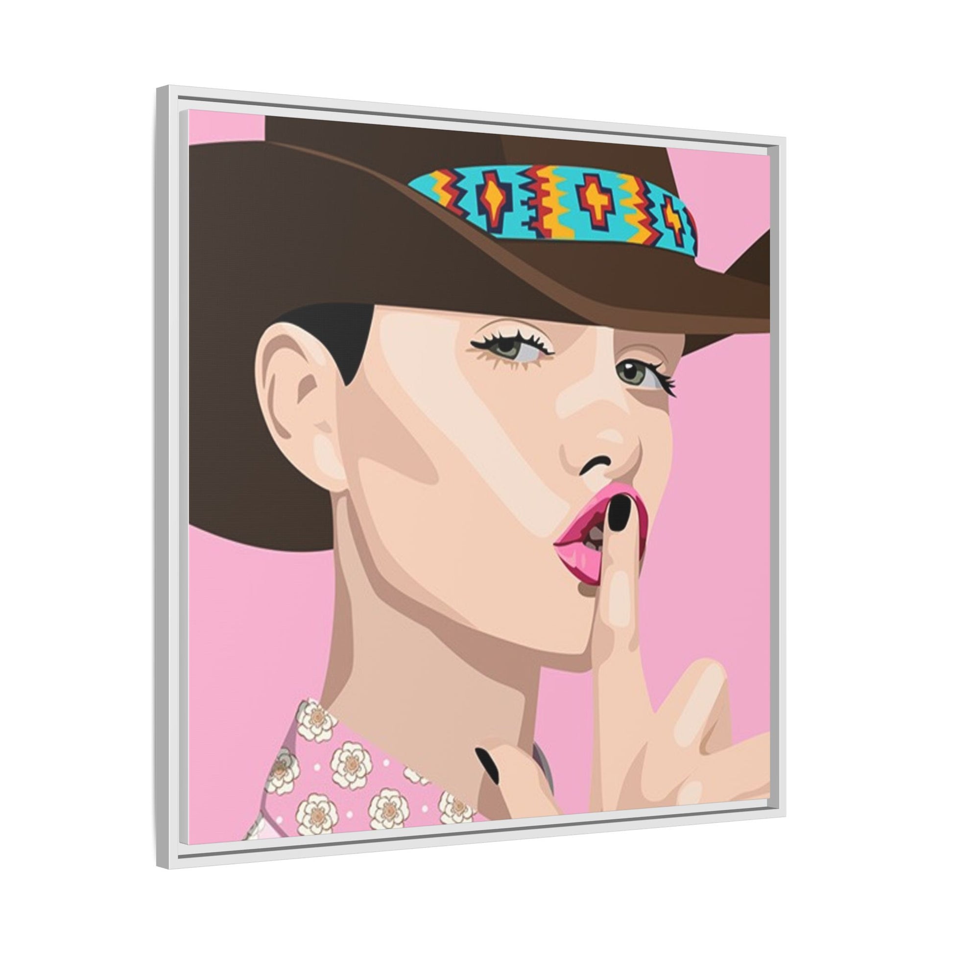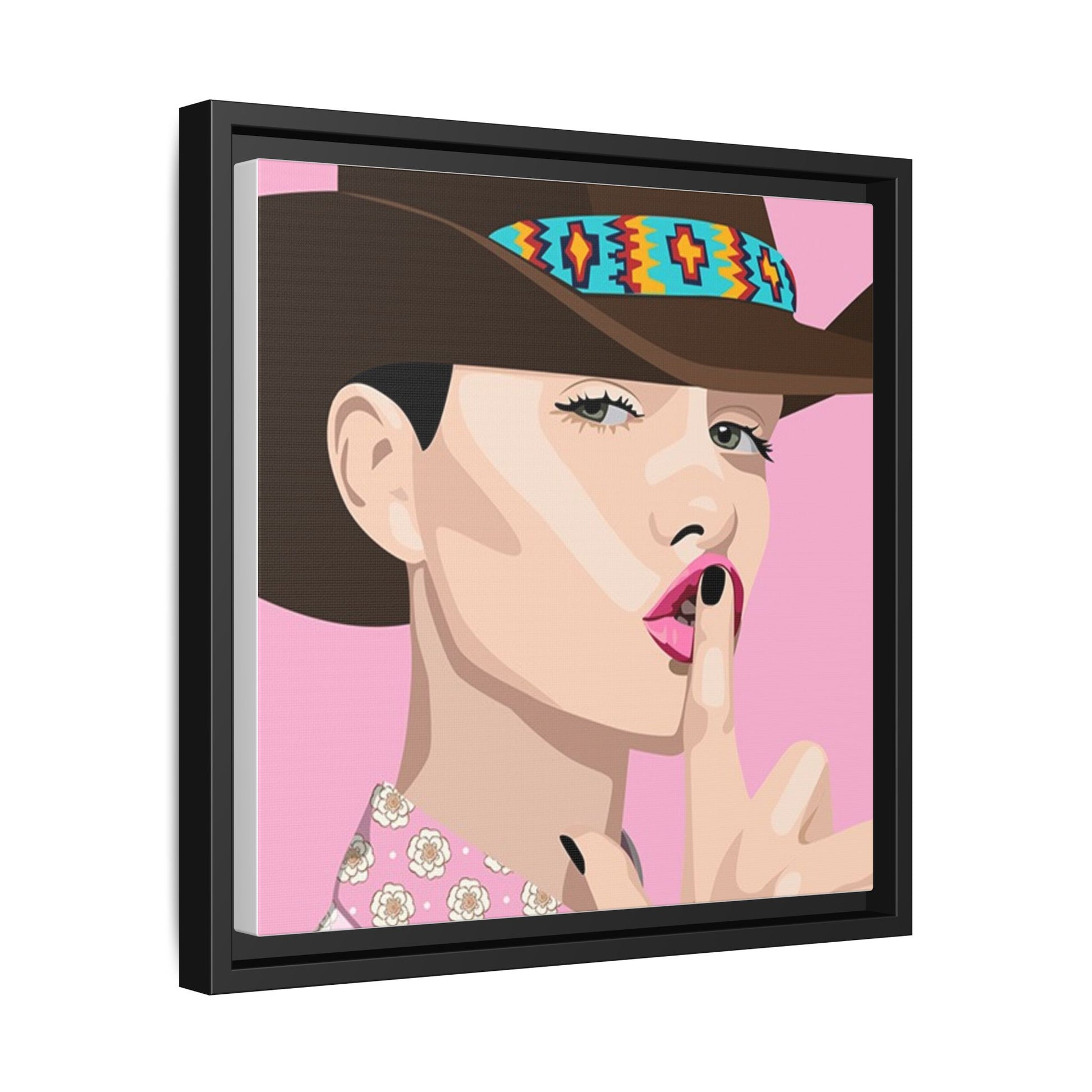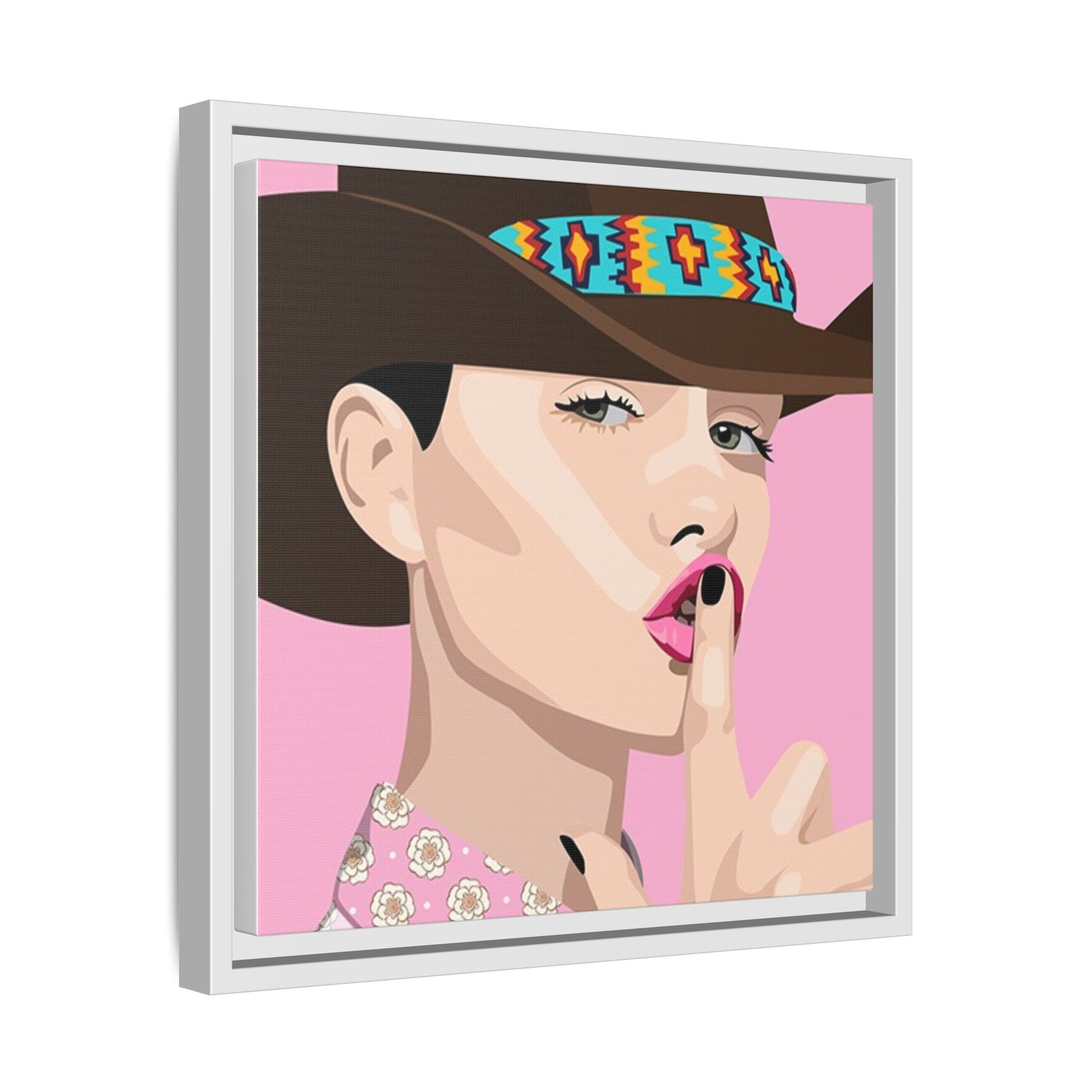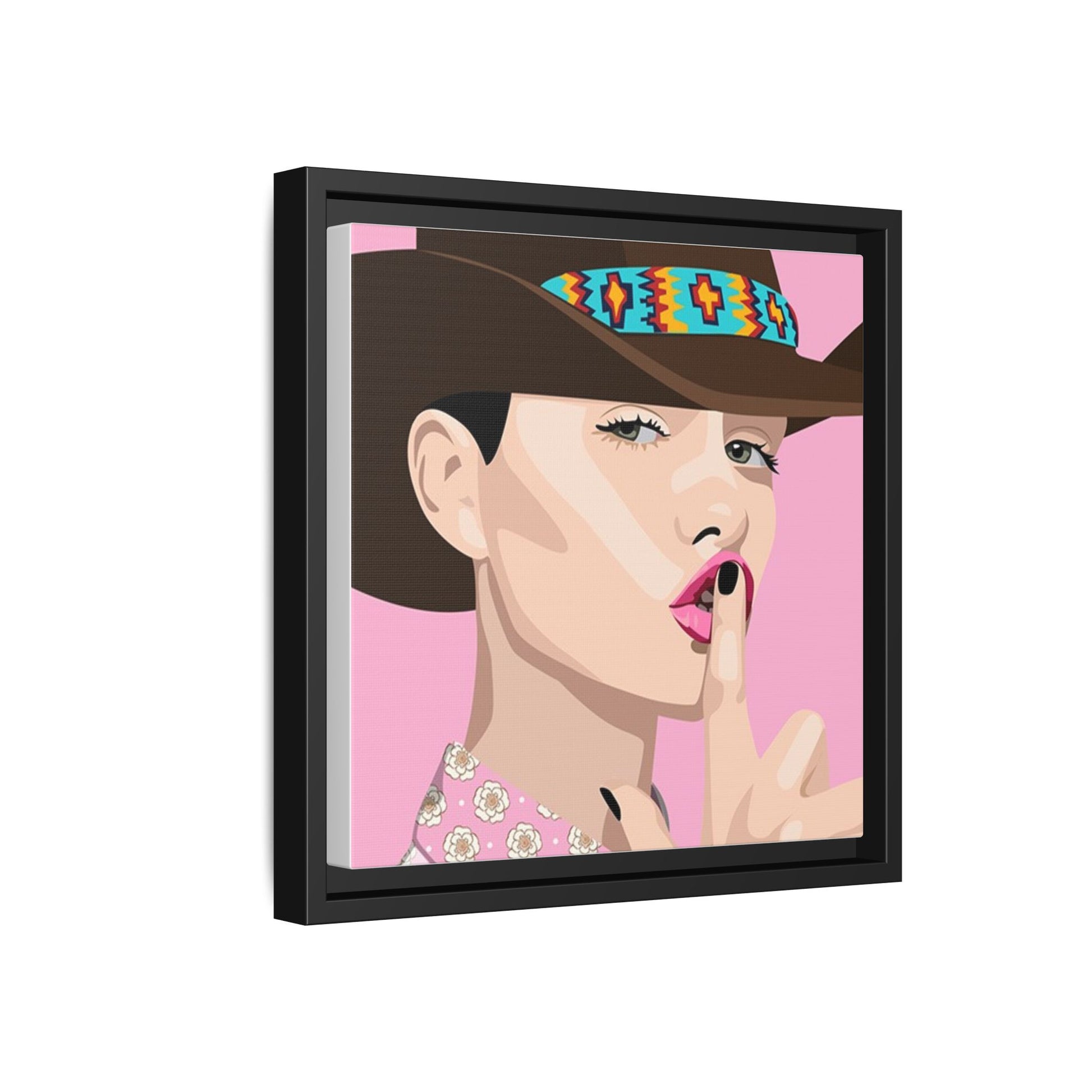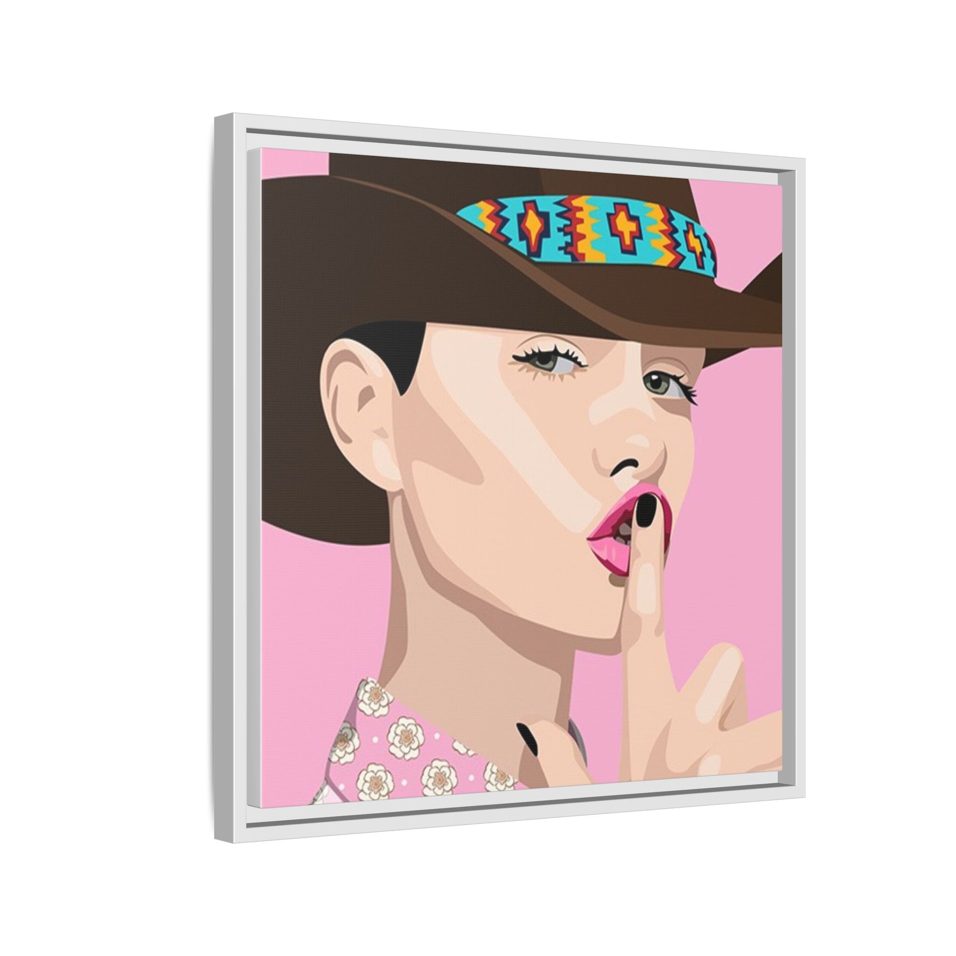 The artwork feels playful and a little secretive: a confident figure tipping a finger to her lips against a warm background. It suits someone who curates interiors with personality — collectors of contemporary pop illustration, makers who love color-forward décor, and anyone outfitting a studio, boutique, or bedroom with chic, tongue-in-cheek charm. Bring this framed matte canvas into a space to add a bright focal point that reads both modern and comfortable.