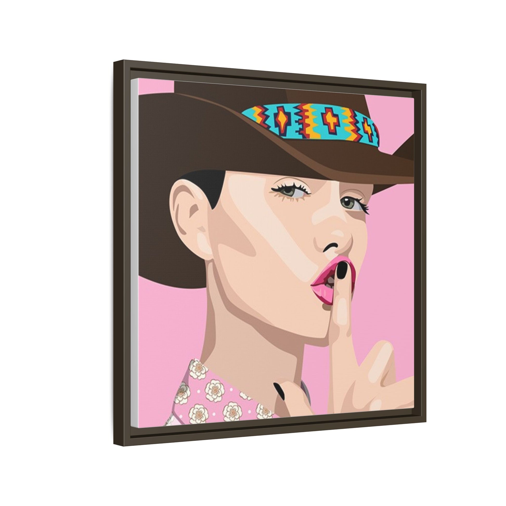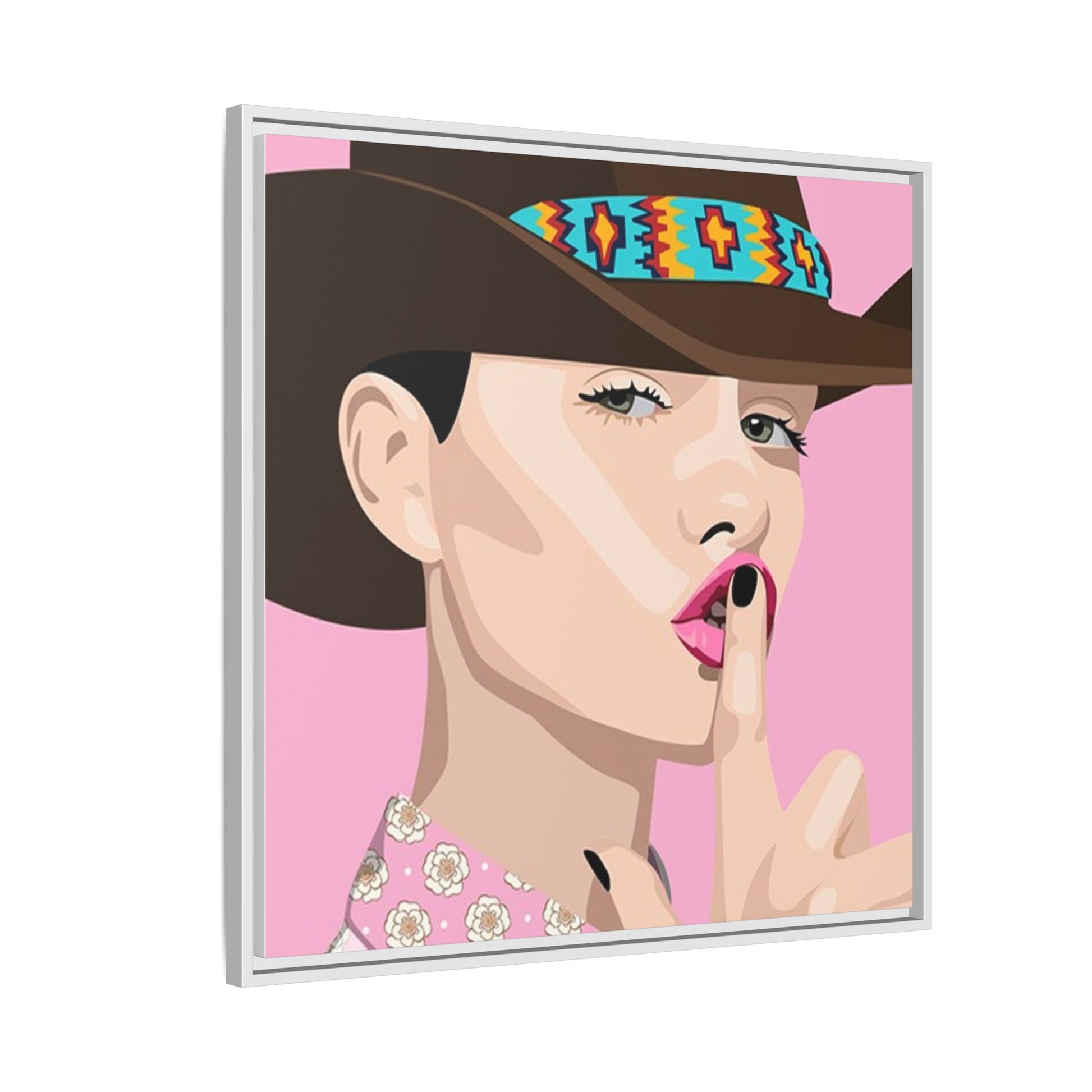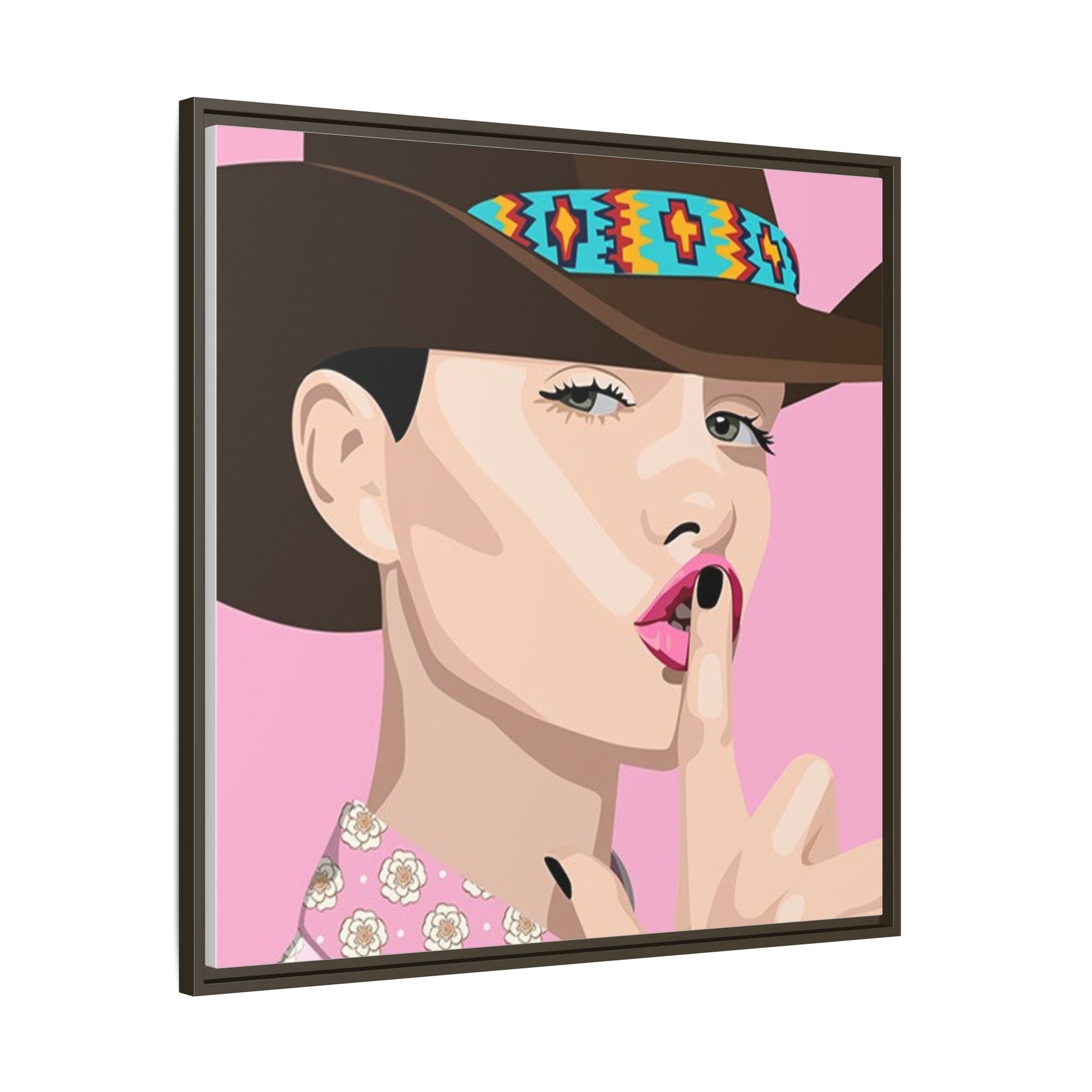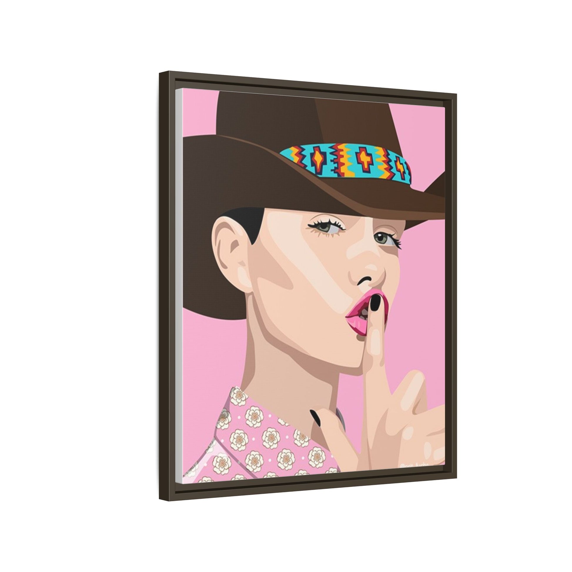 The artwork feels playful and a little secretive: a confident figure tipping a finger to her lips against a warm background. It suits someone who curates interiors with personality — collectors of contemporary pop illustration, makers who love color-forward décor, and anyone outfitting a studio, boutique, or bedroom with chic, tongue-in-cheek charm. Bring this framed matte canvas into a space to add a bright focal point that reads both modern and comfortable.