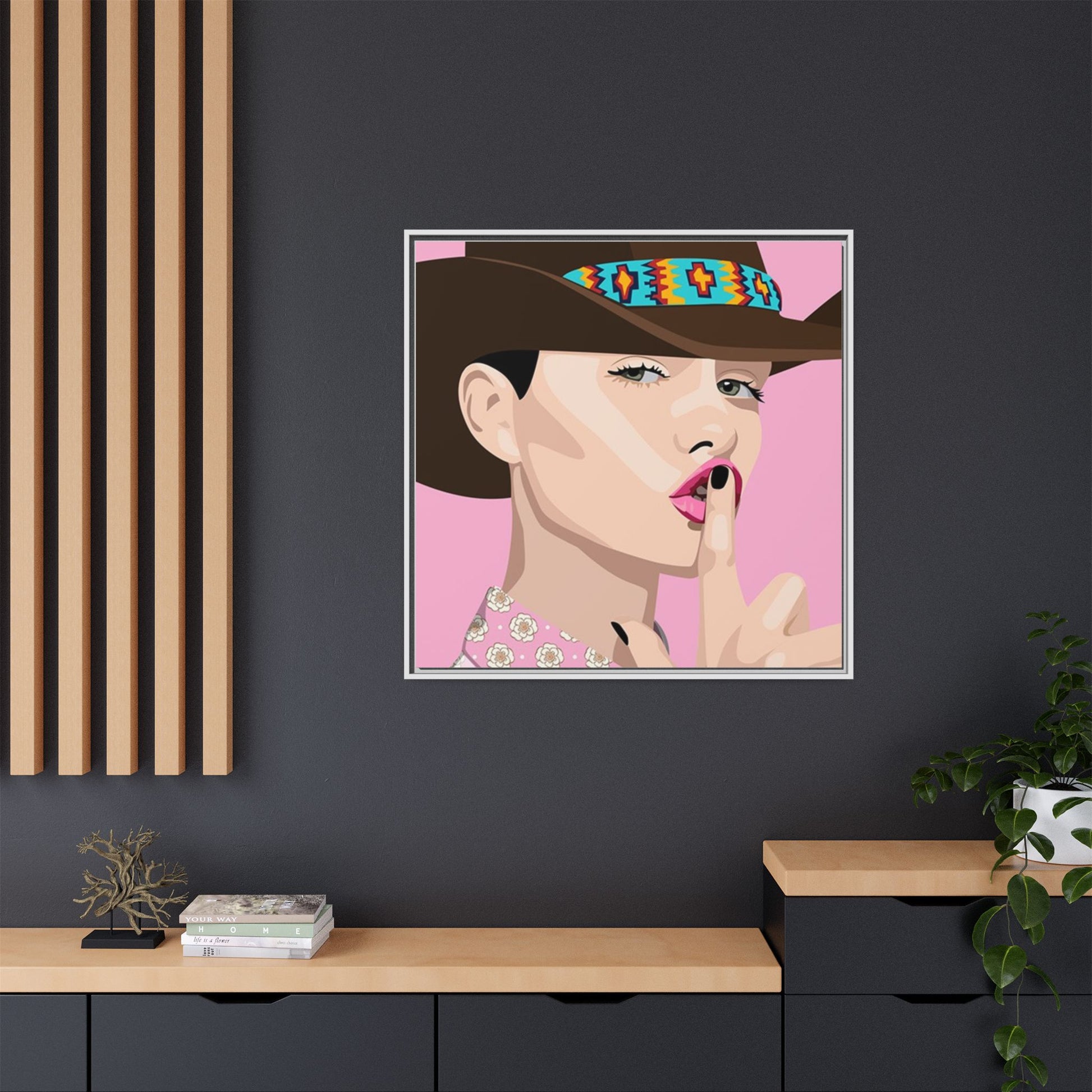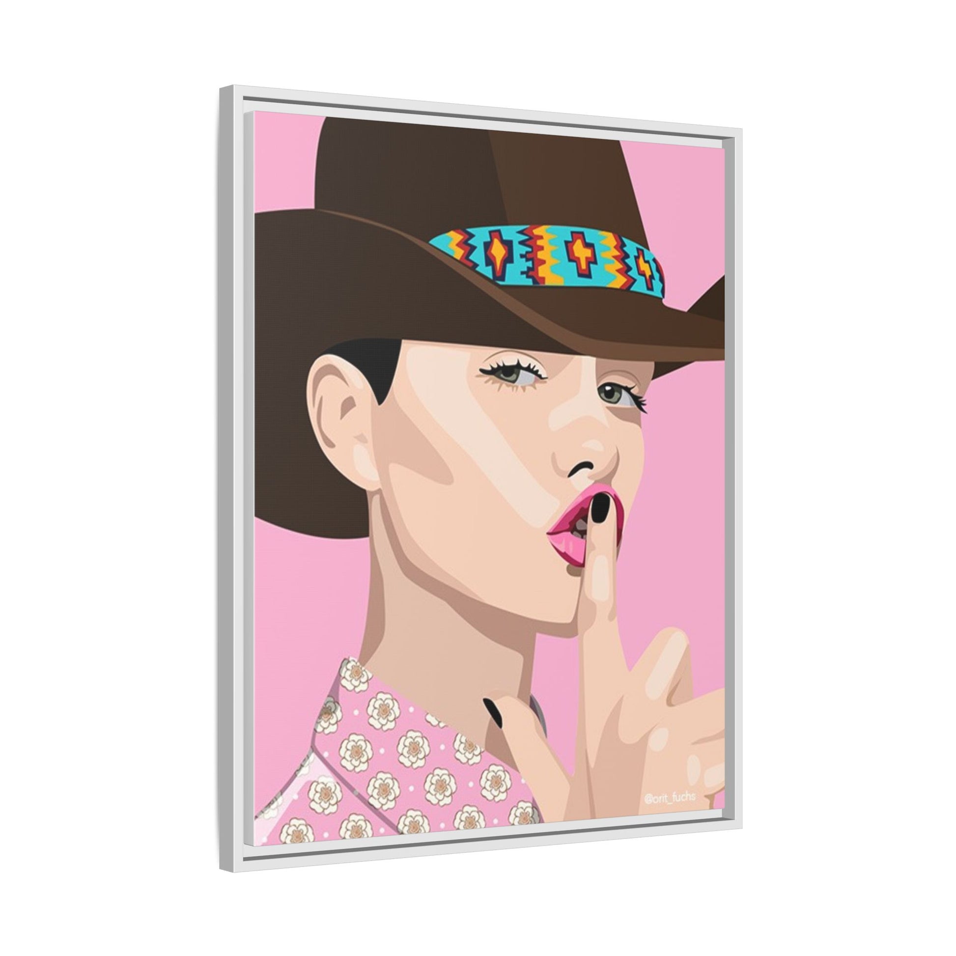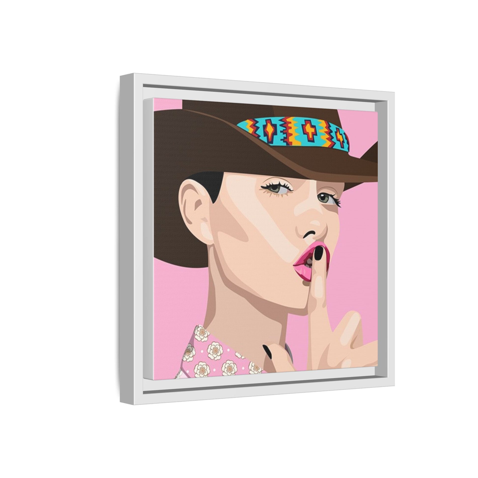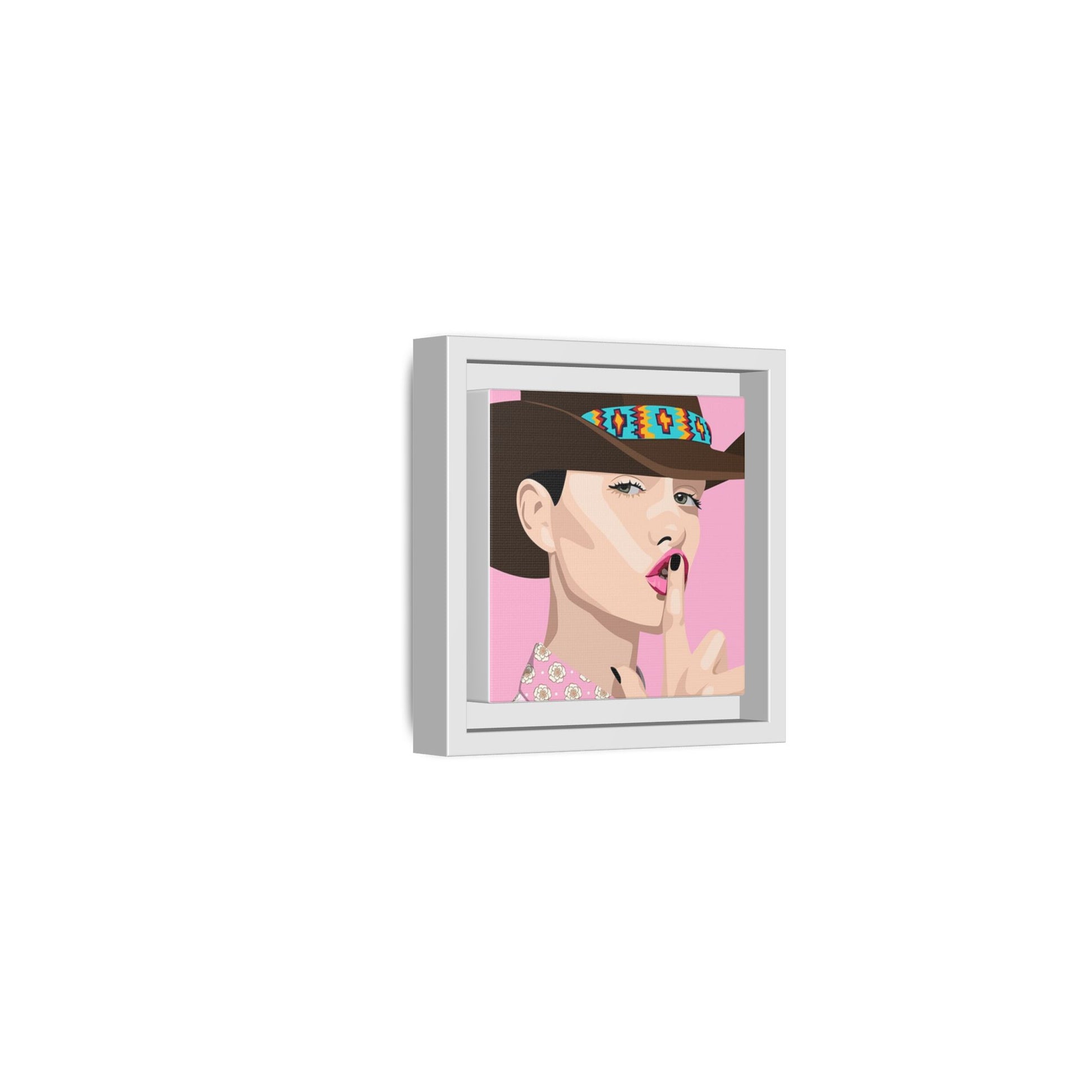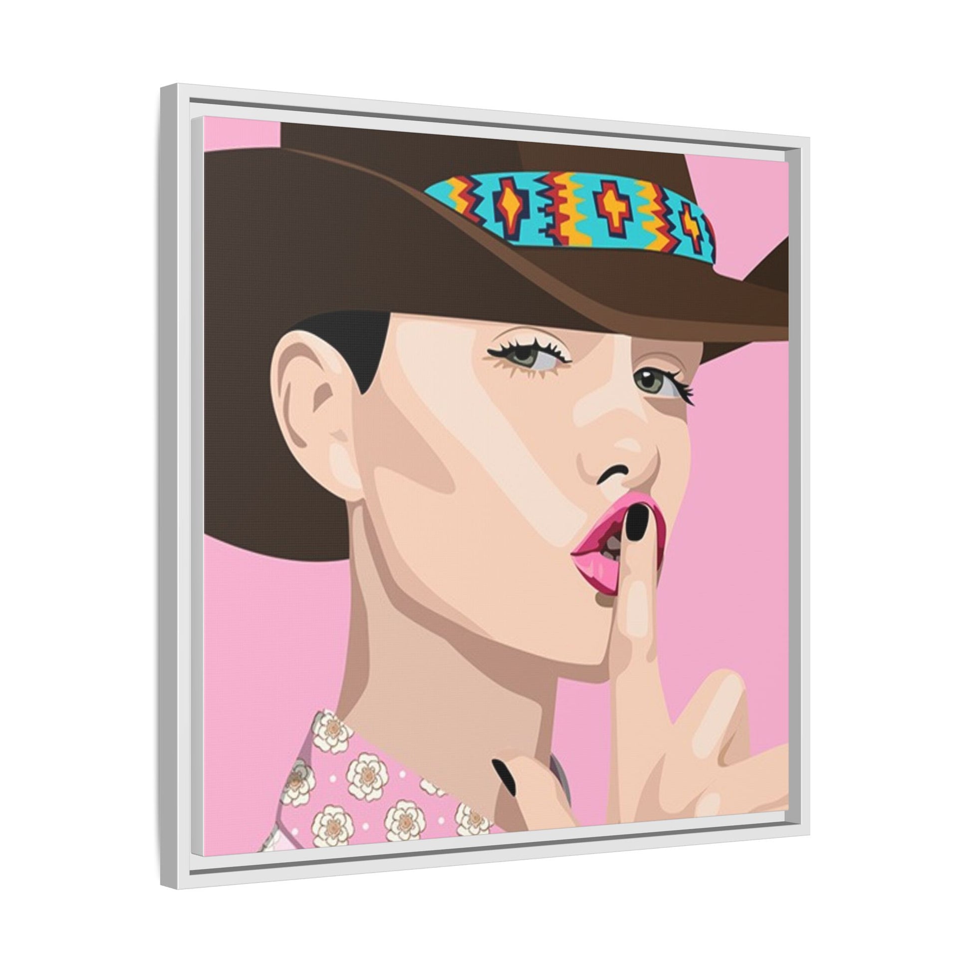 The artwork feels playful and a little secretive: a confident figure tipping a finger to her lips against a warm background. It suits someone who curates interiors with personality — collectors of contemporary pop illustration, makers who love color-forward décor, and anyone outfitting a studio, boutique, or bedroom with chic, tongue-in-cheek charm. Bring this framed matte canvas into a space to add a bright focal point that reads both modern and comfortable.