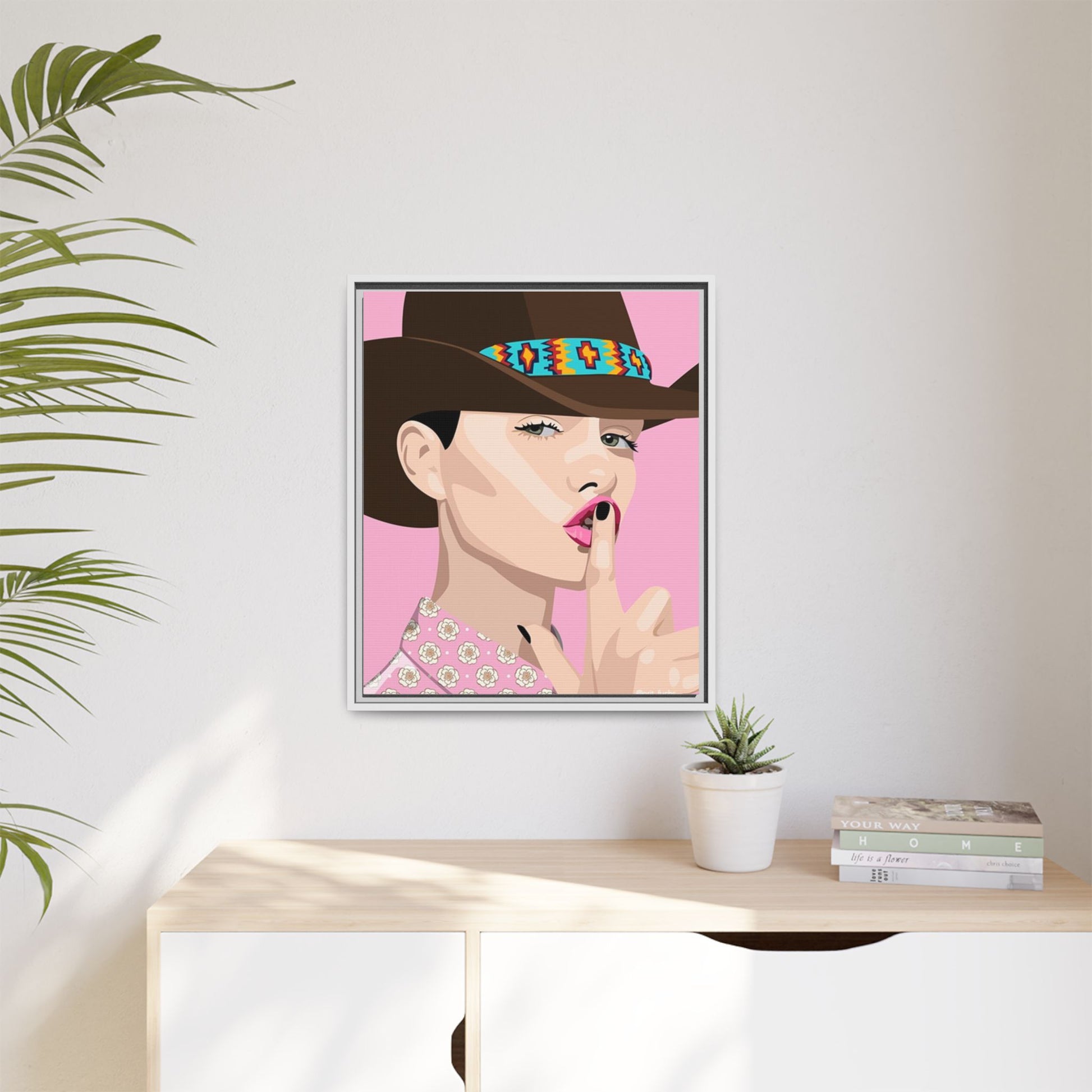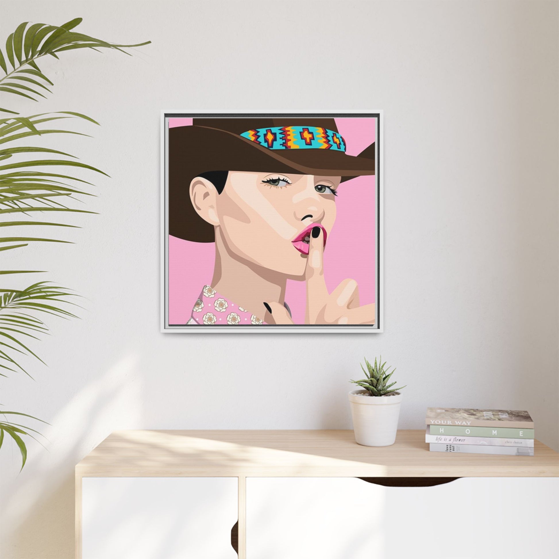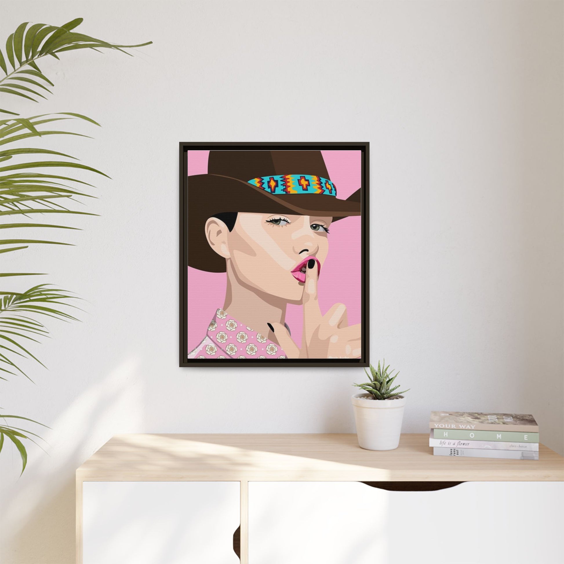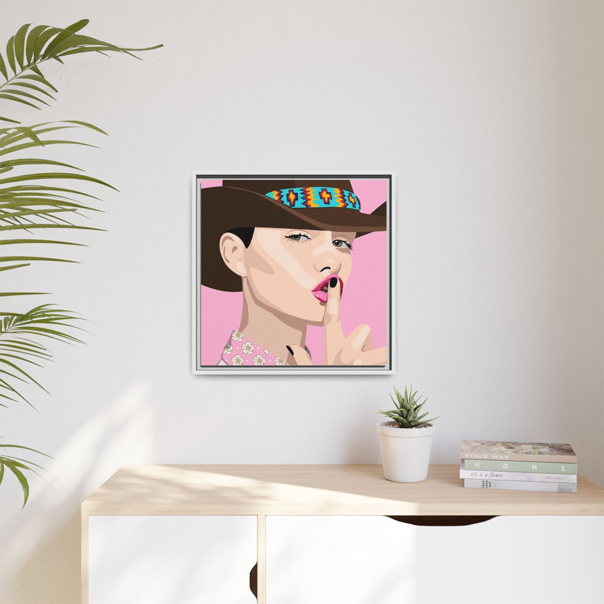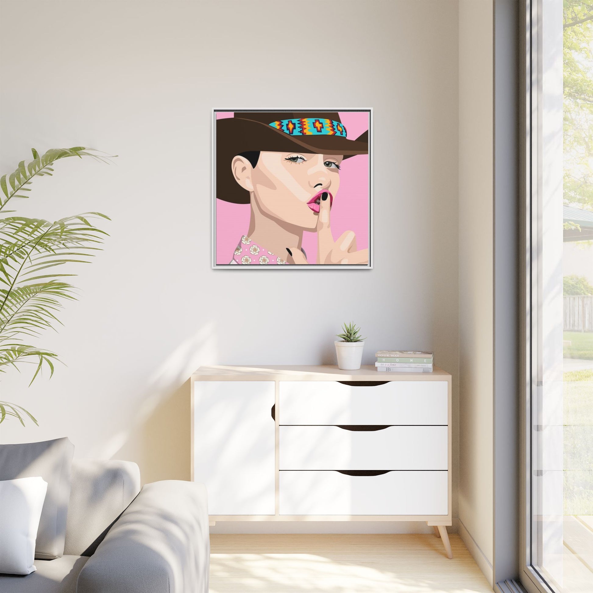 The artwork feels playful and a little secretive: a confident figure tipping a finger to her lips against a warm background. It suits someone who curates interiors with personality — collectors of contemporary pop illustration, makers who love color-forward décor, and anyone outfitting a studio, boutique, or bedroom with chic, tongue-in-cheek charm. Bring this framed matte canvas into a space to add a bright focal point that reads both modern and comfortable.
