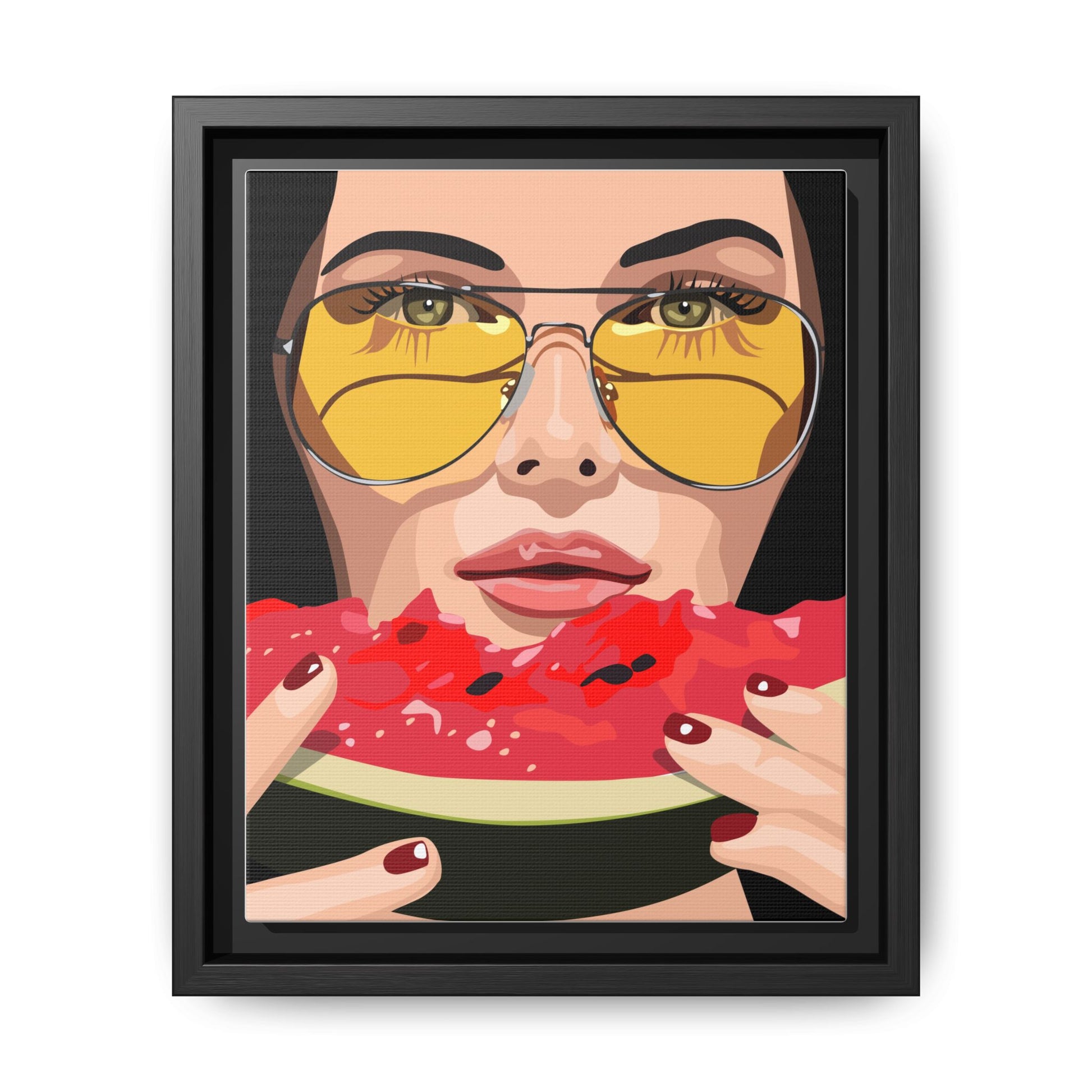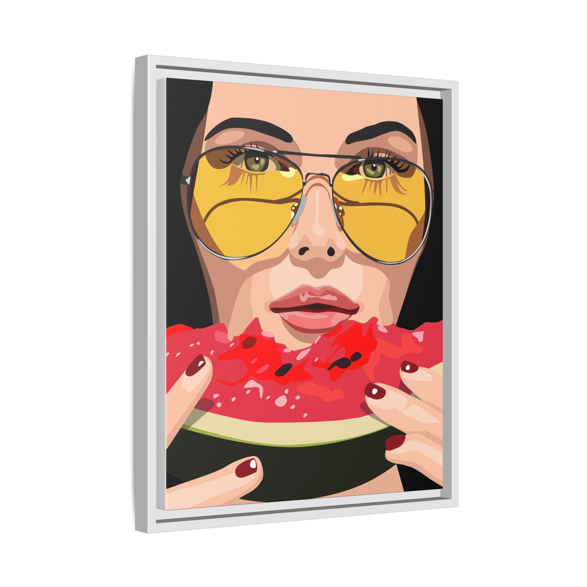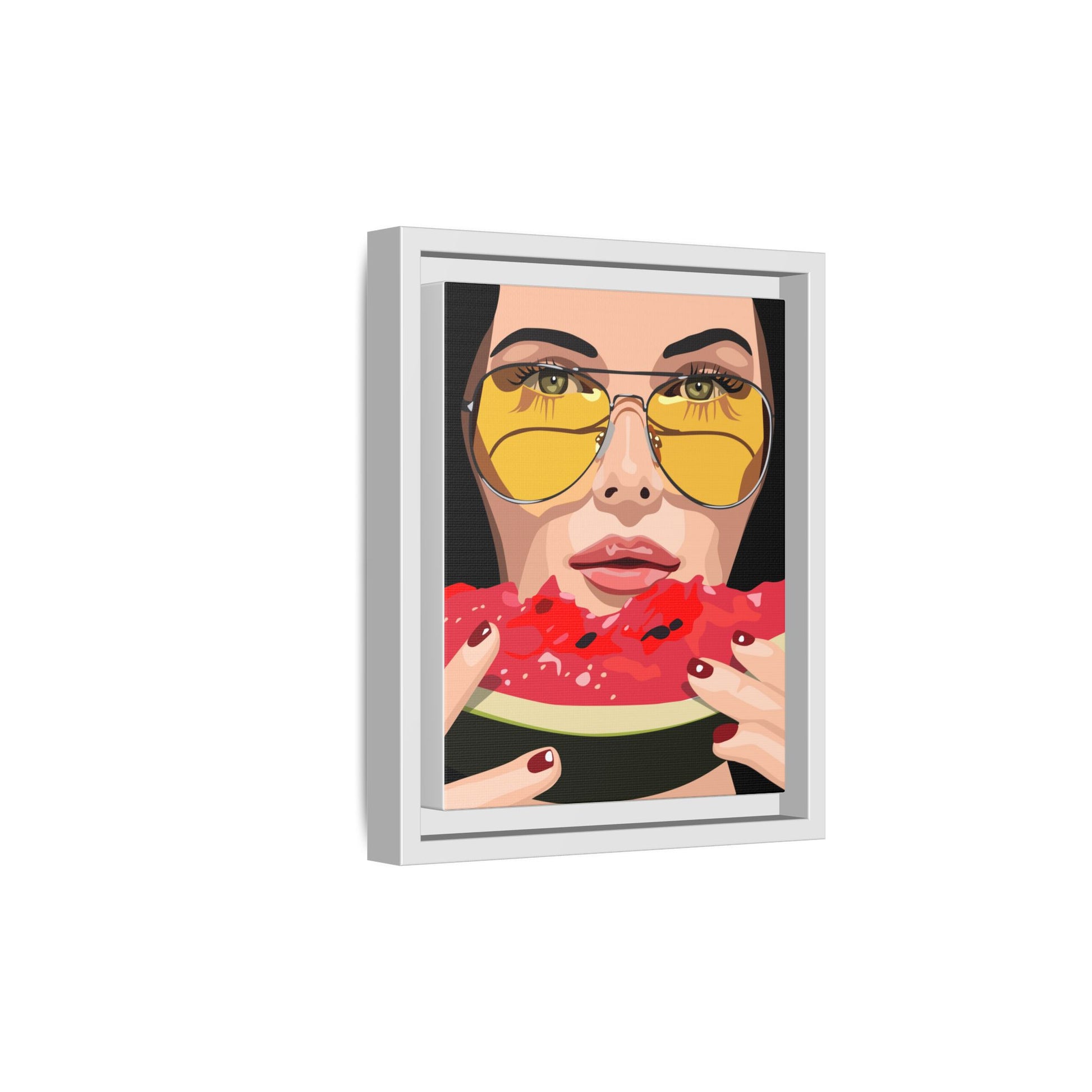 This framed matte canvas brings bold, modern pop-art into your space with sunlit color and a playful edge. The image of a woman in yellow-tinted sunglasses biting into a vivid slice of watermelon feels lively and immediate — like a summer memory paused on the wall. The matte finish softens glare while keeping the saturated hues crisp, and the slim pine frame adds a clean, gallery-ready border that slips effortlessly into living rooms, kitchens, studios, or trendy office nooks. Hang it horizontal, vertical, or square to suit your layout; the included sawtooth hardware makes placement simple. For anyone who loves bold color, retro-inspired style, and a touch of everyday glamour, this canvas becomes a conversation starter and a visual mood boost.
