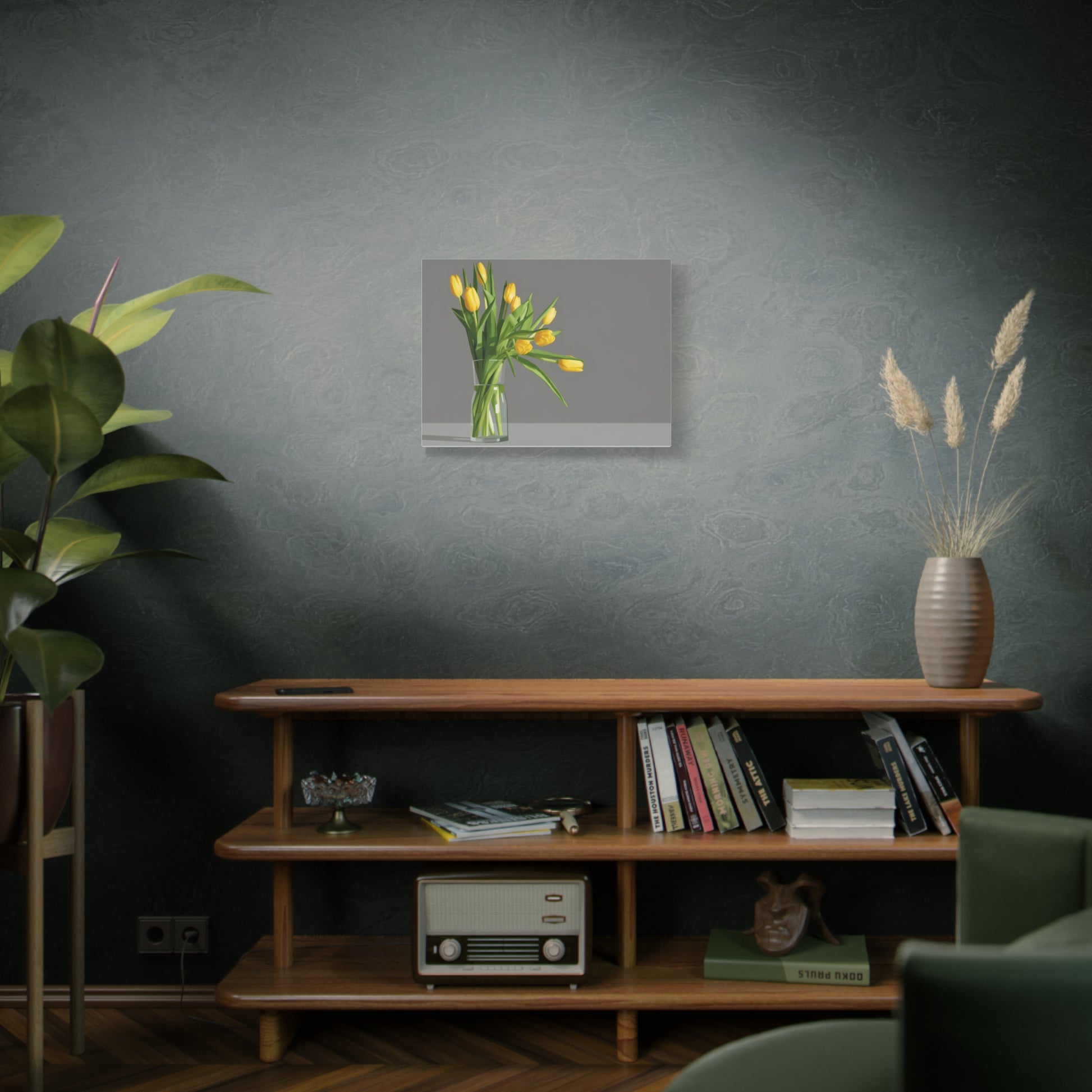 A softly modern stretched canvas that brings a quiet, fresh moment into any room. Bright yellow tulips float in a clear vase against a cool grey field, rendered with clean edges and crisp color thanks to a proprietary high-quality coating and UL-certified Greenguard Gold inks. The 1.25" pine profile adds subtle depth on the wall while remaining lightweight and easy to hang. This piece feels like a breathed-out pause — the kind of artwork that settles into kitchen nooks, small living rooms, or a tranquil office and quietly lifts the mood with uncomplicated elegance.