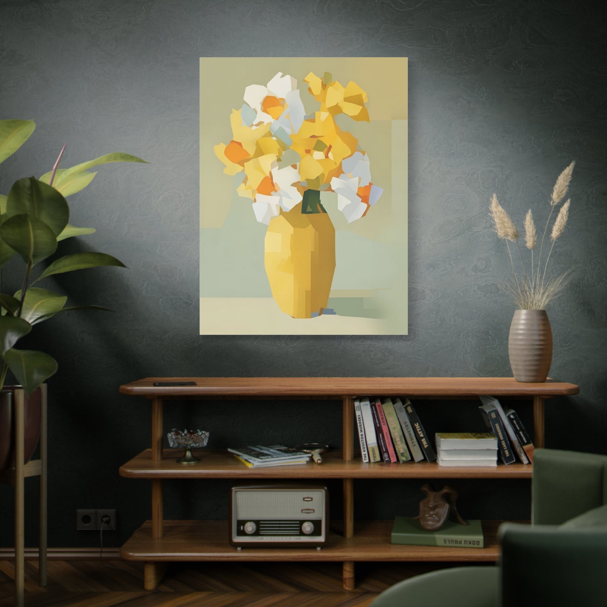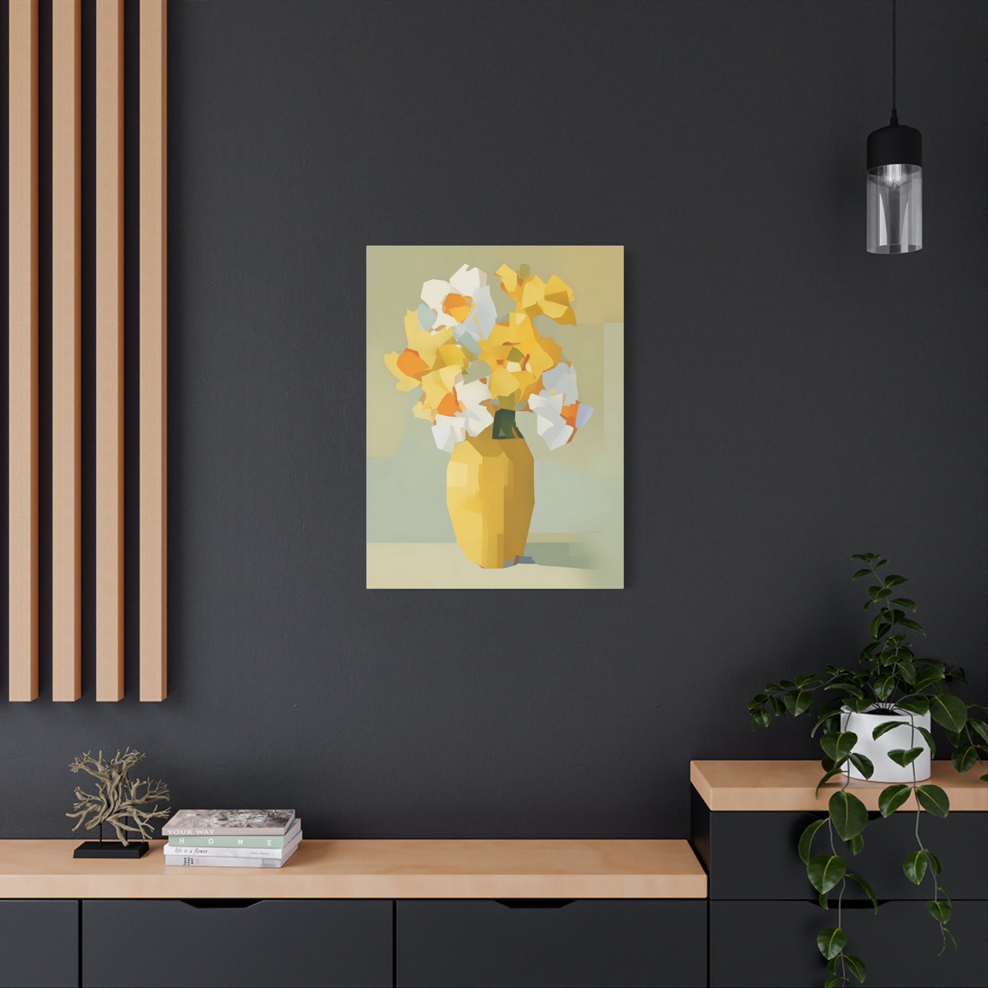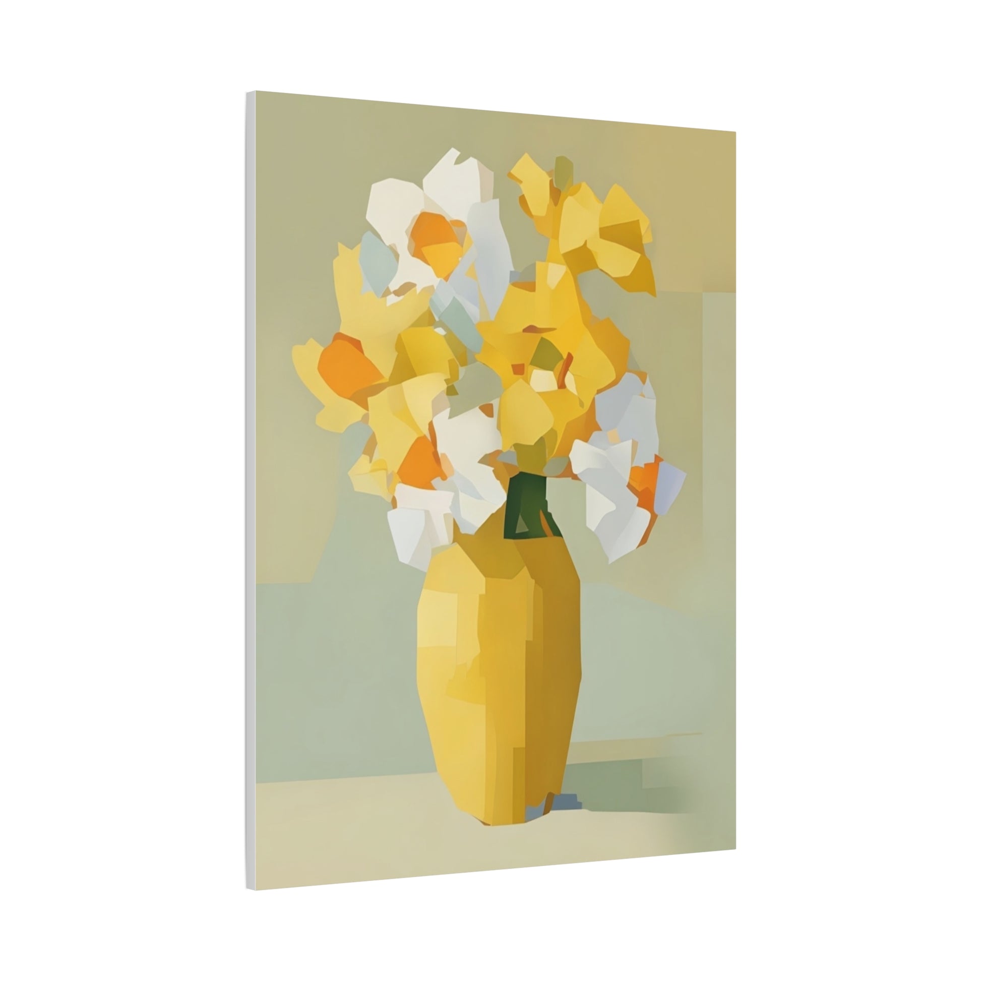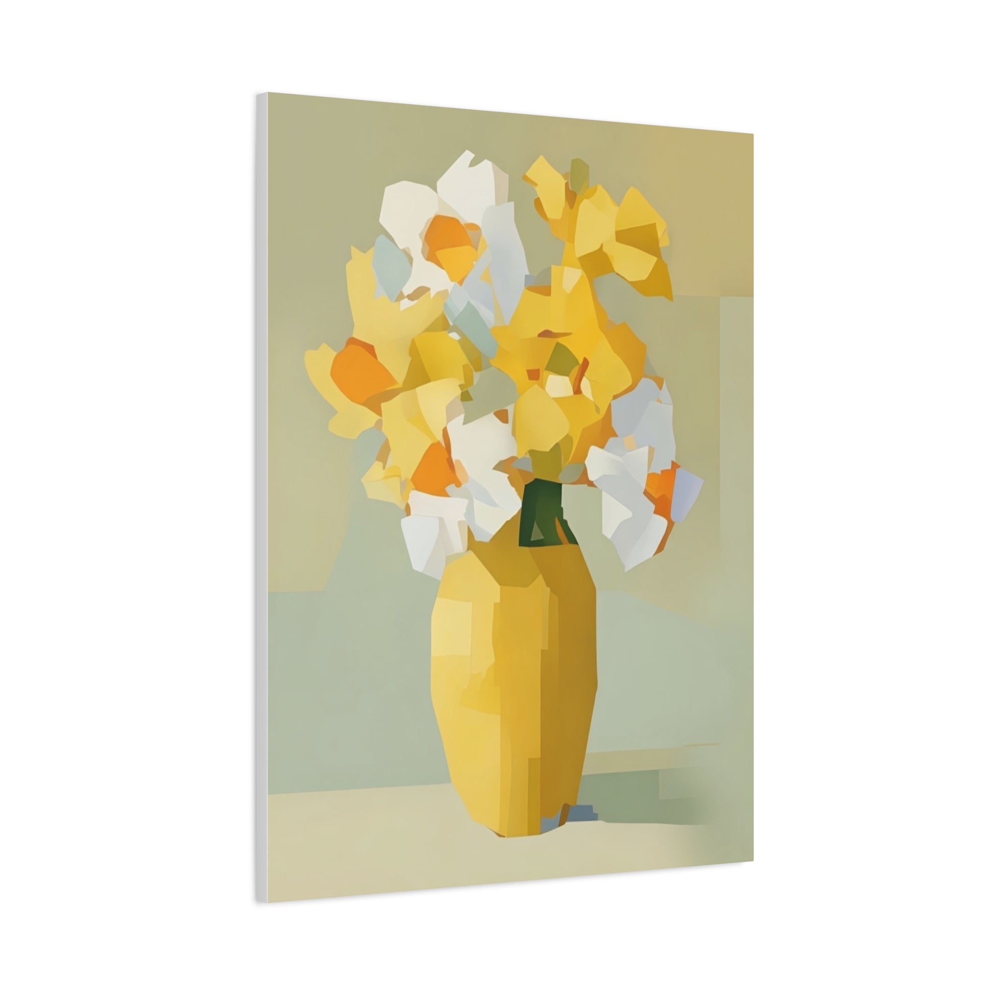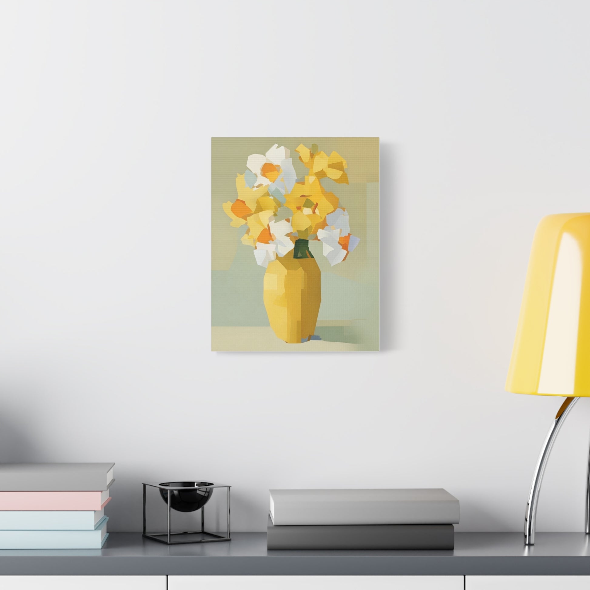 Bright, modern canvas art that brings a calm, sunlit corner to life. This stretched matte canvas shows a faceted bouquet in warm yellows and soft neutrals, printed with UL-certified Greenguard Gold inks for vivid, lasting color. The slim 1.25" profile sits close to the wall and includes a back-hanging bracket and soft rubber dots to keep the piece steady. Hand-stretched over sustainably sourced radiata pine, the piece reads as both contemporary and cozy — an easy way to warm a kitchen nook, entryway, or reading corner with painterly, geometric blooms.